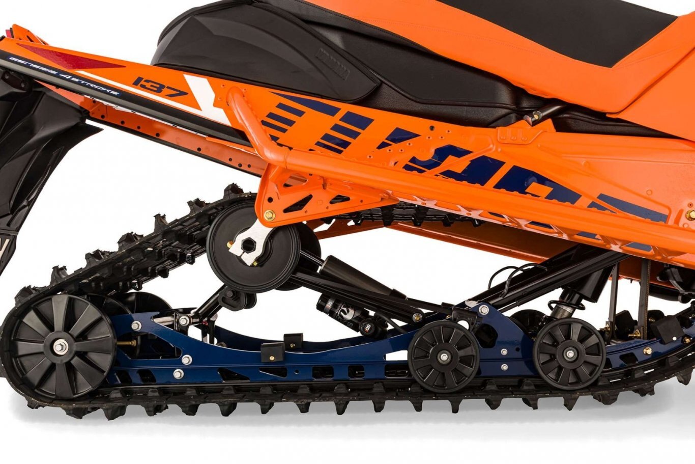 The SRX utilizes special suspension calibration with dual rate front shock springs, and low preload rear torsion springs to provide a lower ride height through additional suspension 'sag'. The lower profile enhances top speed performance while helping keep the sled level in tight corners. The softer initial spring rates are consequently more progressive, ramping up deeper in the stroke to resist harsh bottoming while full travel is still available when unweighted. The SR 137 skid remains a “coupled” suspension that utilizes a unique “sliding” front arm mount. With up to half-inch of movement at the front arm “slot”, the system allows the SR 137 to deliver controlled (reduced) ski-lift during acceleration while still retaining front arm bump compliance. The solid rear axle design and large diameter rear wheels provide maximum strength while special front idler wheel layout increases clearance for iQS, plus reduces friction, for greater durability and performance .