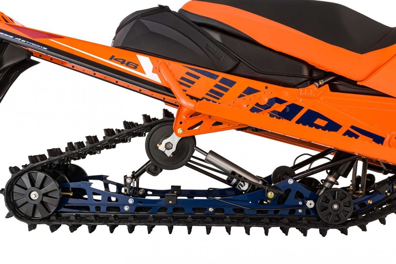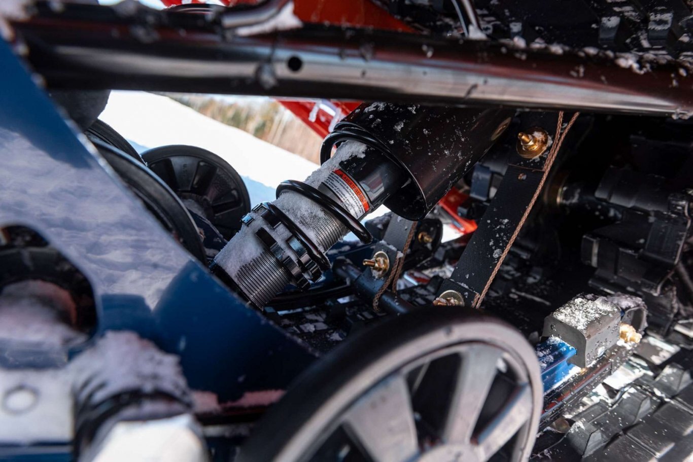 The Dual Shock 146 rear suspension is fitted into a light mountain, tapered tunnel. It also features a mountain style front arm with special 146 inch rails that utilize a long rear QS3 shock with a lightweight single pull rod. A unique design, shock pivot is added to the uncoupled front arm to provide smooth transfer for great handling both in and out of the powder.
