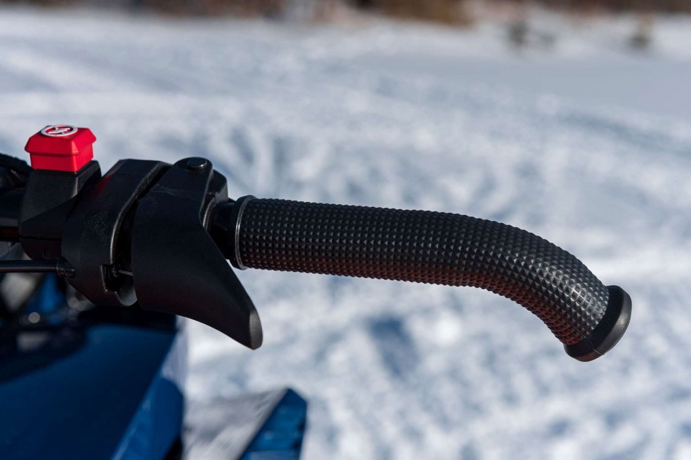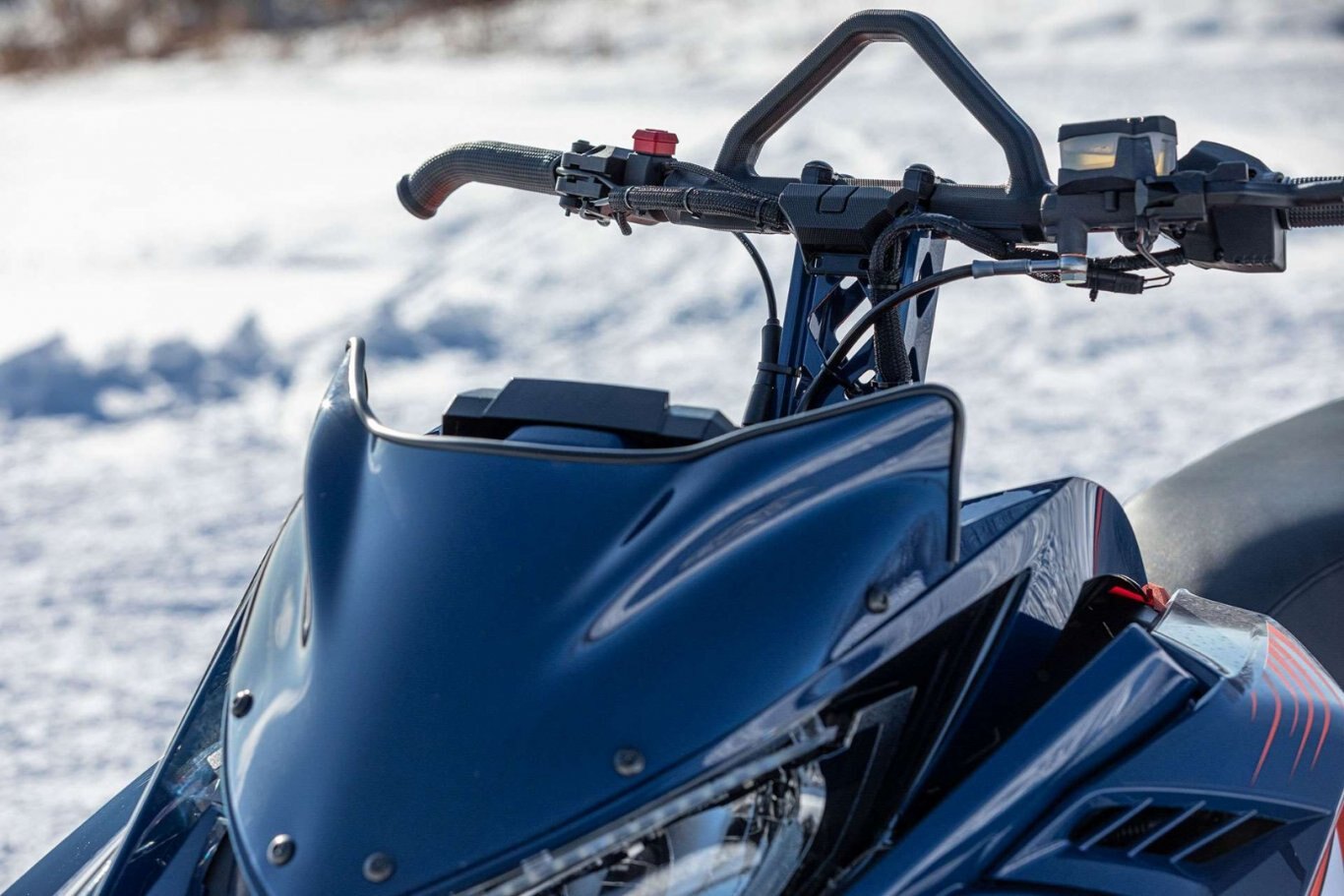 The handle bar controls feature a left hand switch cluster which allows for 'on the fly' access to the multi-step hand and thumb warmer adjusters. Information available on the multi-function gauge can be easily selected with a convenient toggle switch and the push button reverse gear switch is also located in the left hand cluster. The right side of the bar is clean with an ergonomically shaped throttle lever and simple, stand-alone emergency stop switch. The Hayes 'Stealth' brake cylinder is equipped with a composite brake lever providing great modulation for better feel and powerful stopping performance.