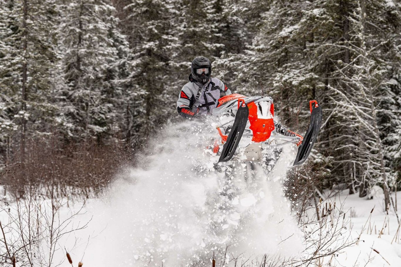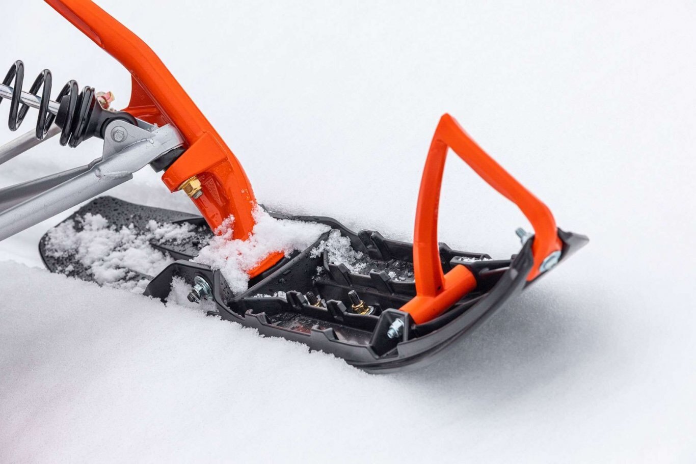 The sleek SRV-M Front Suspension is ultra compact to reduce unwanted spindle and suspension component drag in deep snow. The narrow stance allows for extreme maneuverability and delivers aggressive lean angles for incredible side-hilling and powder turn capabilities. The lightweight, forged aluminum spindles join the widely spaced upper and lower control arms producing a large caster angle for tight side-hilling and ease of steering. The clean, narrow overall stance and elimination of the sway bar also greatly enhances deep snow agility.