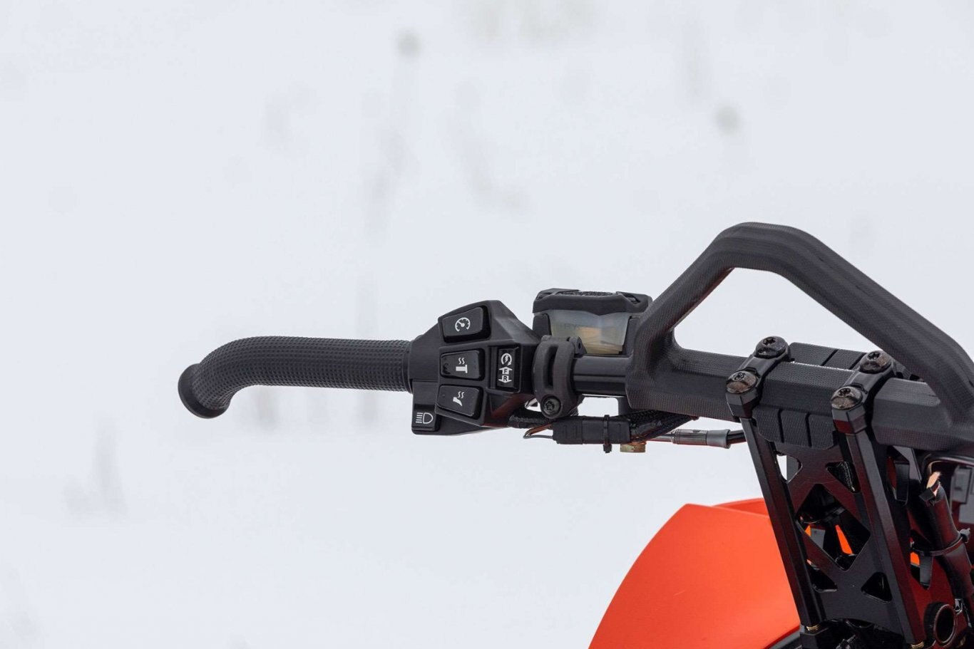 The handle bar controls feature a left hand switch cluster which allows for 'on the fly' access to the multi-step hand and thumb warmer adjusters. Information available on the multi-function gauge can be easily selected with a convenient toggle switch and the push button reverse gear switch is also located in the left hand cluster. The right side of the bar is clean with an ergonomically shaped throttle lever and simple, stand-alone emergency stop switch. The Hayes 'Stealth' brake cylinder is equipped with a composite brake lever providing great modulation for better feel and powerful stopping performance.