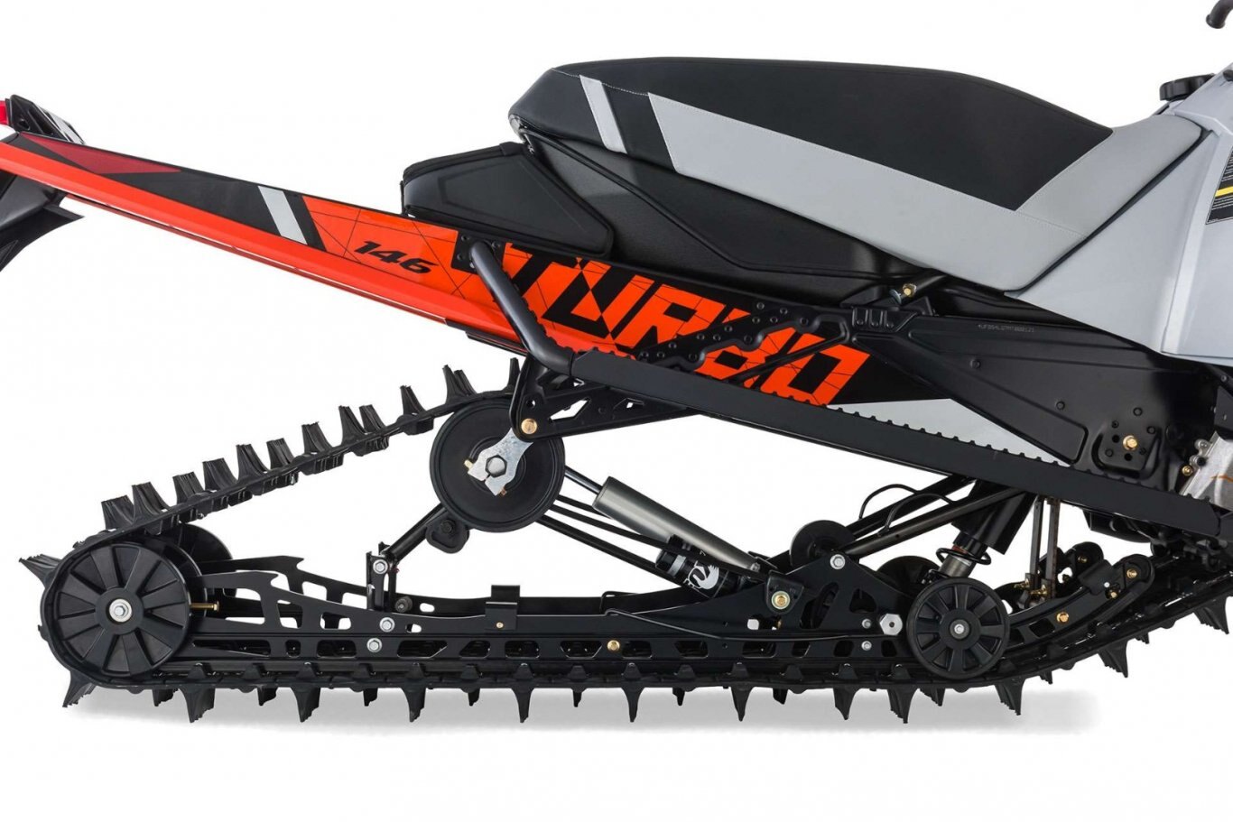 The Dual Shock 146 rear suspension is fitted into a light mountain, tapered tunnel. It also features a mountain style front arm with special 146 inch rails that utilize a long rear QS3 shock with a lightweight single pull rod. A unique design, shock pivot is added to the uncoupled front arm to provide smooth transfer for great handling both in and out of the powder.