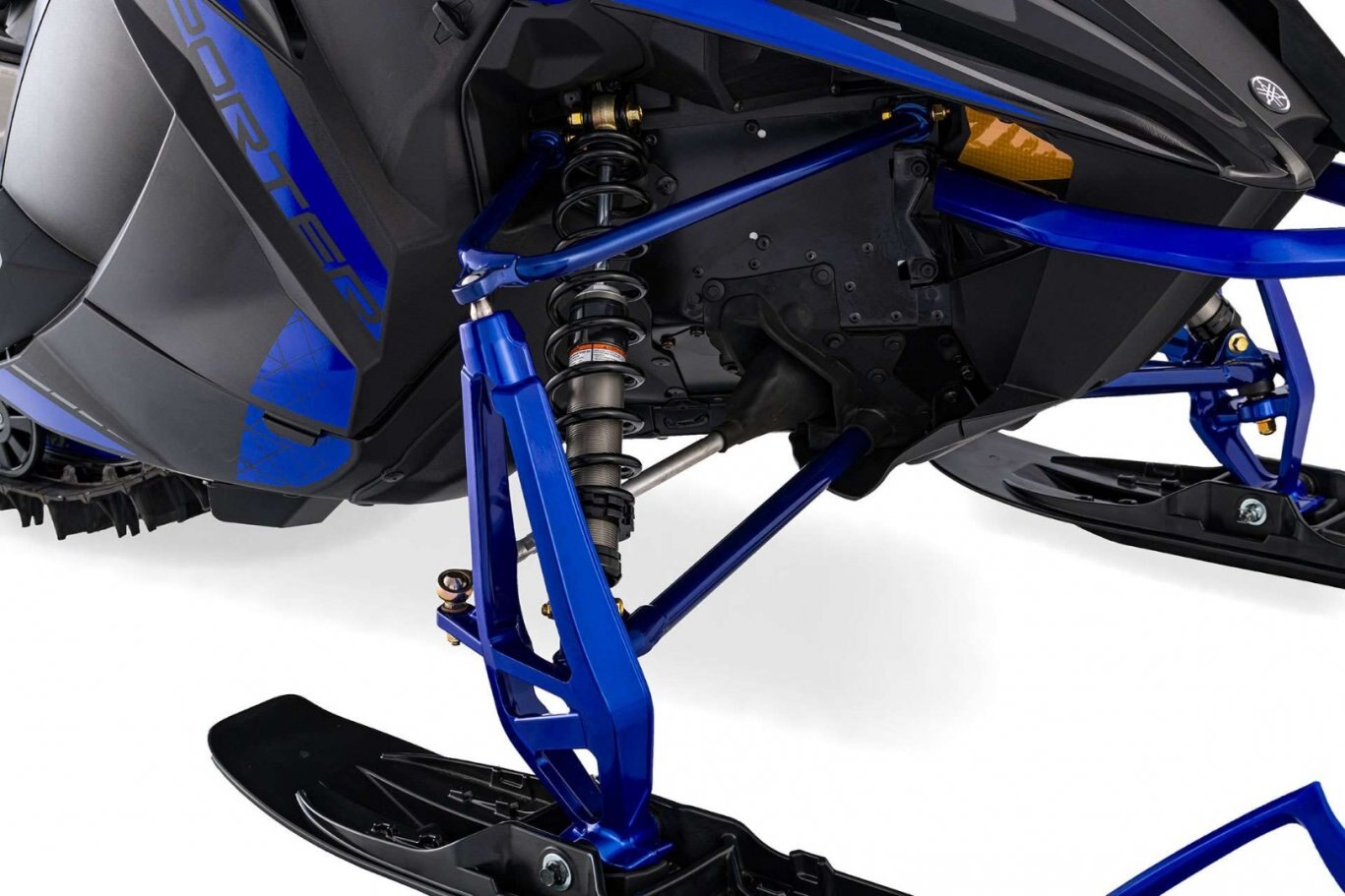 The SRV front suspension geometry is aimed at managing spindle camber, resulting in minimized bump-steer and maximized cornering bite giving rider confidence in varying trail conditions. The A-arms are mounted at a 30-degree angle from the sled's centerline to efficiently dissipate impact force throughout the entire chassis. Likewise, the front shocks mount directly to the leading spar so that trail forces are routed to the strongest part of the chassis. Wide a-arm spacing minimizes flex and stress in the front suspension system, which means consistent and confident corner handling. Ski stance is a narrow 38 inches to aid in off trail maneuvers in and around obstacles.