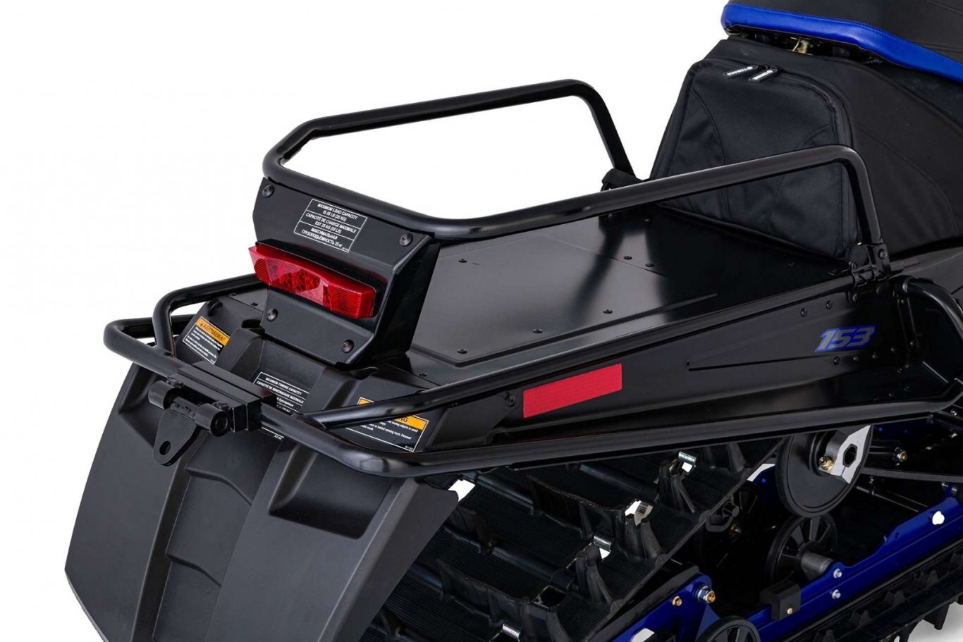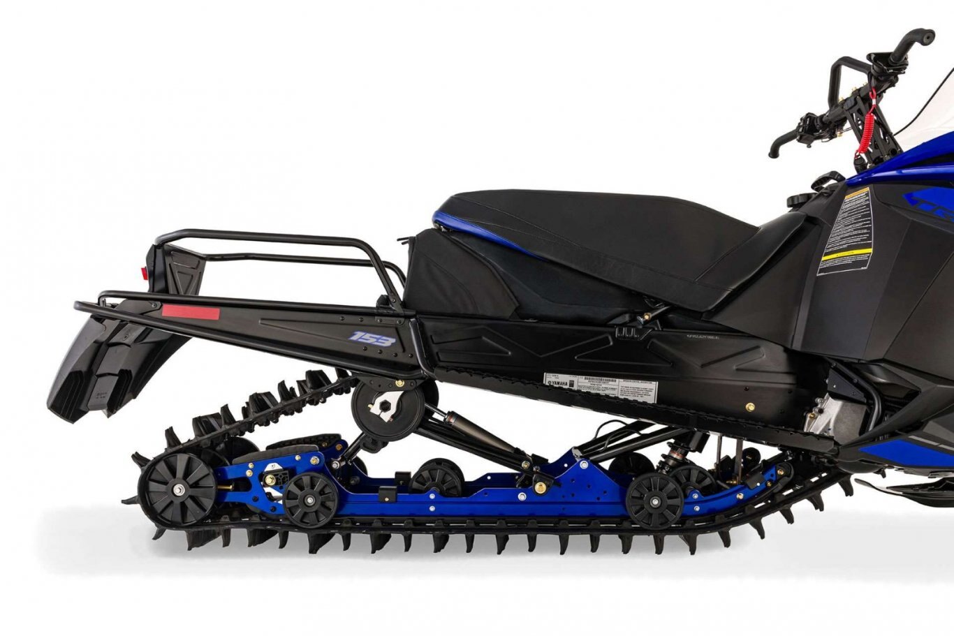 The long travel rear suspension features a hinged, spring-loaded tail-end section that allows the rear idler wheels to travel upwards in an arc when going over bumpy trails making the sled feel and handle like a shorter track model. This articulating features also assists the sled when in reverse by helping guide the track up on top of the snow, not letting it dig in. Another unique feature is offered to lock the rail so it doesn't articulate for maximum traction when pulling a heavy load. A simple 'push pin' is used to engage the rail extension when needed to help keep the skis down and get all the traction possible out of the 153 inch track.