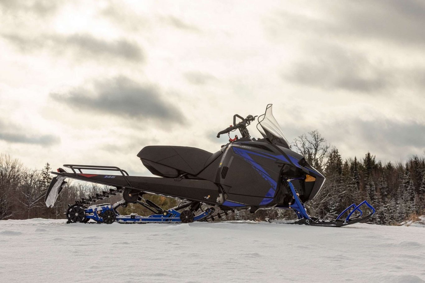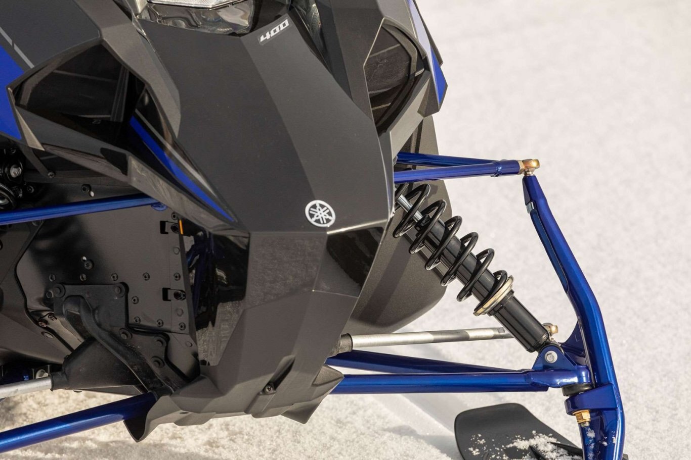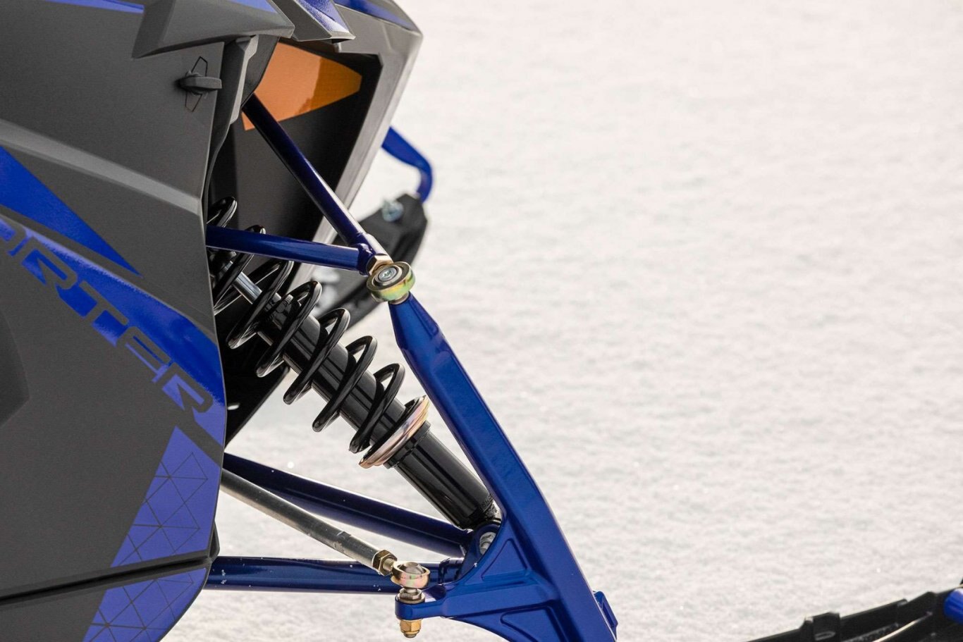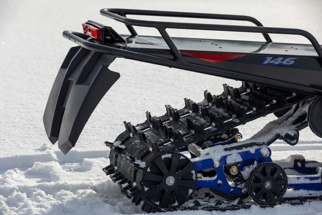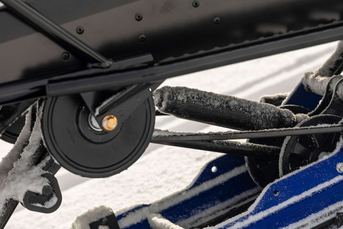 The long 12.5 inch travel rear suspension features a hinged, spring-loaded tail-end section that allows the rear idler wheels to travel upwards in an arc when going over bumpy trails making the sled feel and handle like a shorter track model. This articulating features also assists the sled when in reverse by helping guide the track up on top of the snow, not letting it dig in.