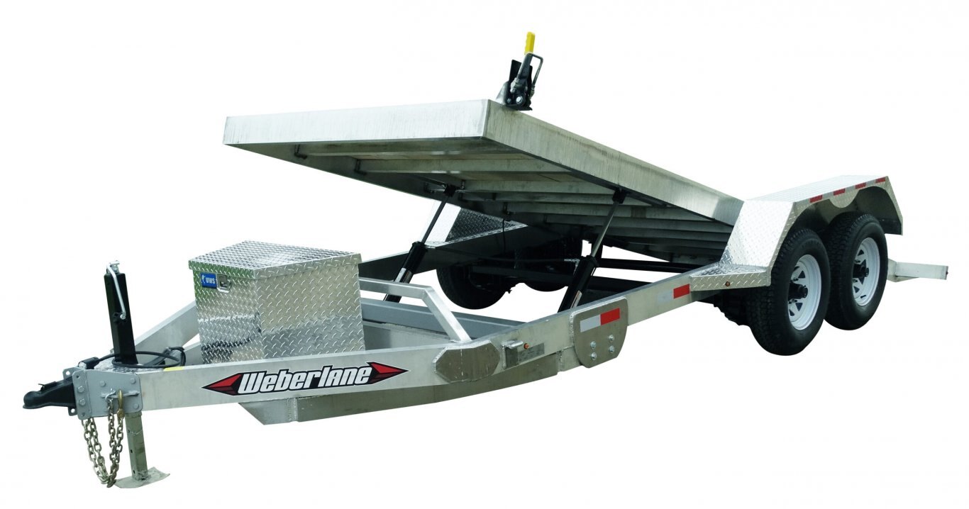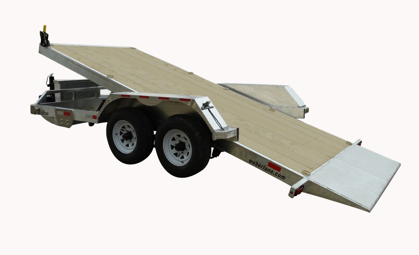 Aluminum Tilt and LoadThese all Canadian made aluminum trailers are designed for those wanting the non oxidizing longevity of aluminum with the ability of hauling heavy loads with extended periods of continuous use. These low profile aluminum Weberlane car trailers are built with a heavy gauge aluminum C channel framework, and tubing exterior bed frame. Grommet sealed LED lights and protected wiring are standard features. All contact points between aluminum and steel, such as front hitch cones, axle mounts, jack mounts, etc, are protected with a stainless steel plate barrier. Available in both bumper pull and gooseneck models. The light curb weight of these trailers will decrease your fuel consumption while increasing your payload capacity. |