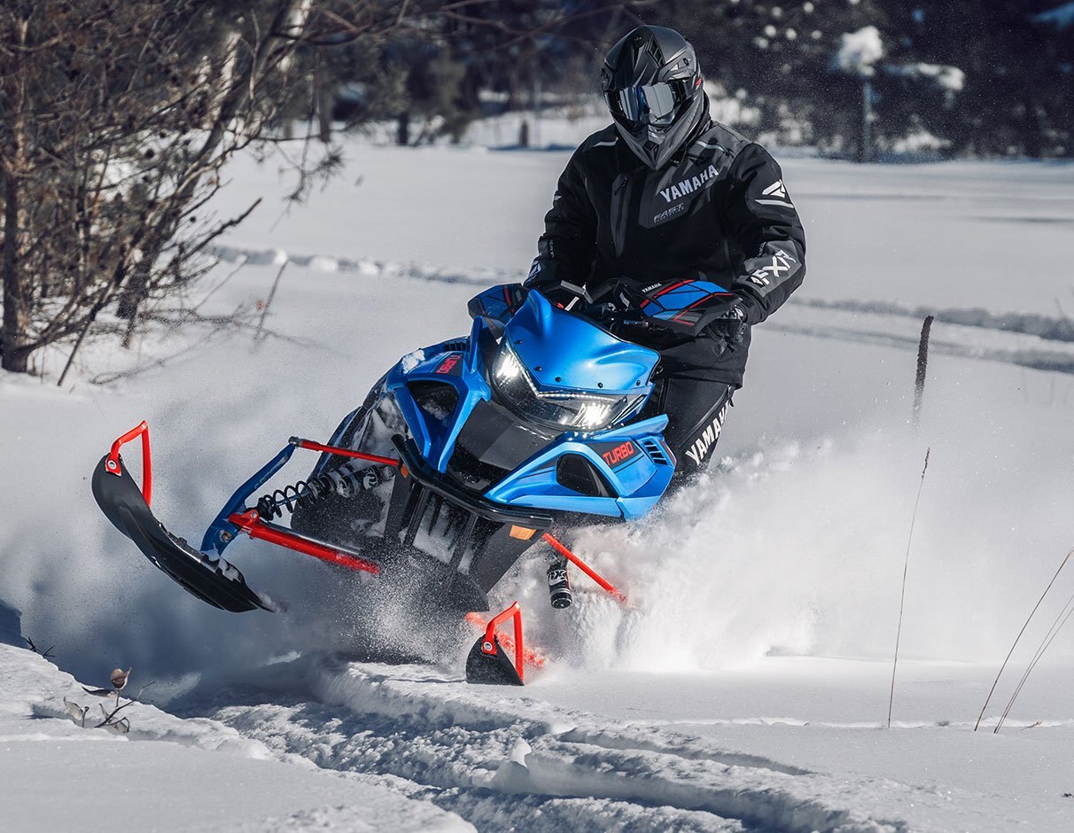 | The Sidewinder X-TX SE is more about getting off-trail with its quick transfer, VersAttak 146 rear suspension and 2.00" deep-lug Camso 'Challenger' track. The front end sports a narrower 40" ski stance supported by wide Yamaha Mountain skis. The tunnel and steering system is based on the SR-M Mountain chassis complemented with a light weight mountain seat, tapered foot boards and Stealth controls. Top-shelf Fox® Zero QS3 shocks are found up front to accommodate a wide range of terrain and riding styles. The Genesis Turbo adds a power packed punch of fun to any outing. |