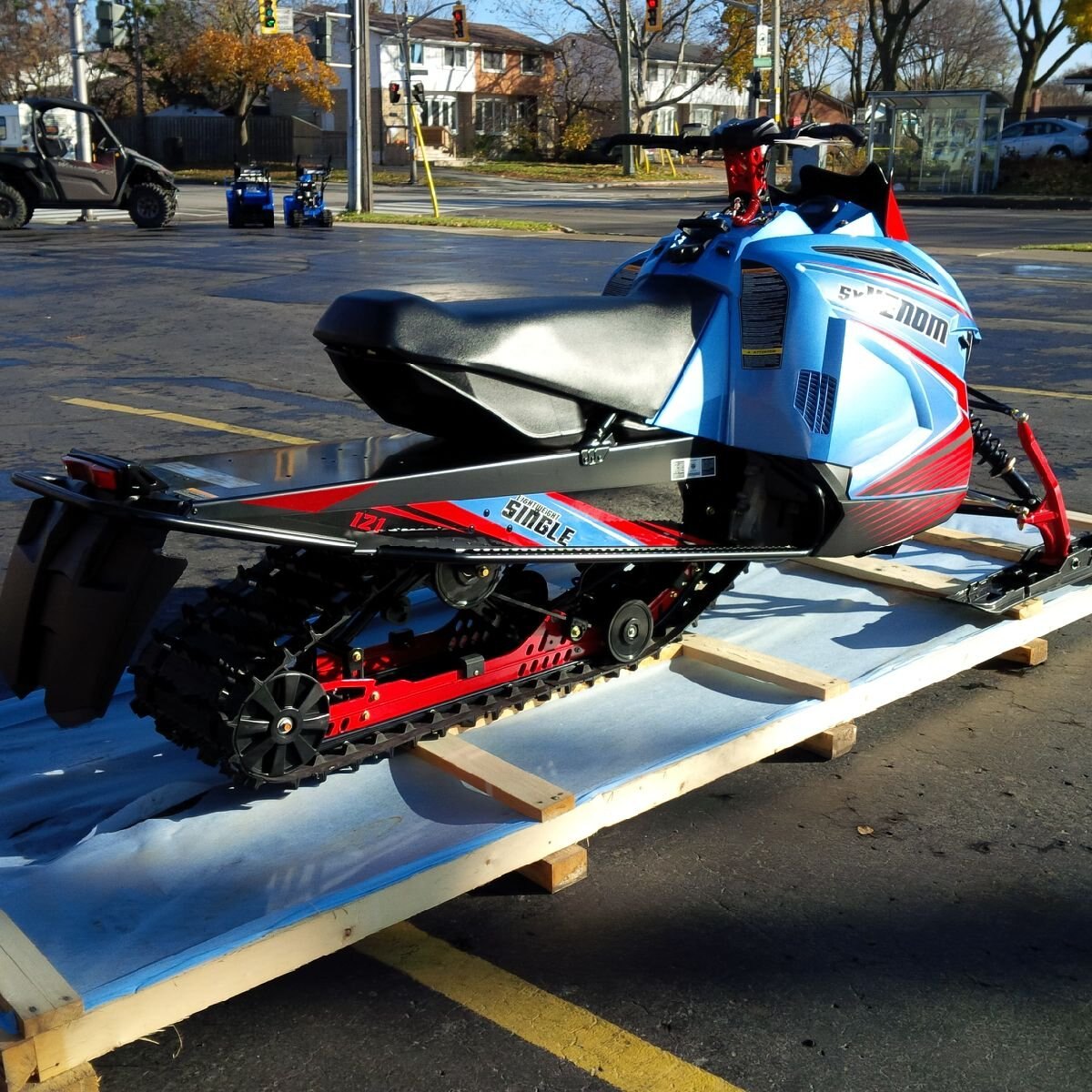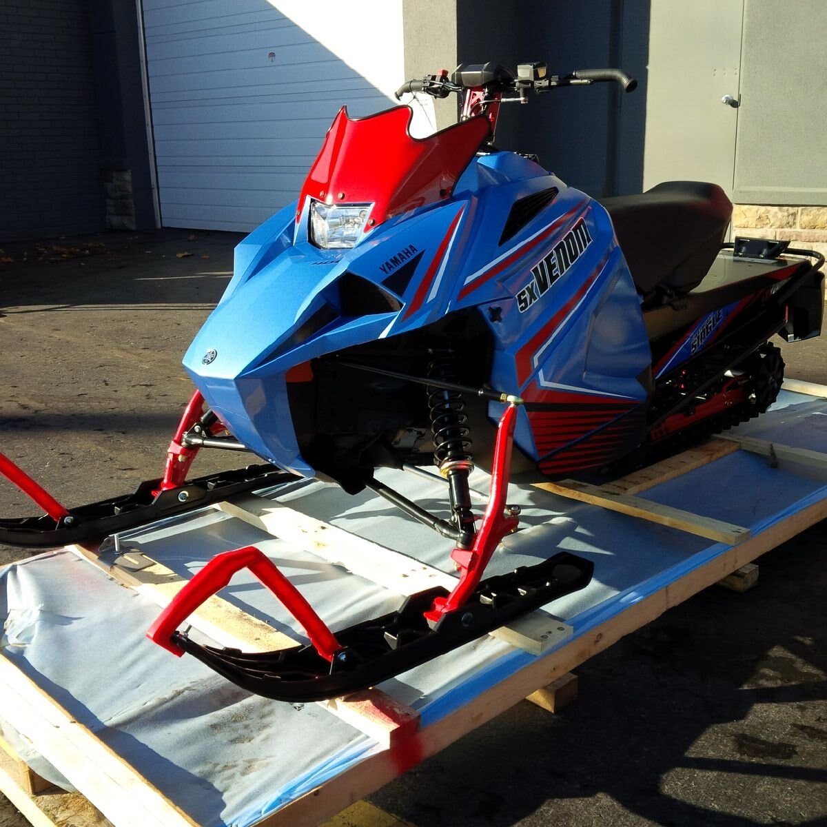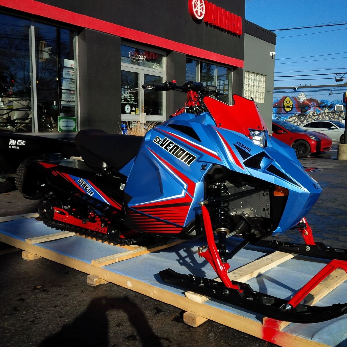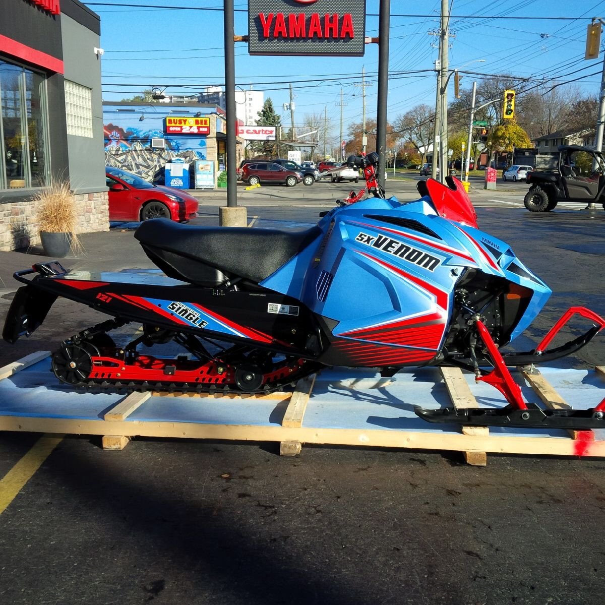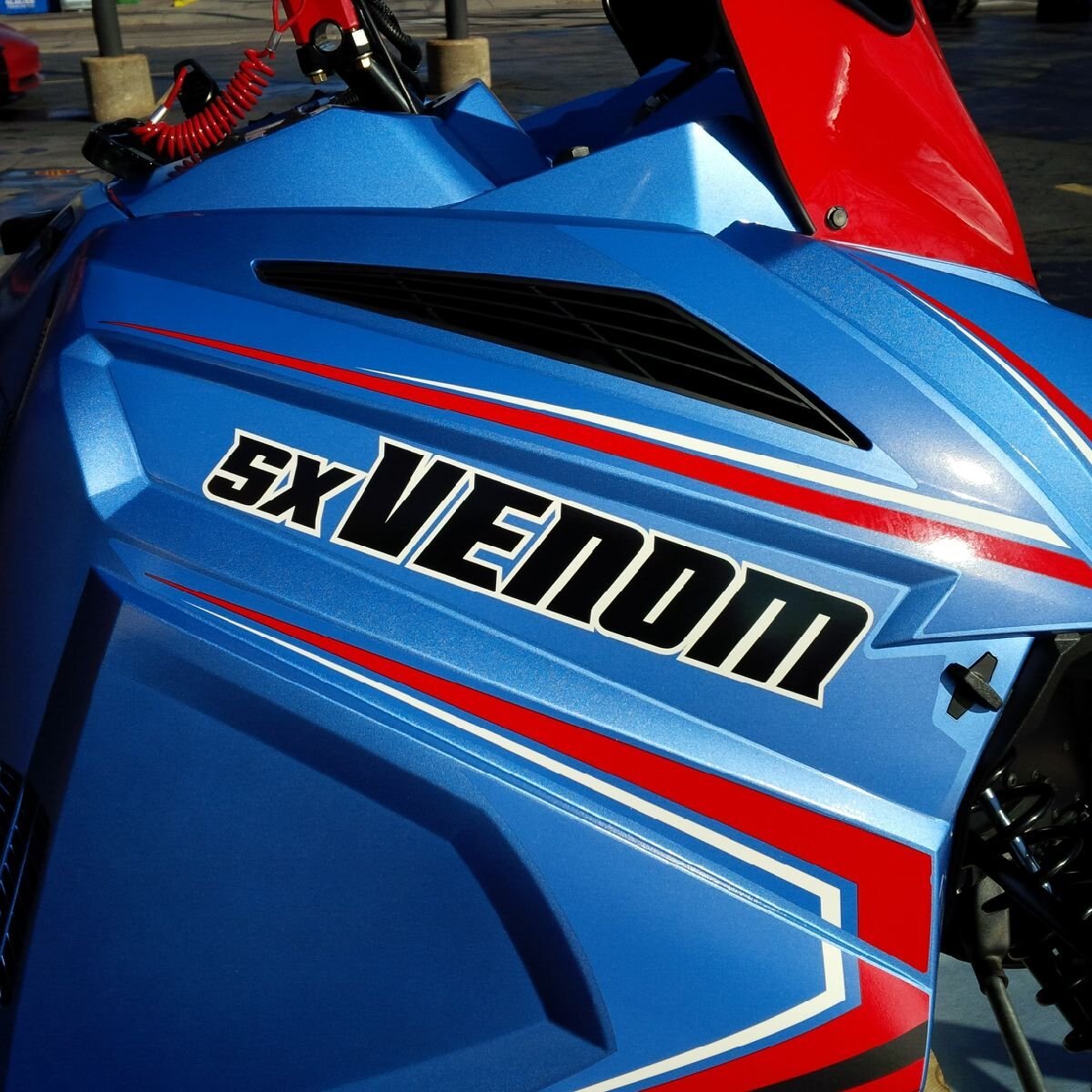 The Venom is a lightweight snowmobile aimed at young, new and returning riders. The fuel-injected, two-stroke 397cc single-cylinder engine features electric start and is propelled by a 121-inch Camso Hacksaw track. Long-travel 'Dual Shock' rear suspension, lightweight alloy chassis, Stryke single keel ski and racy styling combine to create a compact sled that bristles with excitement at a very attractive price.