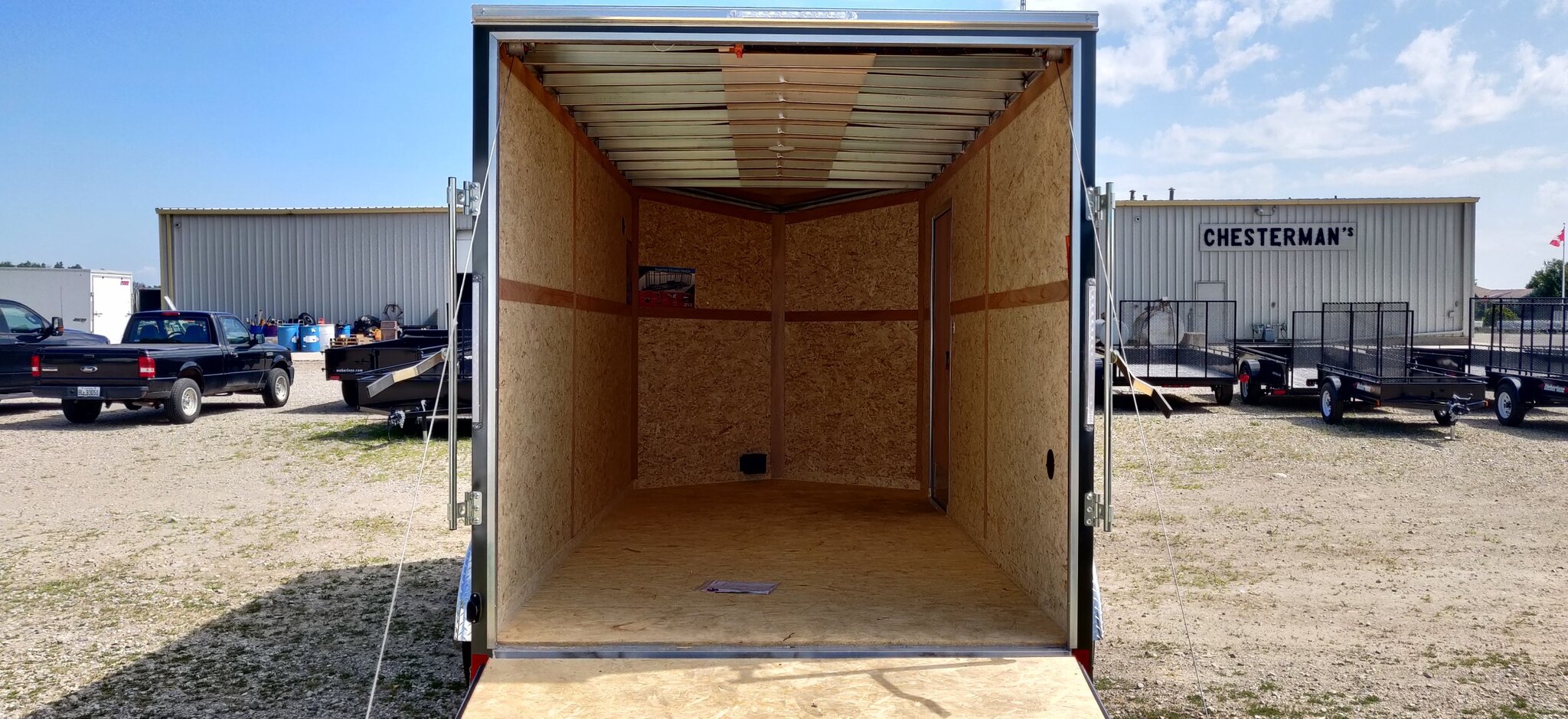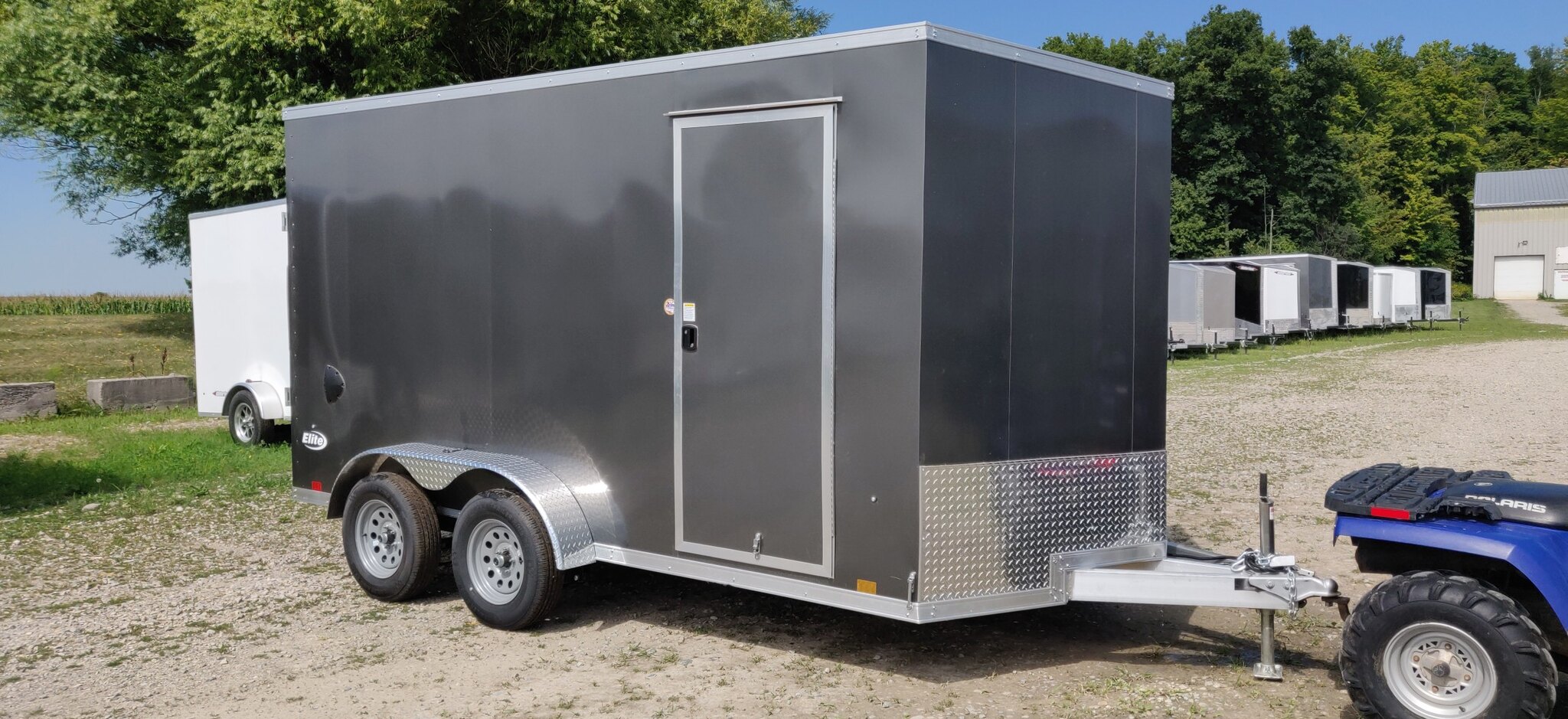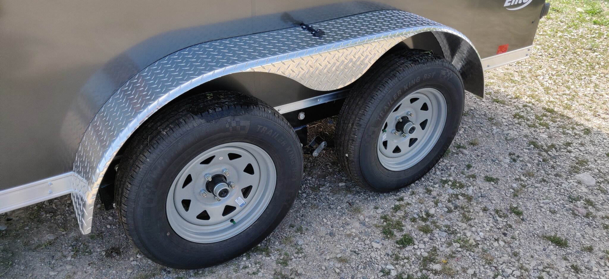 Style: Aluminum Cargo Trailer / Flat Top / 24in Sloped V-Nose Axle: Tandem / Drop / Electric Axle Type: (2) 3500lb Spring w/ Superlube Hubs Tire: (4) ST205/75R15 5 Lug Radial Rim: (4) Silver MOD Main Frame: Aluminum Tube w/Tube XM\'s / 16in On Center Coupler: 2-5/16in Hitch: 3 Piece Jack: 2000lb top wind w/ sand pad Vertical Post: 81-1/2in V.P.H. Sidewall: 1in x 1-1/2 Aluminum Tube / 16in on Center / 24in Sloped V-Nose Roof Bow: 1in x 2in Aluminum Semi Crowned Tube / 16in on Center Floor: 3/4in high performance Wall: High performance Ceiling: None Exterior Metal: 0.030\" Charcoal Exterior Metal: Screwless Stoneguard: 24in High ATP 0.025 Embossed Fender: ATP Tandem Teardrop Roof: 1 Piece Aluminum Roof: 24in wide 2.7in Lauan ridge board Rear Hoop: Same colour as trailer Top Trim: 2-1/2in Bottom Trim: 2-1/2in License Plate Bracket: Molded plastic Rear Door: 250 series ramp door w/ spring assist w/ (2) Bar locks / (2) Aluminum Grab Handles w/ Drip Rail Above Door and 16in Ramp Extension Side Door: 32w x 74h C/S F/L w/ Aluminum Hold Back and Drip Rail above Door Starting 16in From Front Vent: (2) Sidewall flo thru vents (Black) Dome Light: (1) LED Dome light centered 12 Volt Switch: (1) C/S Door Breakaway: Breakaway battery w/ switch Cable: 7 way Clearance Light: 3/4\" Bullet LED Clear Lens License Plate Light: Yes Tail Light: (2) LED Clear lens slimline w/ integrated backup light