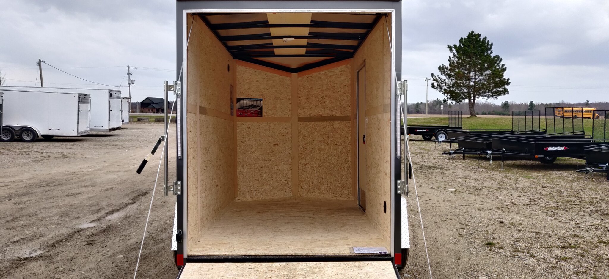 Style: Journey SE / Flat Top / 24in Sloped V-Nose Axle: Single/drop/Idler 2990 GVW Axle Type: (1) 3500 LB Spring w/ Superlube Hubs Tire: (2) ST205/75R15 5 Lug Radial Rim: (2) Silver Mod Main Frame: 2x3 Tube w/ZXMs 16in on center Main Frame: Undercoated Coupler: 2 inch ball Hitch: 2 Piece Jack: 2000lb top wind w/ sand pad Vertical Post: 84-3/4in VPH (\12\" of Height = 84\" IH) Sidewall: Z-Post/16in centers/24in sloped v-nose Roof Bow: 1 x 1-1/4 semi crowned tube 24in centers Floor: 3/4in high performance Wall: High Performance Ceiling: None Exterior Metal: Screwless w/ Screwed Seams and Coloured Matching Screws where applicable Exterior Metal: 0.030 Charcoal Front Nose: ATP 0.025\" Embossed Stoneguard: 24in High ATP 0.025 Embossed Fender: ATP Jeep Style Roof: 1 Piece aluminum Roof: 16in wide 2.7 Lauan Ridge Board Rear Hoop: Same colour as trailer Top Trim: 2-1/2in Bottom Trim: 1-1/2in License Plate Bracket: Molded Plastic Rear Door: 150 Series ramp door / spring assist w/ (2) Zinc bar locks and large J-Trim w/ Drip Rail above door Door Accessories: 12in x 3/4 High Performance Ramp Extension Side Door: 32w x 74h C/S F/L w/Wire hold back start 16in from front and drip rail above door starting 16in from front Vent: (2) Sidewall flow through vents (Black) Dome Light: (1) LED Dome light centered 12 Volt Switch: (1) C/S Rear Cable: 4-way Clearance Light: 3/4in Bullet LED Clear Lens License Plate Light: Yes Tail Light: (2) LED Clear lens slimline