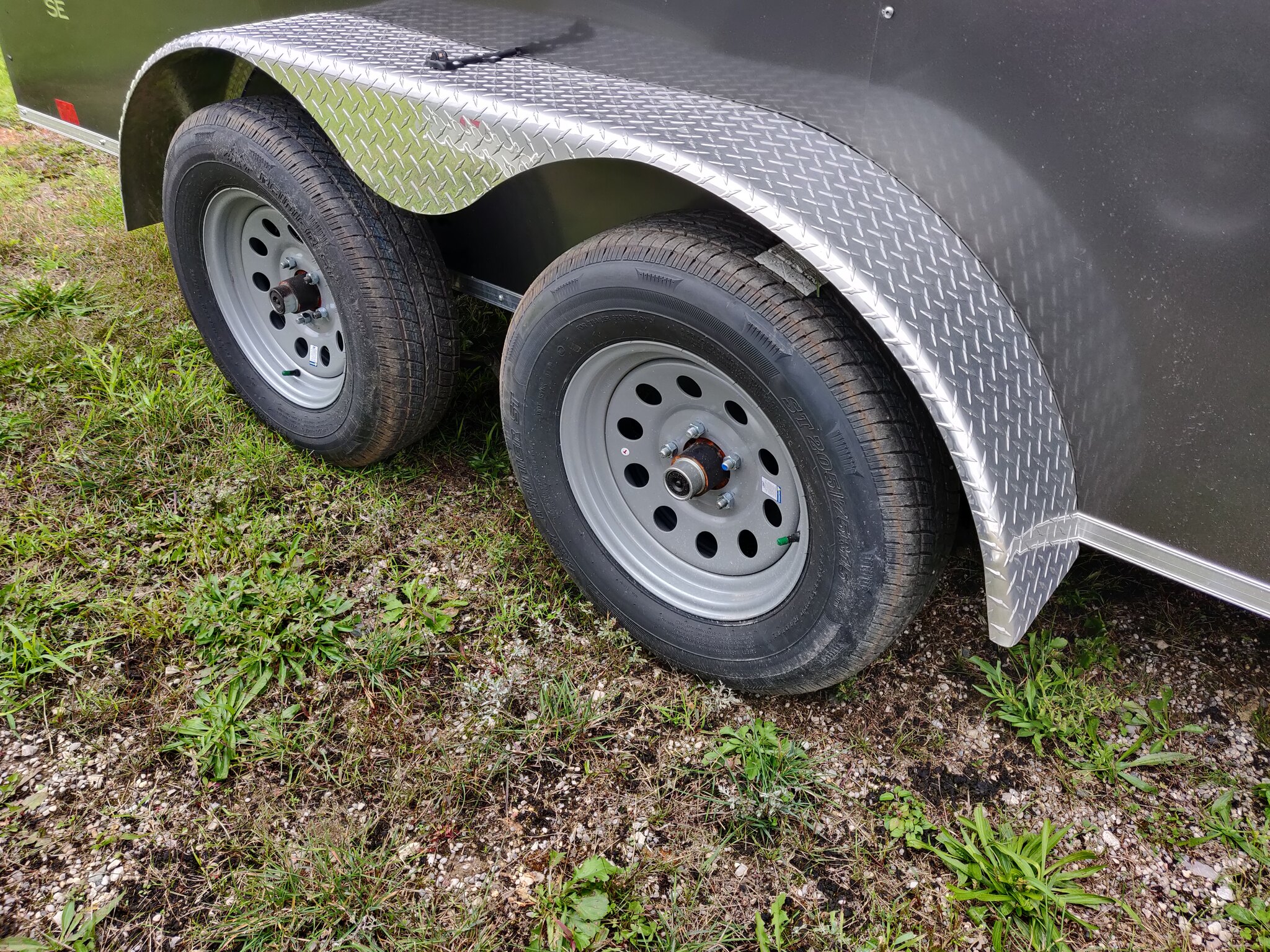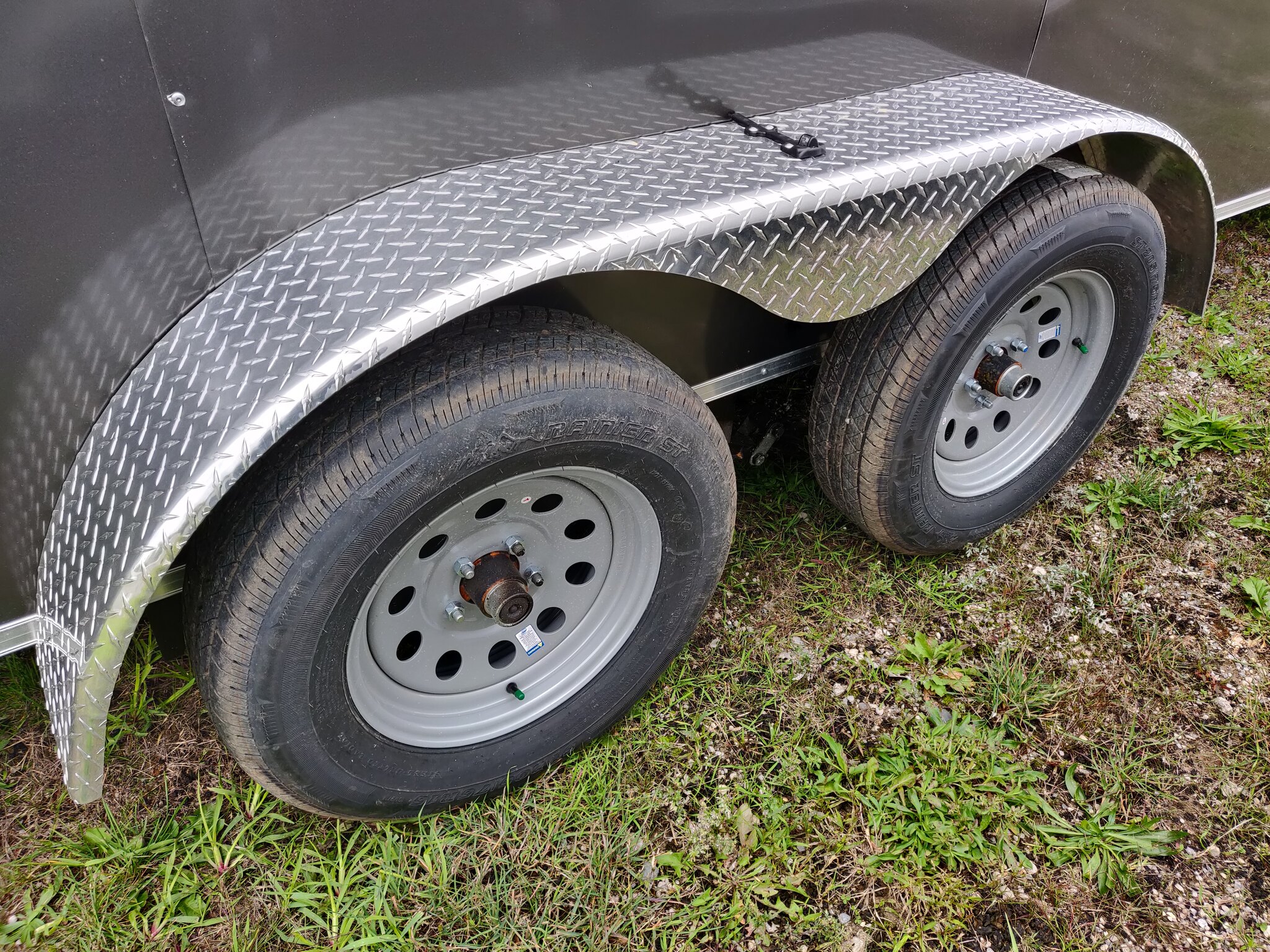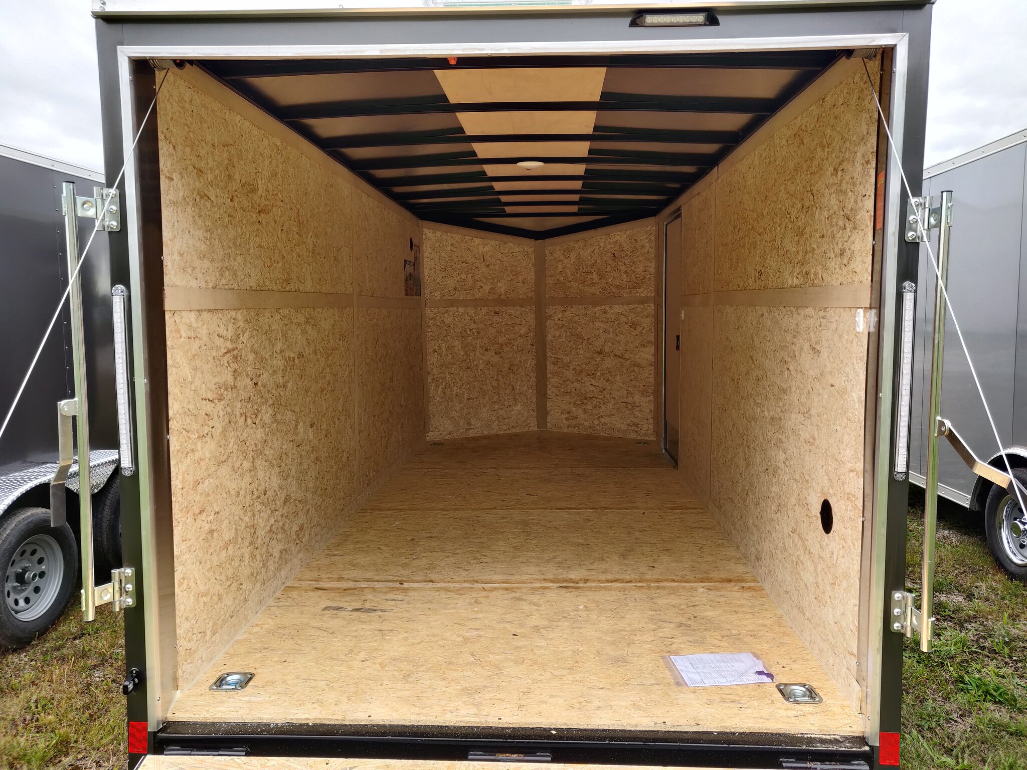 Style: Journey Cargo SE / Flat Top / 24 in Sloped V-Nose Axle: Tandem / Drop / Electric Axle Type: (2) 3500lb Spring w/ Superlube Hubs Tire: (4) ST205/75R15 5 Lug Radial Rim: (4) Silver MOD Main Frame: 2in x 4in Tube / ZXMs 16in on center w/ 2in x 6in A-Frame tube Main Frame: Undercoated Coupler: 2-5/16in Hitch: 2 Piece w/ 2in x 6in Tube A-Frame Jack: 2000 LB Top Wind w/ Sand Pad Jack: Rear 11-1/2 in Fold Down Stabilizer Jacks for Steel Trailers (Pair) Vertical Post: 78-3/4in V.P.H (\6in Height = 78\" IH) Sidewall: Z-Post / 16in Centers / 24 in Sloped V-Nose Roof Bow: 1in x 1-1/4in semi crowned tube / 24in centers Floor: 3/4in High Performance Wall: High Performance Ceiling: None Exterior Metal: 0.030\" Charcoal Exterior Metal: Screwless w/ Screwed Seams and Colour Matching Screw - Where Applicable Front Nose: ATP 0.025 Embossed Stoneguard: 24in High 0.025 ATP Embossed Fender: Black ATP Teardrop Tandem Roof: 1 Piece aluminum Roof: 24in wide 2.7in Lauan ridge board Rear Hoop: Same colour as trailer Top Trim: 2-1/2in Bottom Trim: 1-1/2in License Plate Bracket: Molded plastic Rear Door: 250 series ramp door w/ spring assist w/ bar locks / hasp and trim / rub rail bottom edge of door trim w/ black drip rail above door Rear Door: 12 in x 3/4in High Performance Ramp Extension Side Door: 32w x 74h C/S Black F/L w/ wire hold back drip rail above door start 16in from front Vent: (2) Sidewall flo thru vents (black) Dome Light: (1) LED Dome light centered 12 Volt Switch: (1) C/S Door 12 Volt Switch: (1) 12V 15A Interior Wall Switch for Exterior Rear Header Loading Light Breakaway: Breakaway battery w/ switch Cable: 7 way Clearance Light: 3/4 Bullet LED Clear Lens License Plate Light: Yes Loading Light: (1) 12V 10in Exterior Double Row LED Loading Light - Angled Tail Light: (2) LED Clear lens slimline w/ integrated backup light HD D-Ring: (4) Recessed 5,000LB Floor D-Rings Bolted w/ Steel Plates (One in each corner)