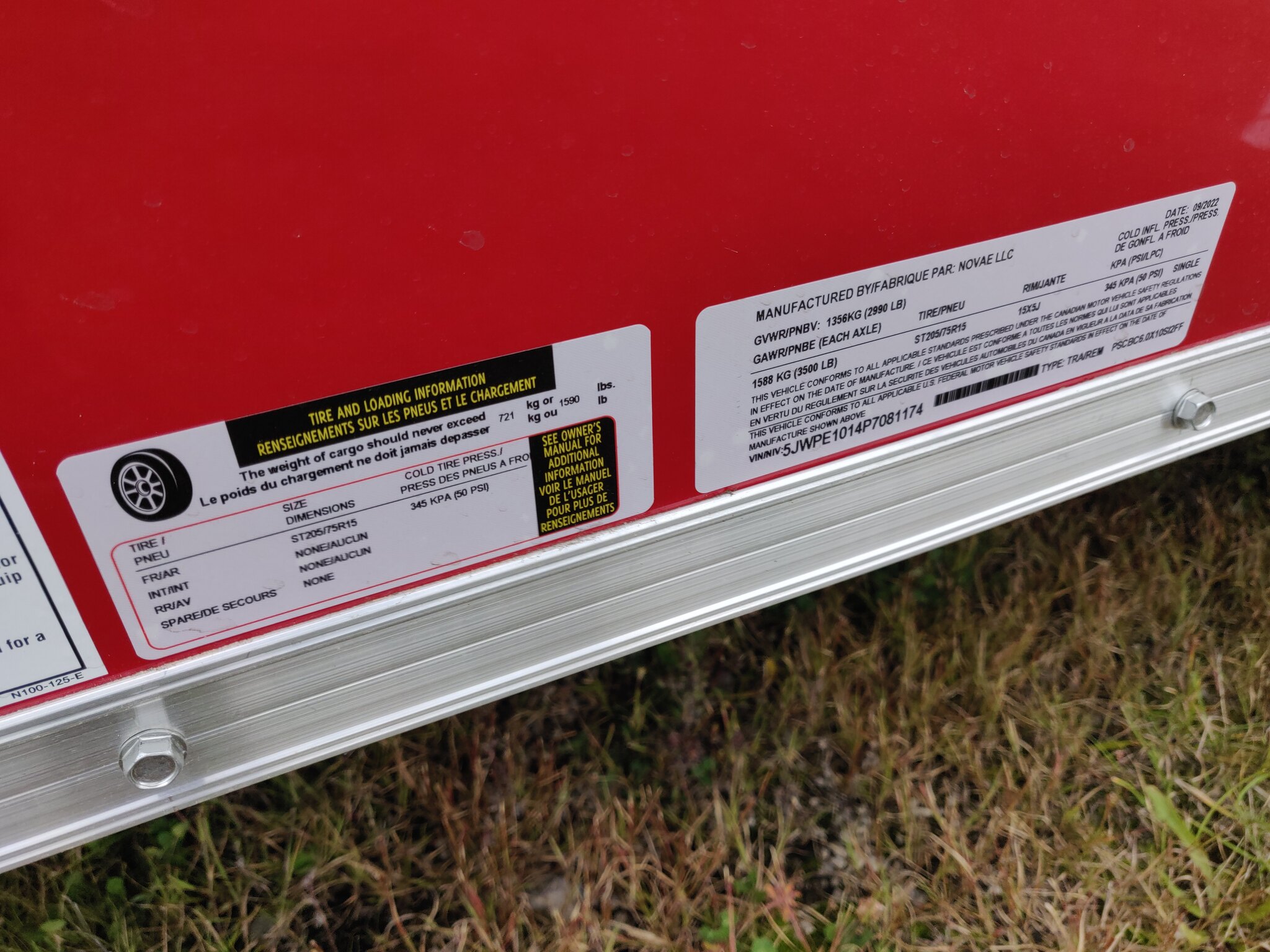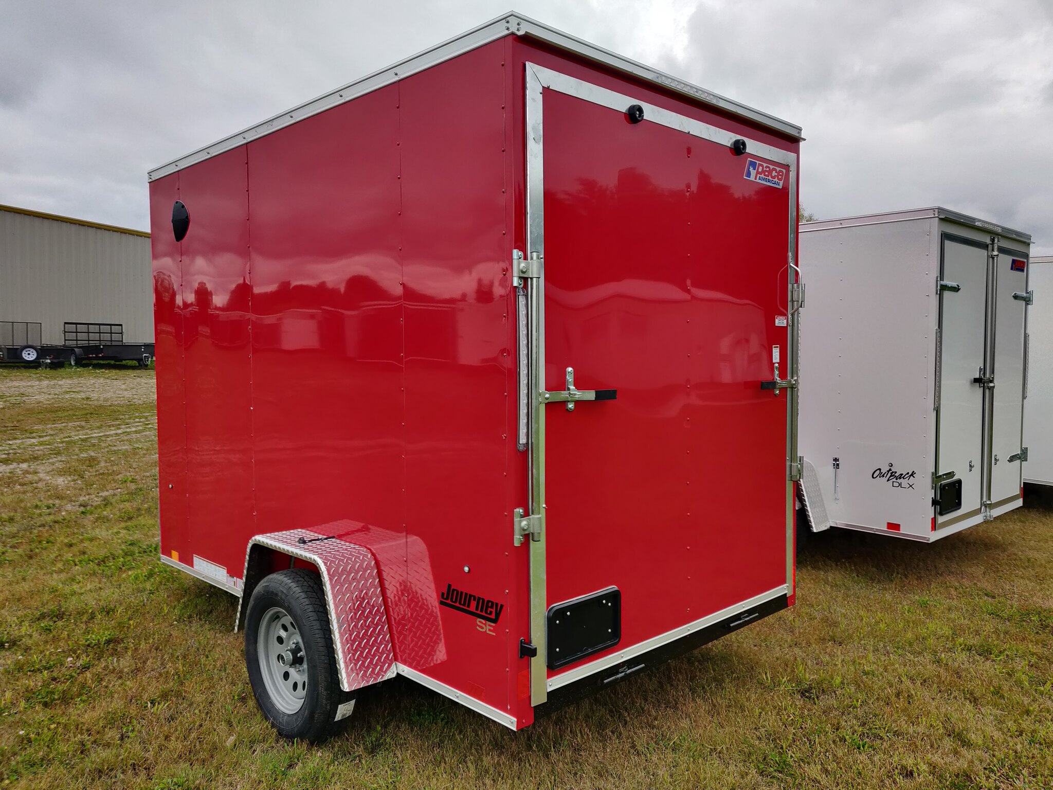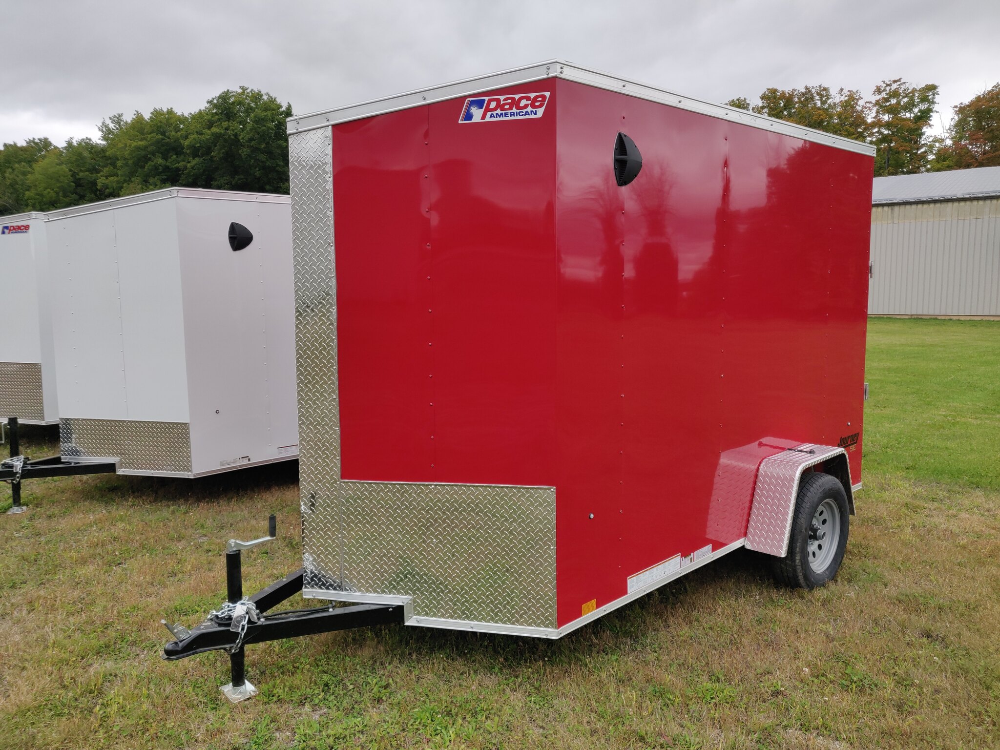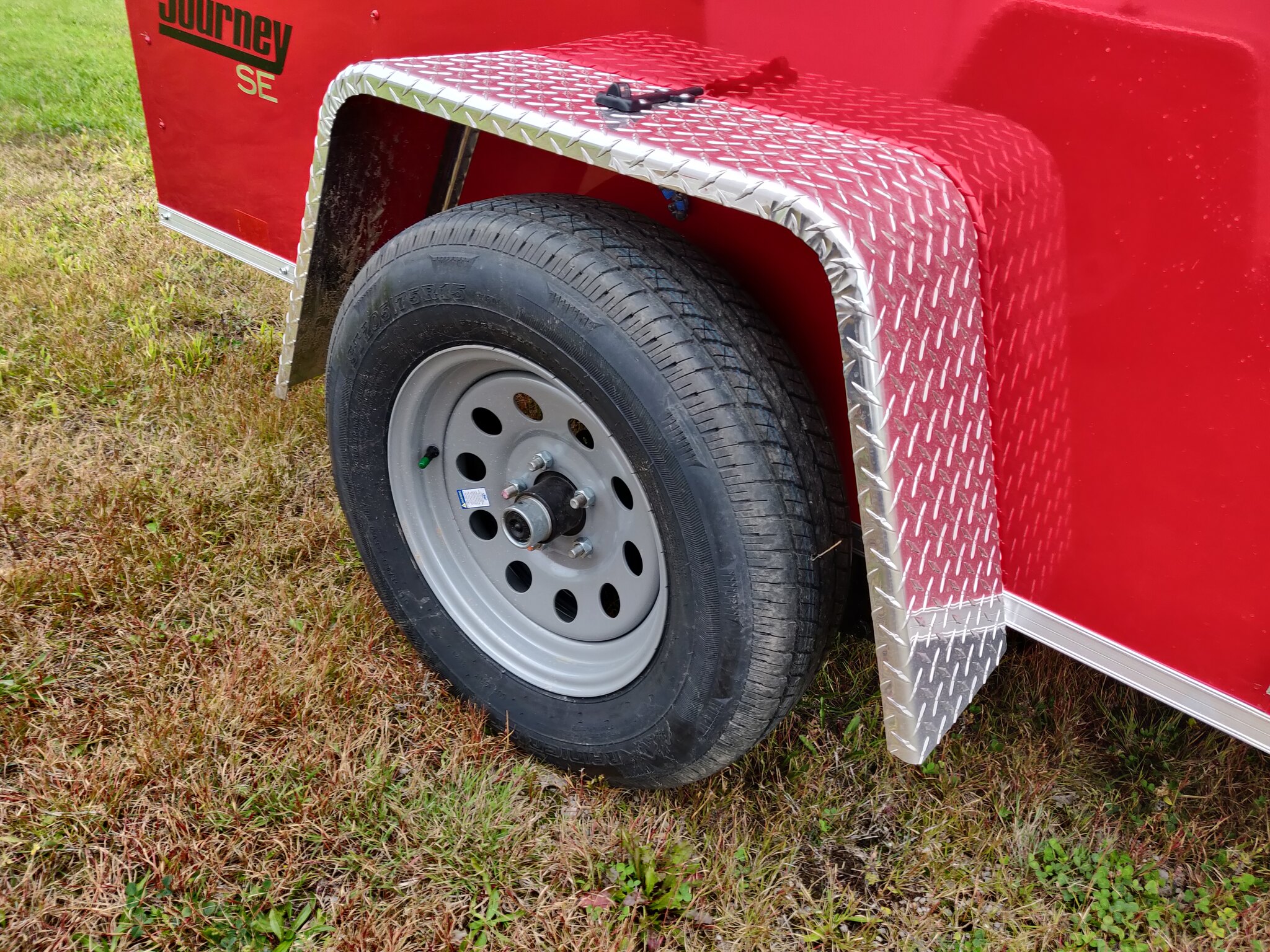 Style: Journey SE / Flat Top / 24in Sloped V-Nose Axle: Single/drop/Idler 2,990 GVW Axle Type: (1) 3500 LB Spring w/ Superlube Hubs Tire: (2) ST205/75R15 5 Lug Radial Rim: (2) Silver Mod Main Frame: 2x3 Tube w/ZXMs 16in on center Main Frame: Undercoated Coupler: 2 inch ball Hitch: 2 Piece Jack: 2000lb top wind w/ sand pad Vertical Post: 84-3/4in VPH (\12\" of Height = 84\" IH) Sidewall: Z-Post/16in centers/24in sloped v-nose Roof Bow: 1 x 1-1/4 semi crowned tube 24in centers Floor: 3/4in high performance Wall: High Performance Ceiling: None Exterior Metal: Screwless w/ Screwed Seams and Coloured Matching Screws where applicable Exterior Metal: 0.030 Red Front Nose: ATP 0.025\" Embossed Stoneguard: 24in High ATP 0.025 Embossed Fender: ATP Jeep Style Roof: 1 Piece aluminum Roof: 16in wide 2.7 Lauan Ridge Board Rear Hoop: Same colour as trailer Top Trim: 2-1/2in Bottom Trim: 1-1/2in License Plate Bracket: Molded Plastic Rear Door: 150 Series ramp door / spring assist w/ (2) Zinc bar locks and large J-Trim w/ Drip Rail above door Door Accessories: 12in x 3/4 High Performance Ramp Extension Side Door: 32w x 74h C/S F/L w/ Wire Hold Back and Drip Rail above Door Start 16in from Front Vent: (2) Sidewall flow through vents (Black) Dome Light: (1) LED Dome light centered 12 Volt Switch: (1) C/S Rear Cable: 4-way Clearance Light: 3/4in Bullet LED Clear Lens License Plate Light: Yes Tail Light: (2) LED Clear lens slimline