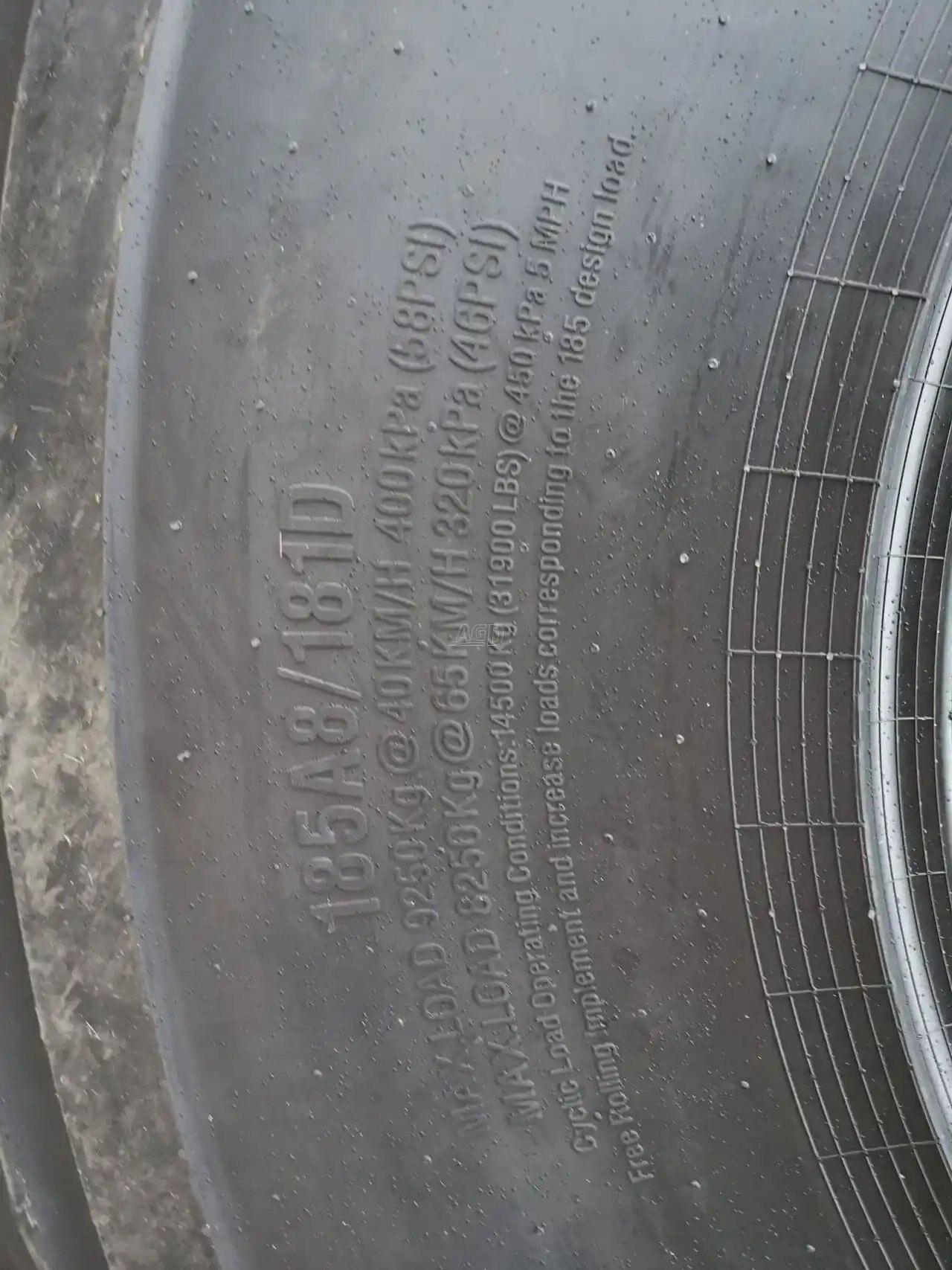Tubeless tire, for manure spreader, 185A8/181D load/speed index, Maximum load 9250 Kg @ 40KM/H & 8250 Kg @ 65KM/H. Harvest tires designed in Australia and manufactured in China. radial, price per tire. Stock # HV8006532 *Due to rapid changes in inventory levels, please call or email to confirm availability!*