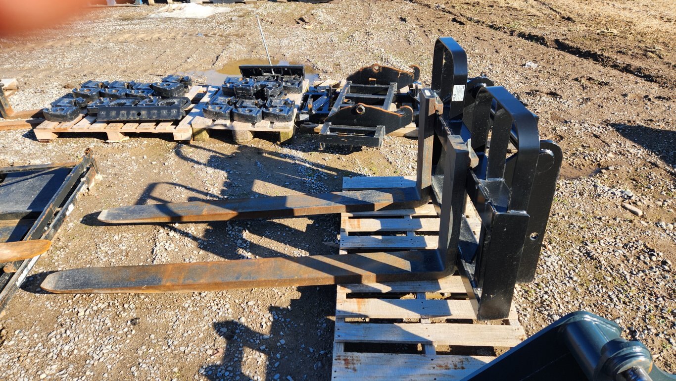 BRAND NEW HLA HD100MAQT pallet forks, Manitou quick-attach, 10000 lb. capacity, 72 inch tine length, 2 inch x 6 inch Class III solid tines, Guard, Sliding adjustable tines, 50 inch wide carriage
