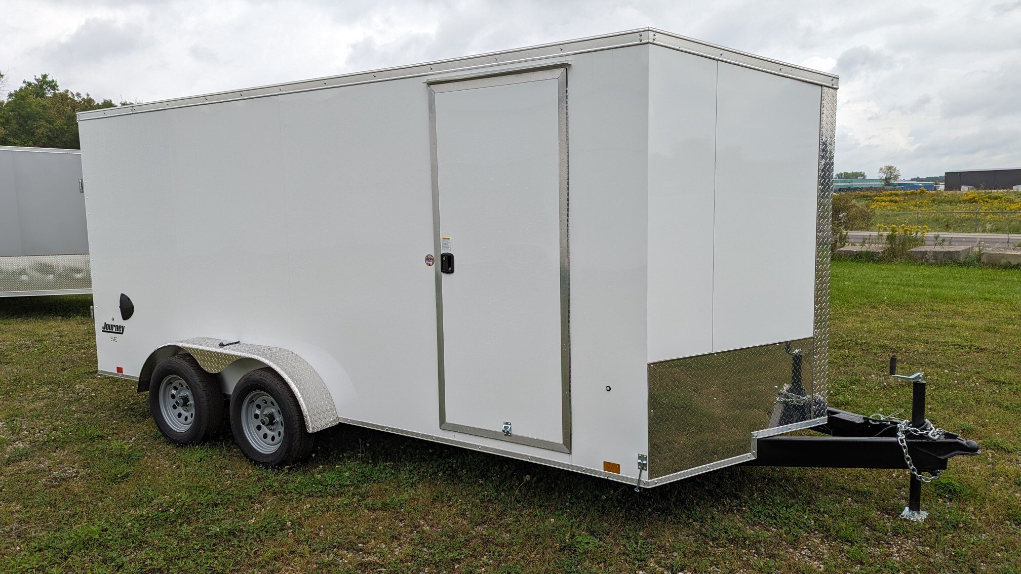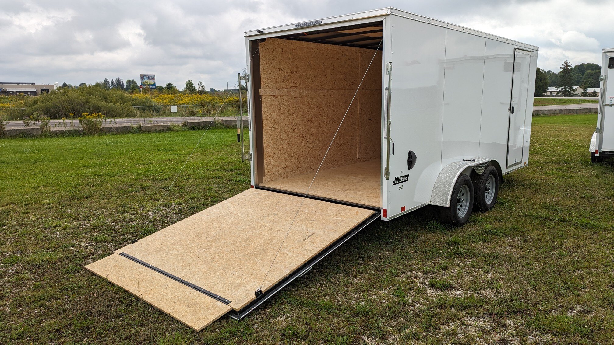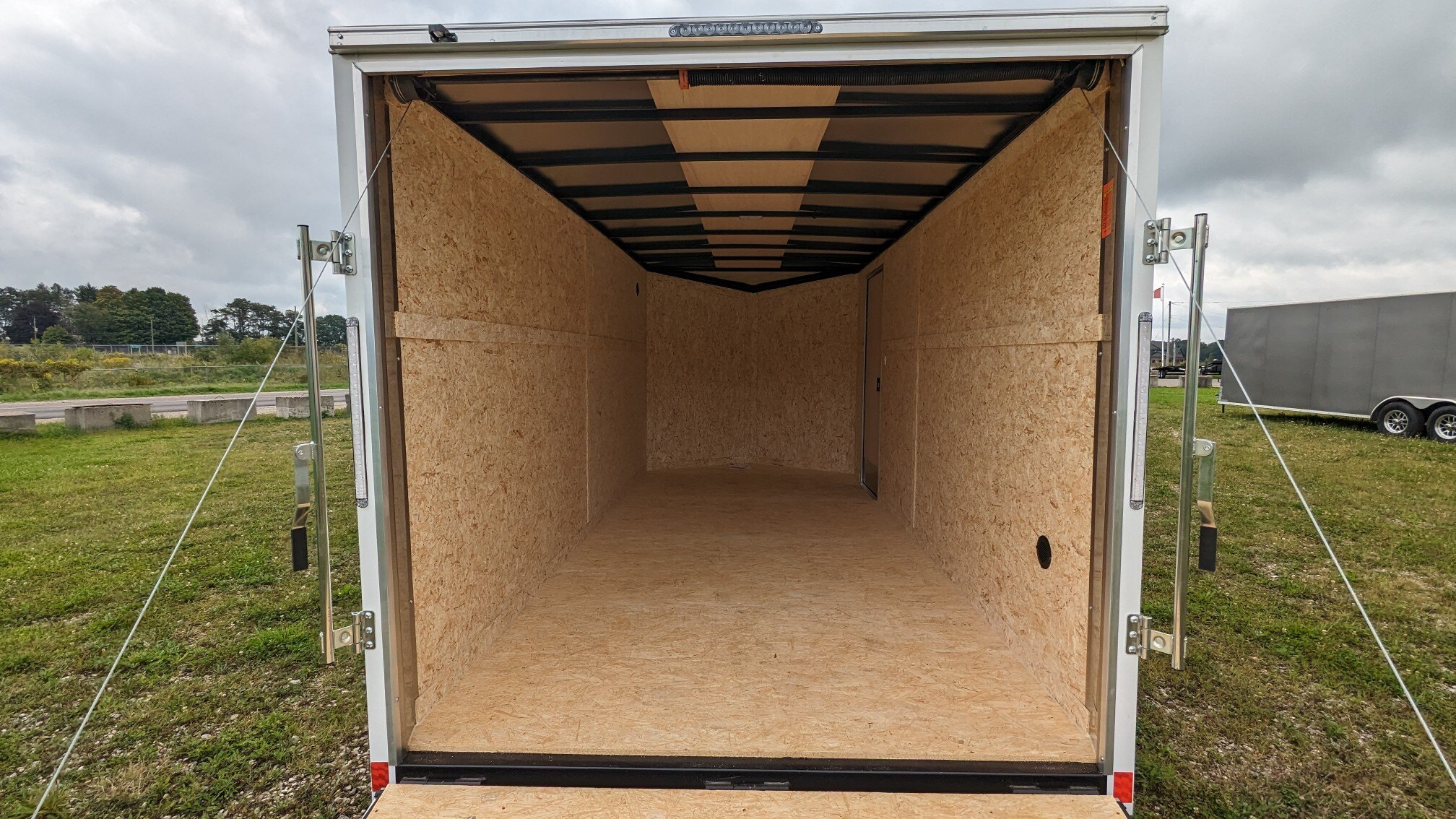 Build Details: - 4\" Tube Main Frame - 6\" A-Frame Tube Tongue - 16\" On-Center Full Height Crossmembers - 16\" On-Center Tube Sidewalls - 24\" On-Center Roof Bows - 24\" Deep Sloped V-Nose with 6\" Drop - 2-5/16\" A-Frame Ball Coupler - Safety Chains - 7-Way Electric Plug - 2K Coupler Mounted Jack - 32\" Wide Entry Door with Flush Lock - Metal Wire Door Holdback - Rear Ramp Door with Spring Assist - 12\" Wood Ramp Flap - ATP Fenders - Drop Spring Brake Axle(s) - Superlube Hubs - ST205/75R15 \'C\' Radial Tires - 15\" Silver Steel Wheels - Automotive Undercoating - 0.030\" Aluminum Exterior - Screwless Exterior - Seamless Aluminum Roof - ATP Nose Cap - 2.5\" Top Trim - 1.5\" Bottom Trim - 24\" Tall Straight ATP Stone Guard - Large J-Trim on Ramp Door(s) - Colour Matching Rear Hoop - Sidewall Vents - 78\" Interior Height - High Performance Wood Walls and Trim - Lauan Ceiling Liner Strip - 3/4\" High Performance Wood Flooring - (1) LED Dome Light with Switch - Bullet LED Marker and Clearance Lights - Slimline LED Tail Lights with Integrated Backup Light