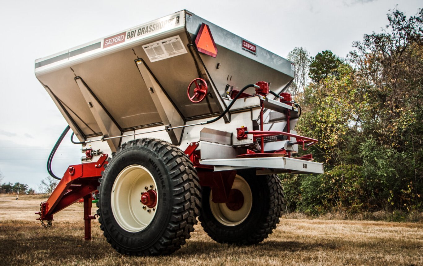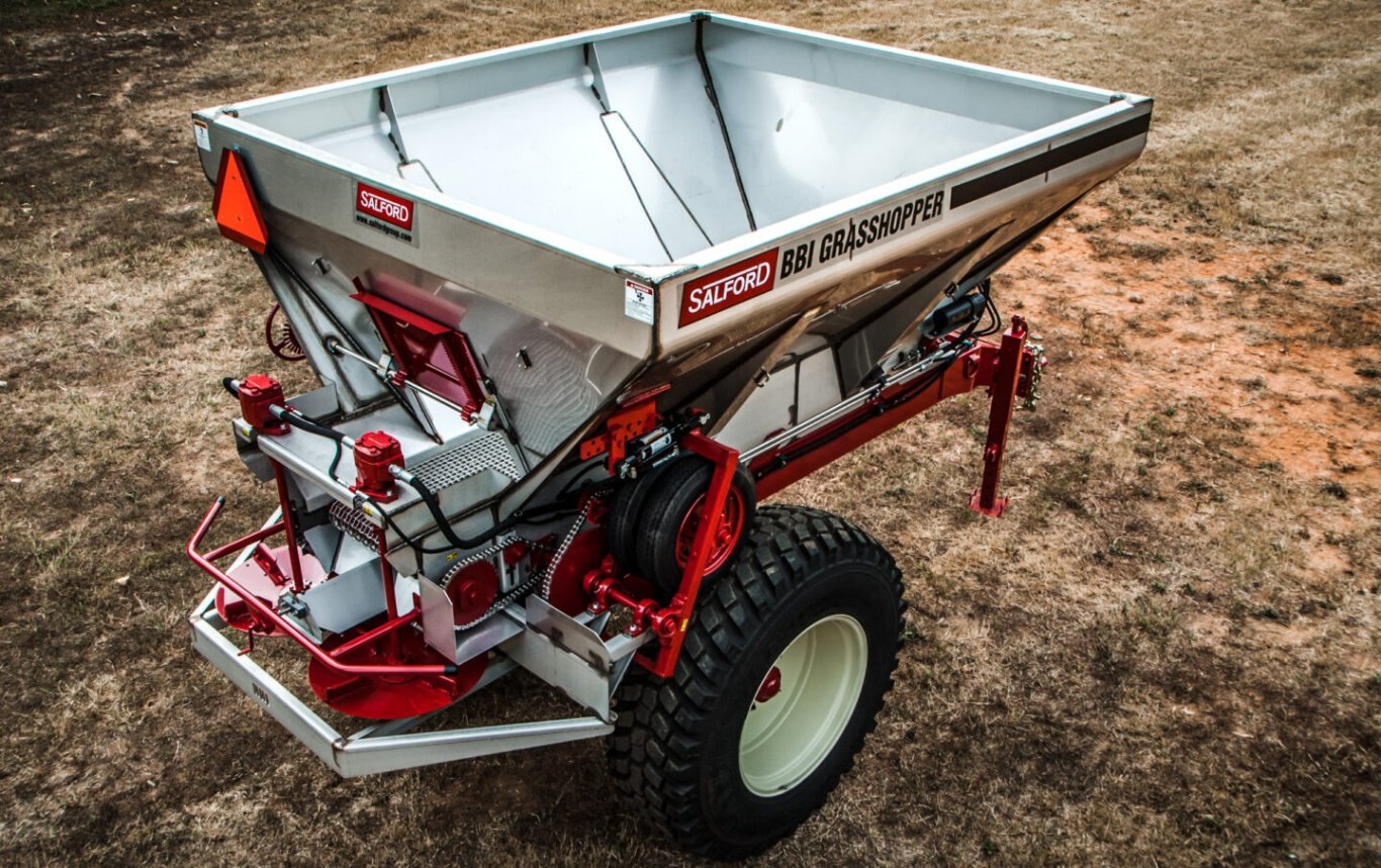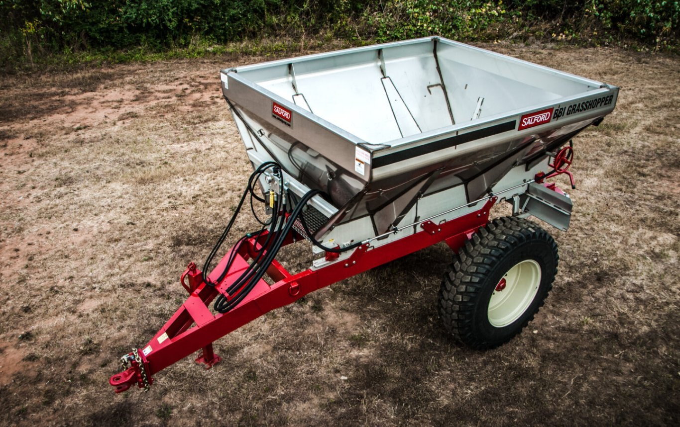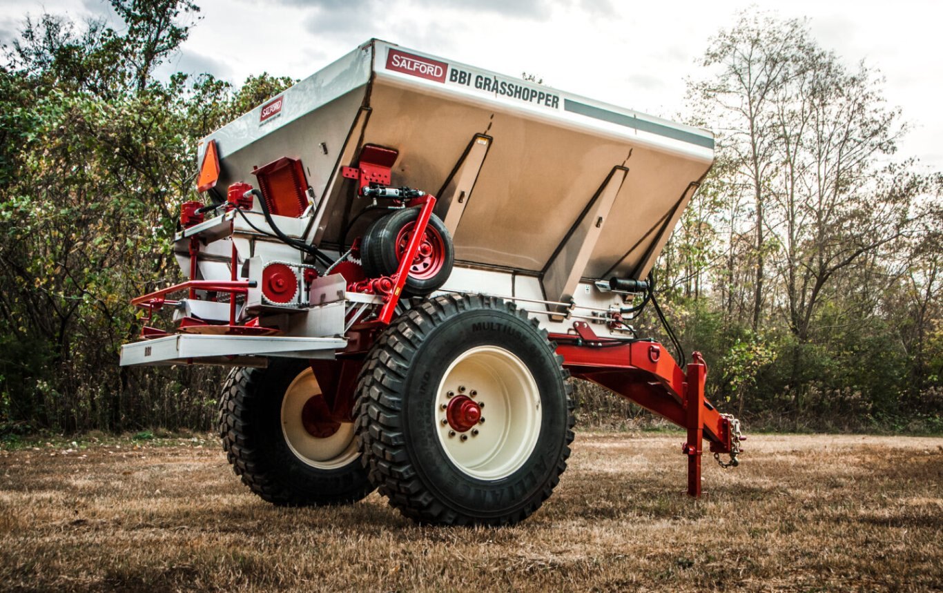 | The Grasshopper pull-type spreader is the original mid-season, top-dress applicator from Salford. Designed to hold 5 tons of fertilizer or 7 tons of lime, this machine delivers the nutrients your emergent crop needs to maximize yield potential. With high ground-clearance for row cropping and top dressing and flotation tires to minimizing soil compaction, this spreader achieves precision application in both row crop and sod/turf farm environments. The Grasshopper is built for durability and precision, featuring ground-wheel-drive mechanics, and the original Salford spreader system for a consistently wider, flatter spread pattern. |