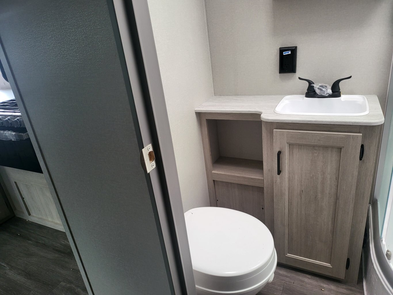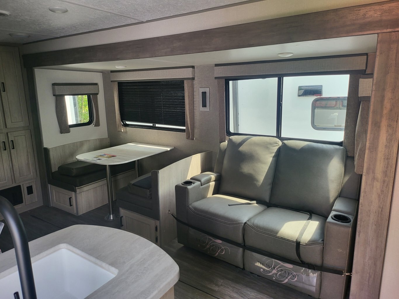 Two Private Queen Bedrooms – RV queen bed in the front master and a rear queen bedroom (optional bunkhouse-to-queen conversion available). Sit-Lounge-Sleep Sofa – Flexible seating and extra sleeping space in the main living area. Booth Dinette – Comfortable dining or sleeping solution with great window views. Fully Equipped Outdoor Camp Kitchen – Includes fridge, sink, storage, and grill with utensil drawers. Pass-Through Storage – Pack everything you need with ease. Washer/Dryer Prep – Located in the front bedroom closet for extended stays. Smooth Fiberglass Siding – Durable, sleek exterior finish for lasting appeal. Power Awning with Multicolor LEDs – Adds instant outdoor living space with lighting to match your vibe.