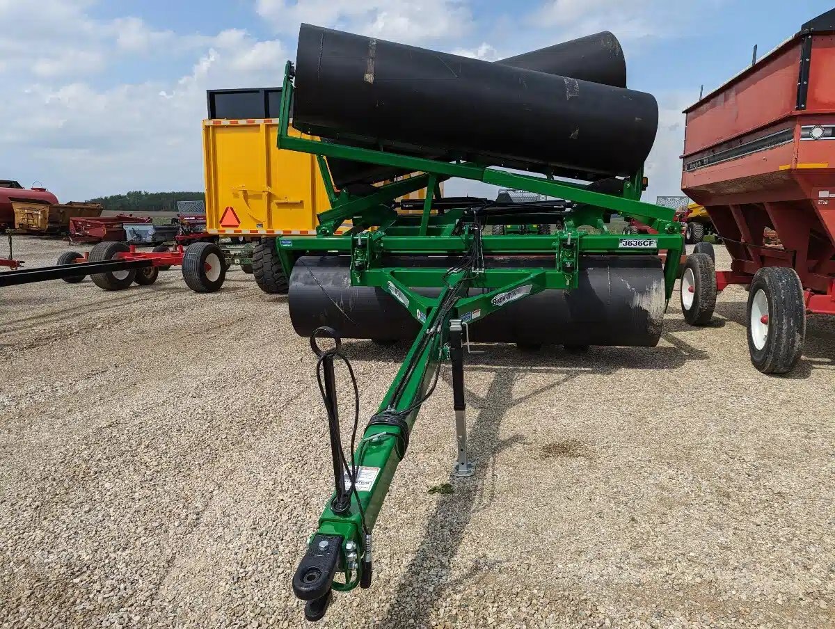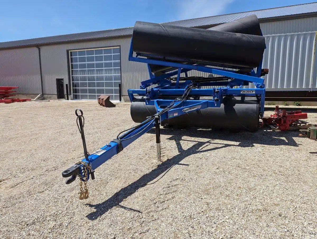 36' wide, 36" drum, thickness 7/16", lights, transport wheels, extendable drawbar, mud scrapers, safety chain and SMV, weight 13,500 lbs.