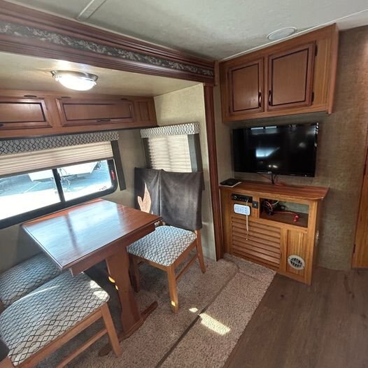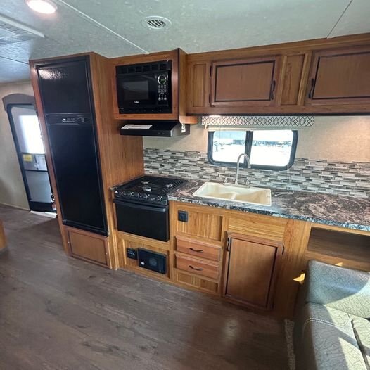 Discover the joys of travel with the 2017 StarCraft Launch Ultralight 24 RLS. This travel trailer is designed for those who seek adventure without sacrificing comfort. The spacious rear living area features a plush sofa and a large dinette, perfect for relaxing or entertaining guests. The fully equipped kitchen includes a three-burner stove, oven, microwave, double-door refrigerator, and ample counter space, making meal preparation a breeze.