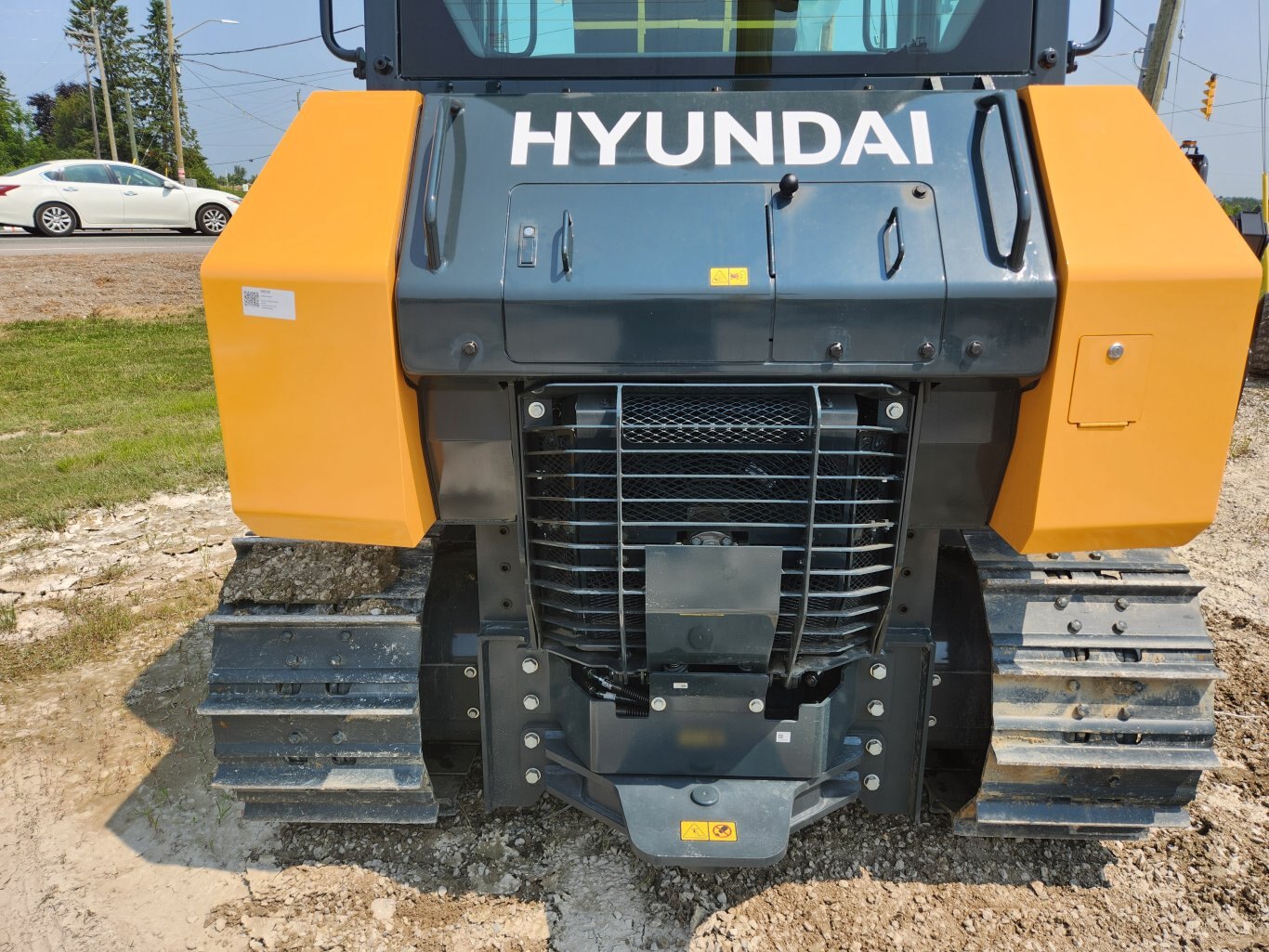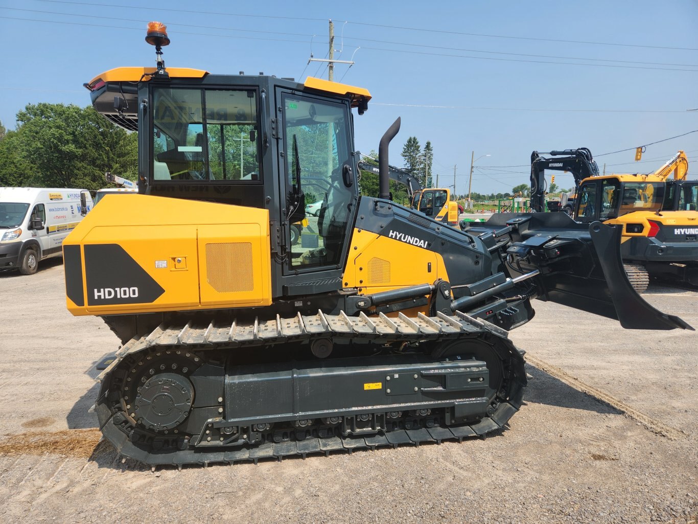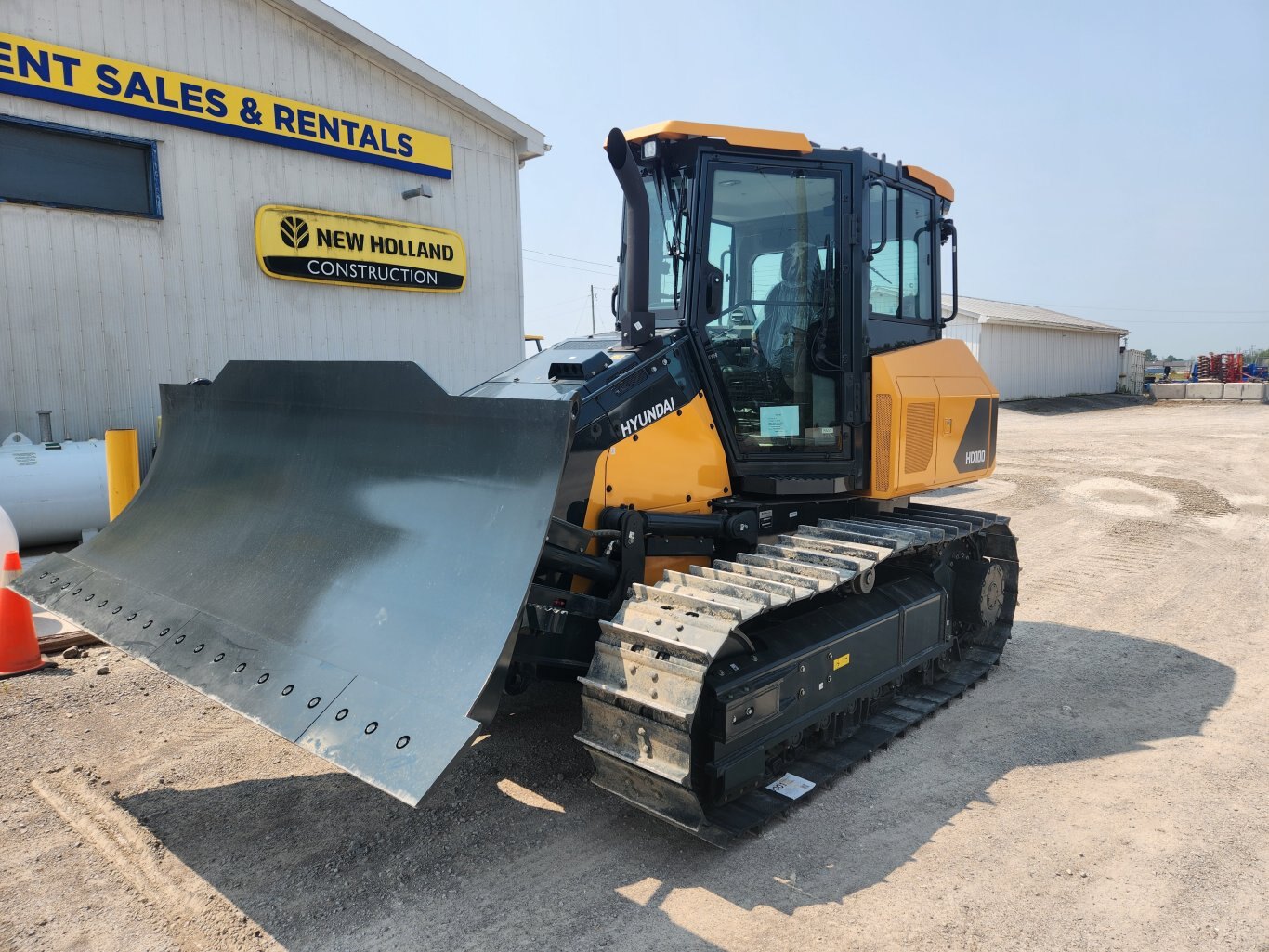 BRAND NEW Hyundai HD100 dozer, 23589 lb. operating weight, Hyundai 4 cylinder engine with 122 gross horsepower, 8" touch display with audio, 2D Smart Blade Control, Beacon light, Hi-Mate Remote Management System, Rear view camera, LED lights, 20" track shoes, Towing drawbar, 8'11" blade width with 2.9 cubic yard capacity, 3 year/3000 Hour Warranty