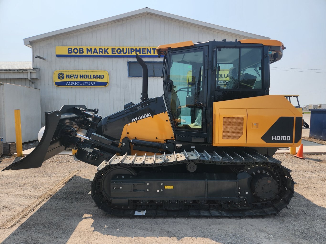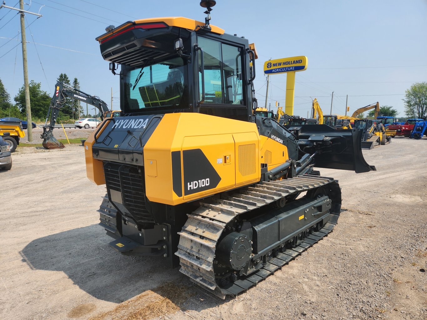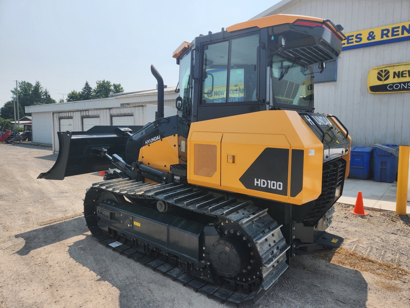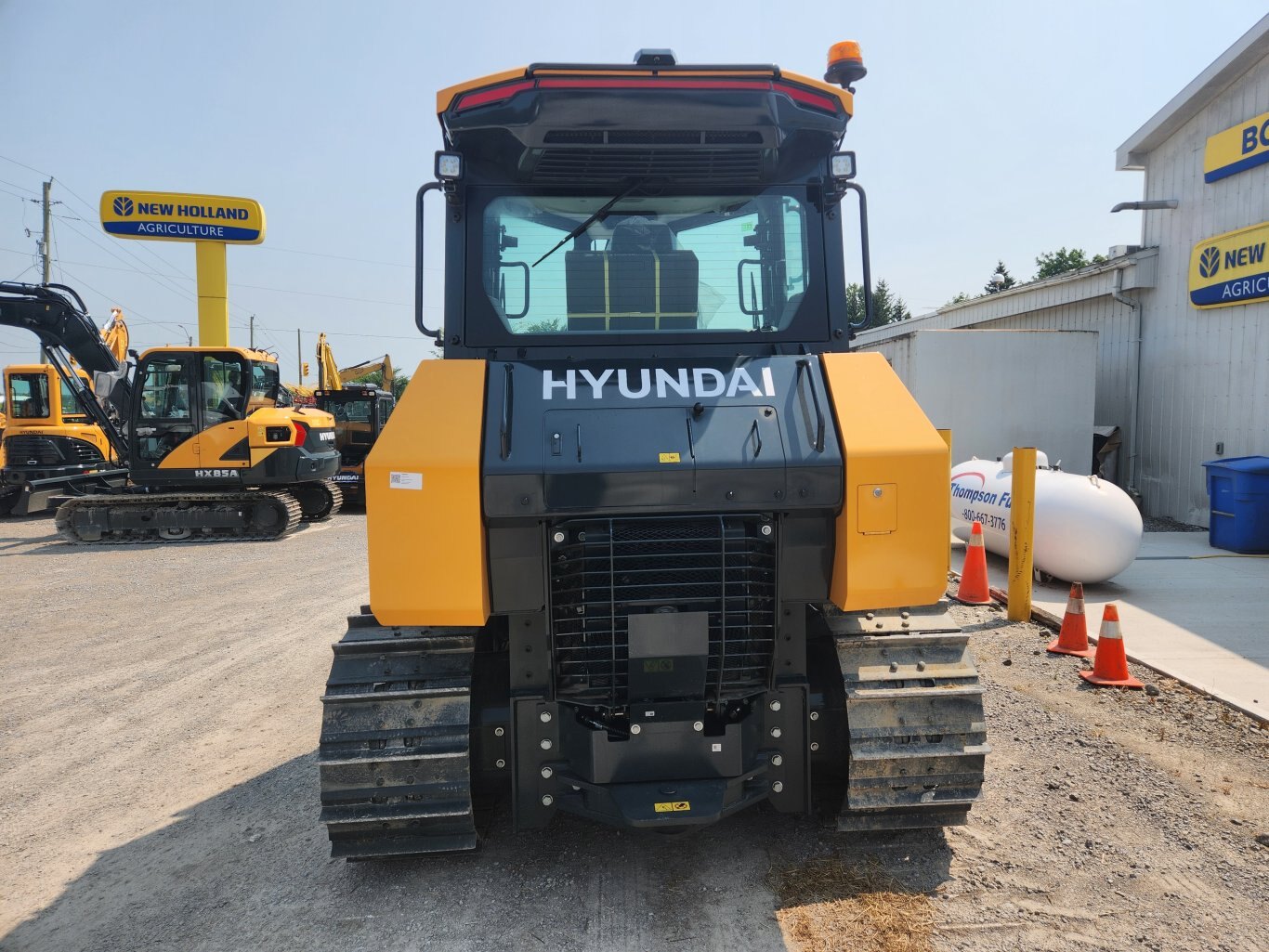 BRAND NEW Hyundai HD100 dozer, 23589 lb. operating weight, Hyundai 4 cylinder engine with 122 gross horsepower, 8" touch display with audio, 2D Smart Blade Control, Beacon light, Hi-Mate Remote Management System, Rear view camera, LED lights, 20" track shoes, Towing drawbar, 8'11" blade width with 2.9 cubic yard capacity, 3 year/3000 Hour Warranty