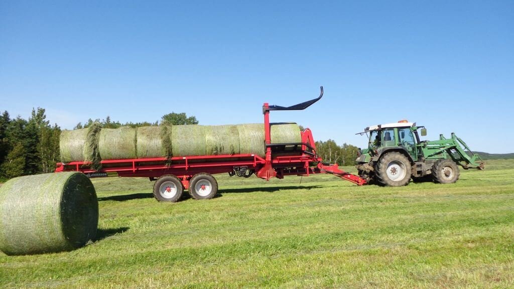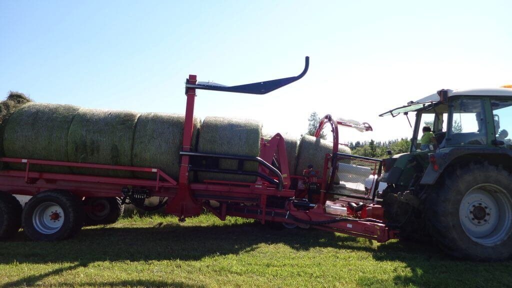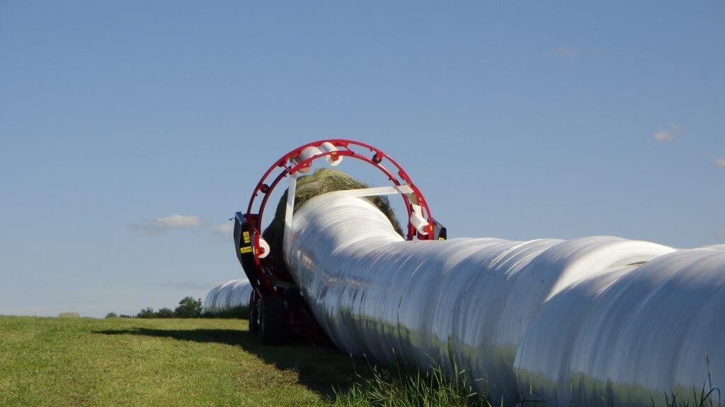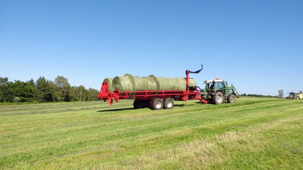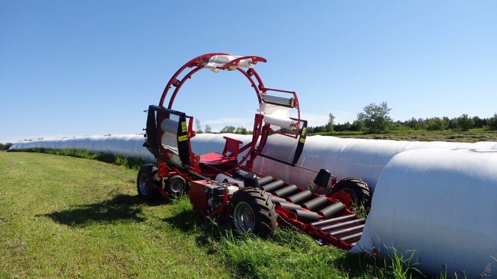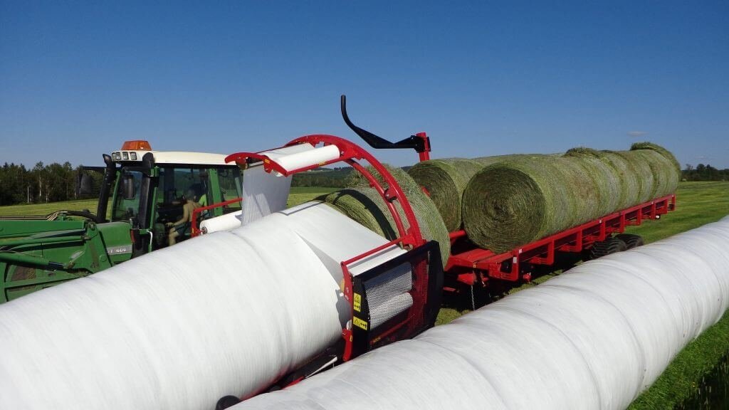 The high-performance WRAPTOR™ is the combination of a self-loading trailer and an in-line wrapper. When labor is hard to fi nd or you need to do things quickly, this all-in-one system allows you to do the transportation and wrapping with only one operator and one tractor. The WRAPTOR™ is the ultimate system for loading, transporting and wrapping. Designed for collecting wet or dry hay, it offers the fastest performance on the market.The trailer collects and transports 14 bales (4 ft × 4 ft.) at a time and attaches to the wrapper without additional equipment. The remote control offers the possibility to do everything from the seat of the tractor. |