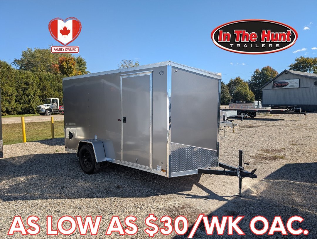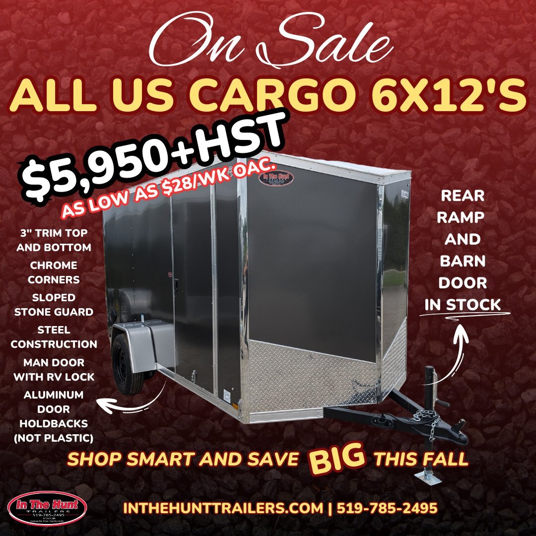 REG: $6,795 SALE: $5,950 The 2026 US Cargo 6x12 Steel Enclosed with Barn Doors in Pewter is available now at In The Hunt Trailers. Financing available OAC for as low as $28/week OAC. This unit comes with the following options: - Pewter - Single 3500lb axles - 6\'1\'\' Interior height - 16” on center floors and walls - 1 piece aluminum roof - Flow thru vents - Rear Ramp - Chrome front and rear corners *The price you see is the price you pay plus HST and licensing - NO HIDDEN FEES. We make every effort to ensure accuracy, but occasional errors may occur. Pricing, specifications, and availability can change without notice. We reserve the right to correct any inaccuracies. For the most up-to-date details, please visit our website, email inthehunt@bellnet.ca or give us a call at 519-785-2495.