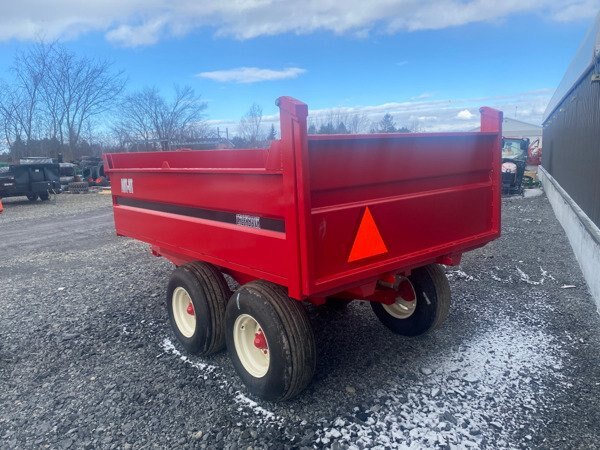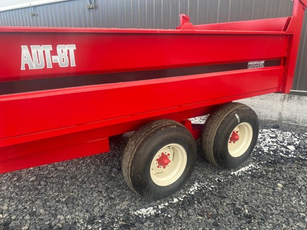 8 Ton capacity farm duty dump trailer, 6'3" wide x 10' long, 24" deep sides plus gussets, auto unlocking tailgate, 12.5-15 12 ply tires, swivel hitch , wheels track on 60" center so great for rock picking