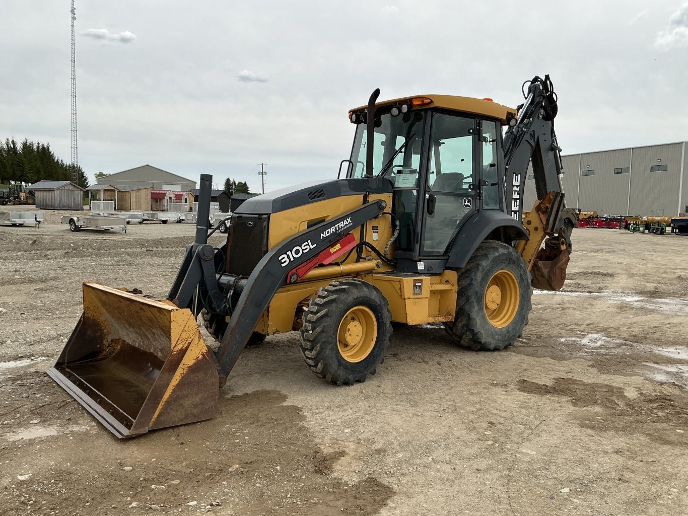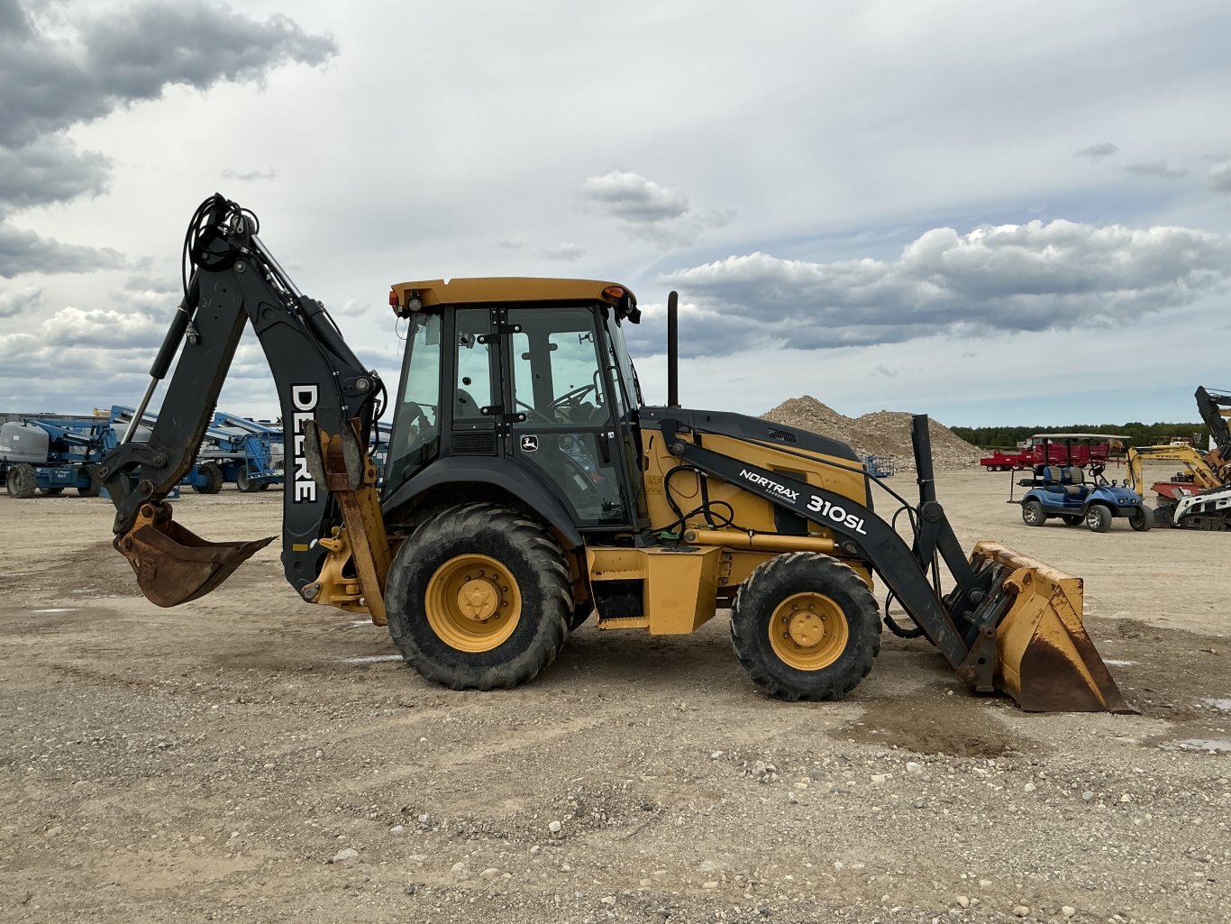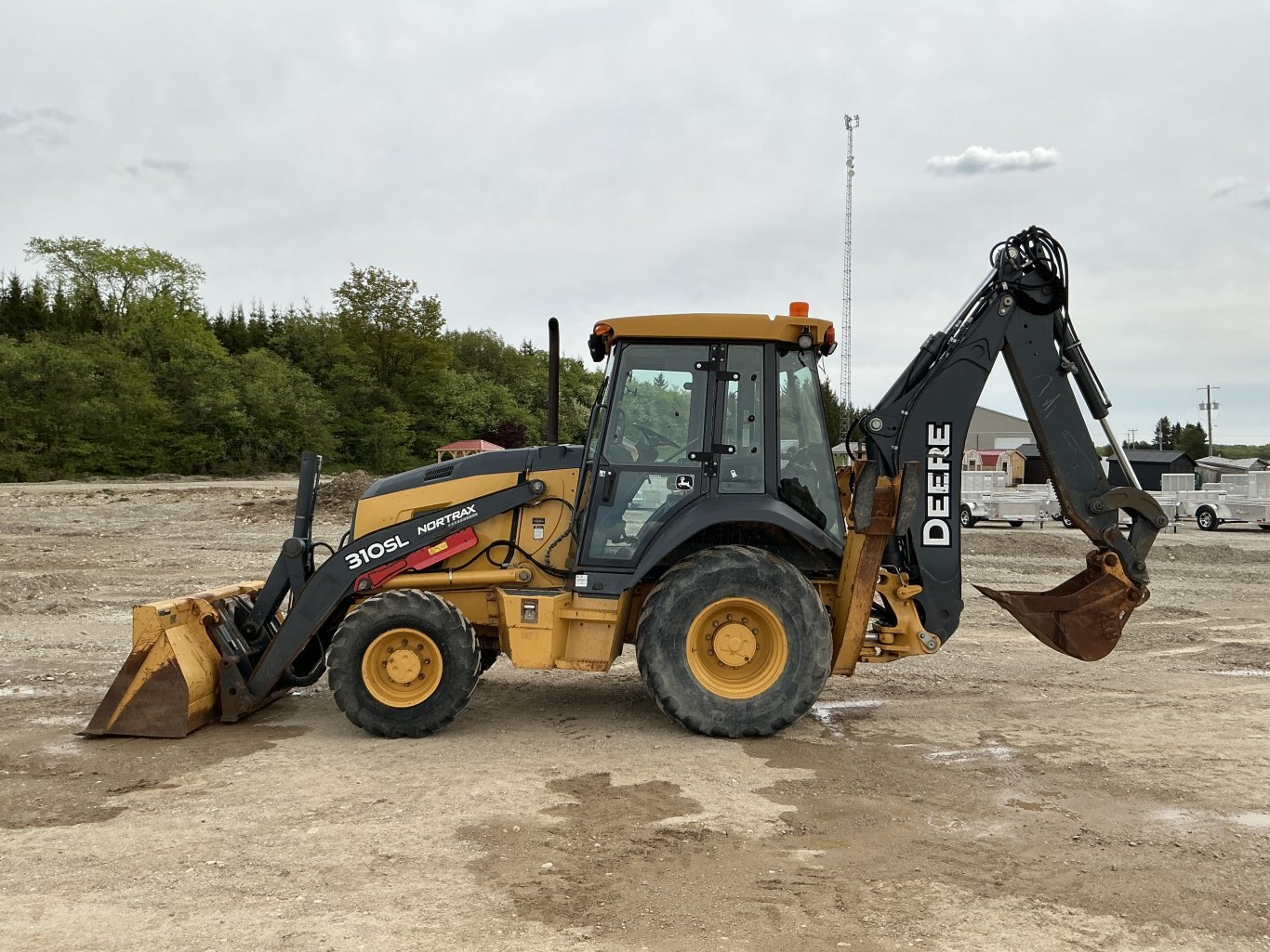 2016 John Deere 310SL Backhoe powered by 101 hp turbo diesel. 4X4 powershift transmission. Front hydraulic quick connect. Rear manual quick connect and auxiliary hydraulics. Weight around 16,356 lbs. Enclosed heated cab. Pilot controls. Extendahoe. Hour meter reads 5380. Located in Maxwell Ontario