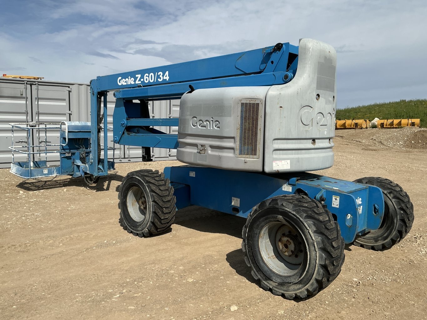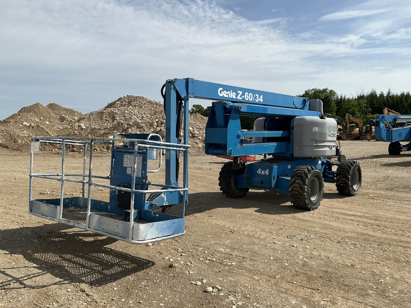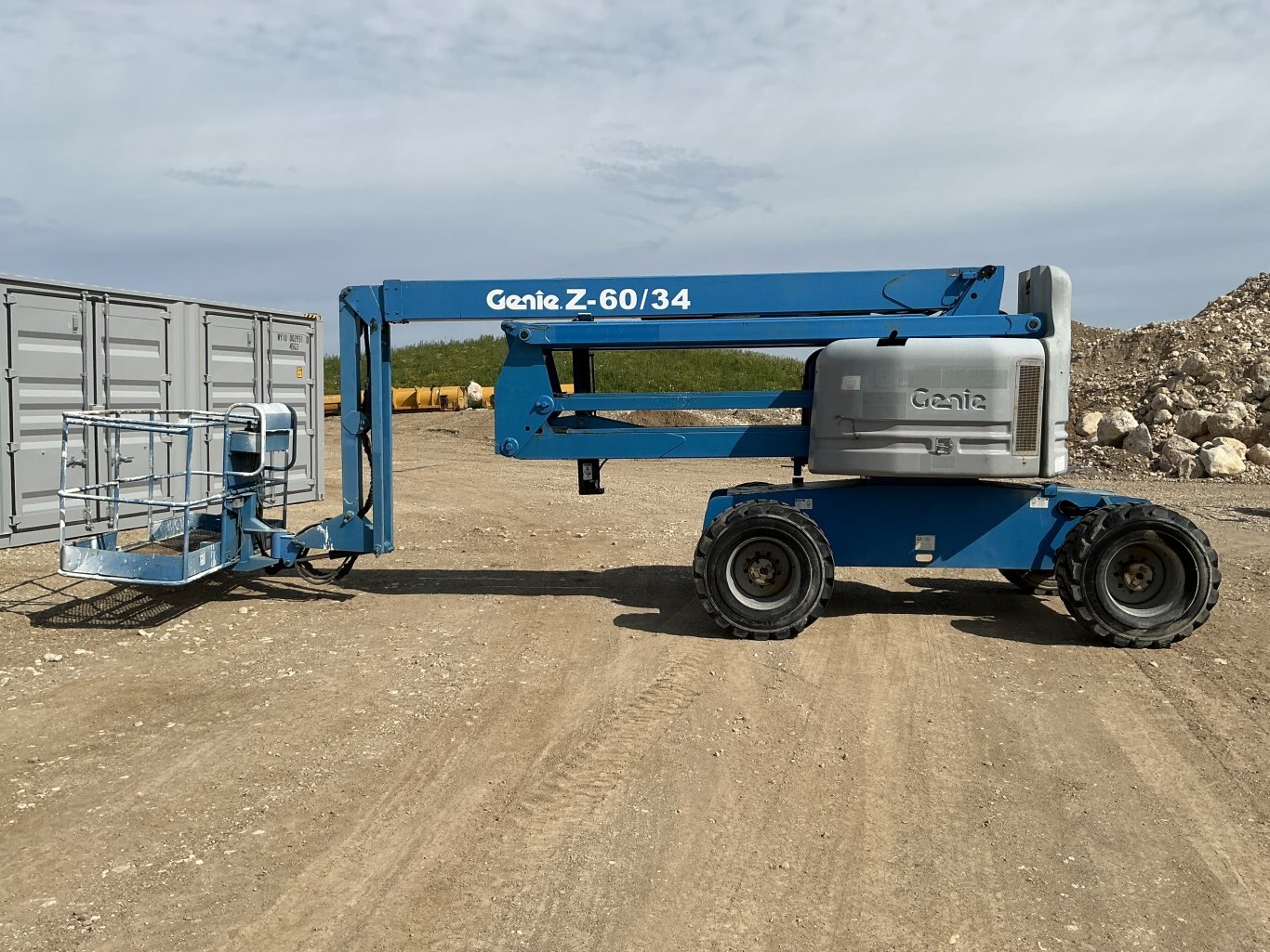 Articulating man lift, 2007Genie model Z60/34. This boom lift has a platform height of 60 feet giving 66 feet working height and 36 feet outreach. 4WD driveline and powered by a Ford gas engine. Machine weighs around 24,000 lbs. Valid structural sticker till Aug 2027. Hour meter show 4096.