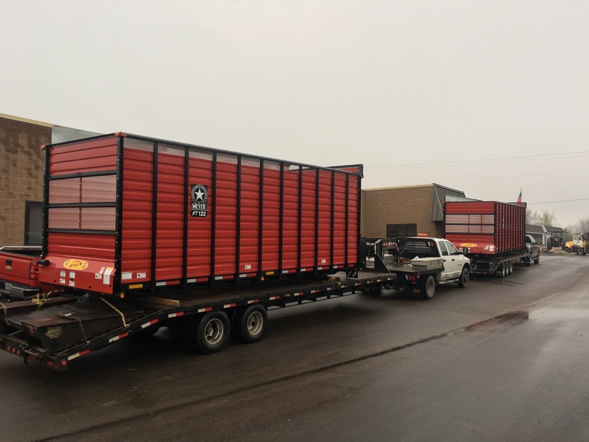 The Meyer RT100 Series Rear Unload forage box is available from 16-22' in length for Wagon, Cart or Truck Mount applications. It comes standard with a roof assemble but is available in an open top version. It features hydraulic geardrive, all-steel frame and a 7'5" insterior width. Fast, safe, efficient rear unloading of your product - at a price you can afford! High sides, gate delay and poly floor system all available.