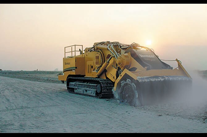 | Efficiently conduct surface mining extraction, remove ground surface, or create a smooth, level area for site preparation, road construction or soil remediation with the T1255III Terrain Leveler® SEM chain drive attachment. When you need to get in and extract material close to the high wall, this attachment gives you the capability to cut along a vertical high wall. It has a maximum cutting depth of 27 in (68.6 cm). The chains are driven by low- speed, high-torque hydrostatic motors. |