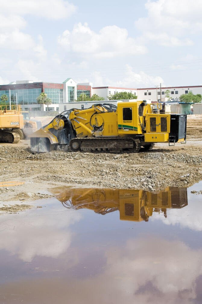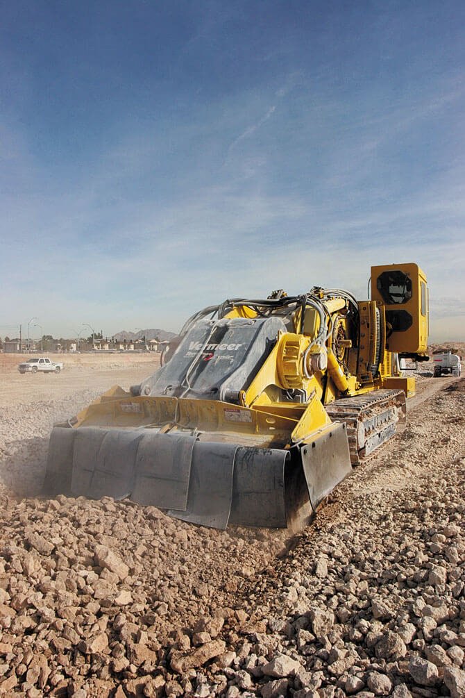 | Efficiently conduct surface mining extraction, remove ground surface, or create a smooth, level area for site preparation, road construction or soil remediation with the T1255III Terrain Leveler® SEM chain drive attachment. When you need to get in and extract material close to the high wall, this attachment gives you the capability to cut along a vertical high wall. It has a maximum cutting depth of 27 in (68.6 cm). The chains are driven by low- speed, high-torque hydrostatic motors. |