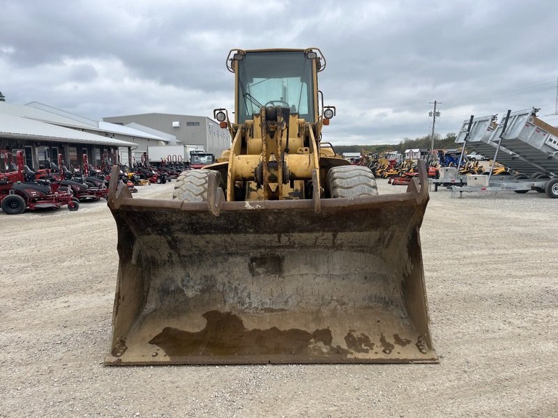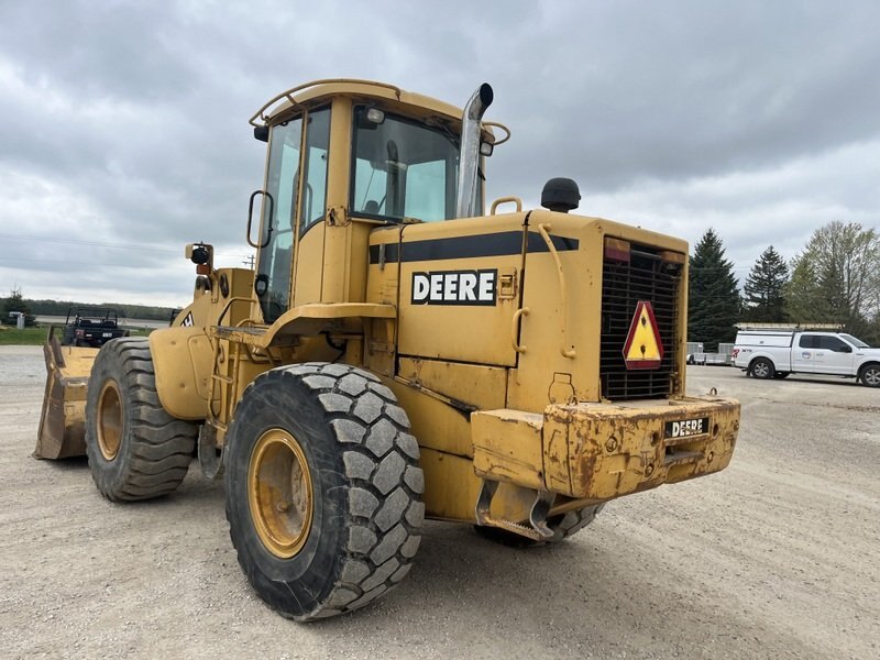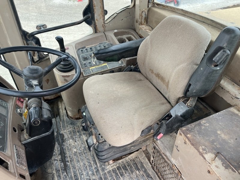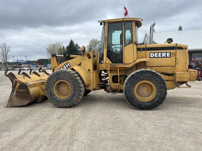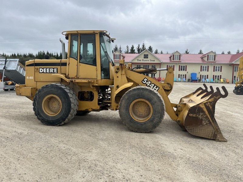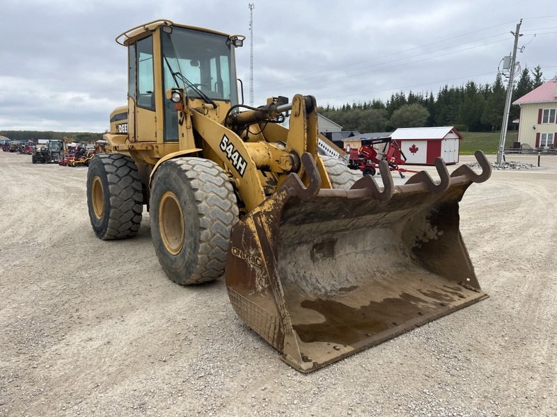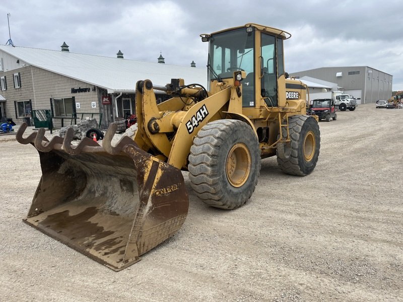2000 John Deere 544h pay loader is powered by a 130Hp John Deere diesel engine. Enclosed heated cab with glass intact. Unit weights about 26,000lbs. Hour meter reads 9067.
