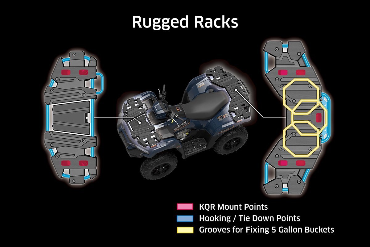 - Rugged cargo racks with plastic cargo rack covers (including KQR mounts, tie-down points, bucket retainer grooves)