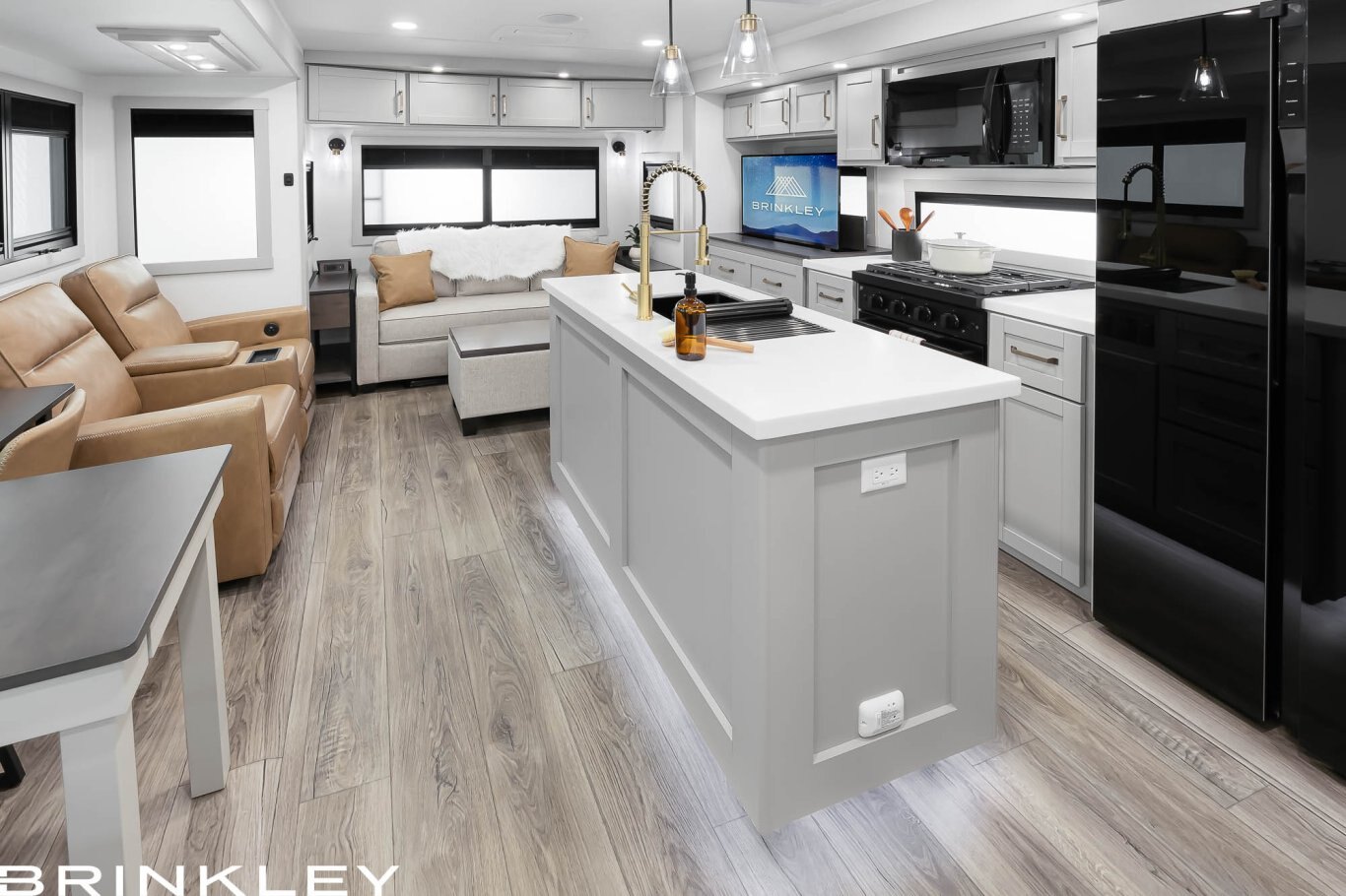 Discover your perfect escape or full-time home in the Brinkley Model Z AIR 310. This expansive layout is meticulously crafted as the ultimate luxury experience for couples. Indulge culinary passions in the stunning residential gourmet kitchen, then relax or entertain in the inviting conversational living room. The private, spacious bedroom serves as a tranquil sanctuary, featuring a standard queen bed flanked by nightstands (a king bed option is available). With abundant, thoughtfully integrated storage throughout, this coach easily accommodates extended trips or full-time living. As part of the Model Z AIR line represents the pinnacle of luxury travel trailers, delivering uncompromising comfort, quality, and residential style for the most discerning RVer.