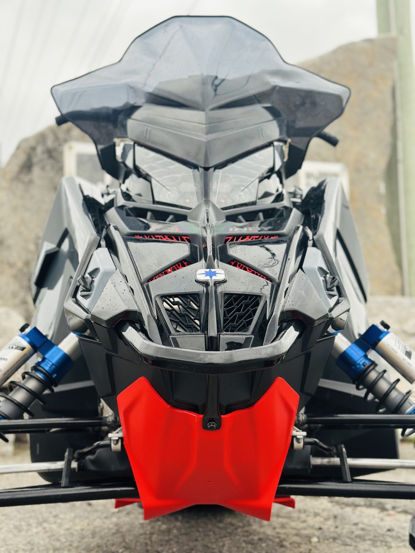 Serviced and ready for the trails. 6,401 kms. Red grill inserts, red skid plate, 8" Cobra carbides, mirrors, electric visor plug, red rear bumper and passenger seat with heated grips only.