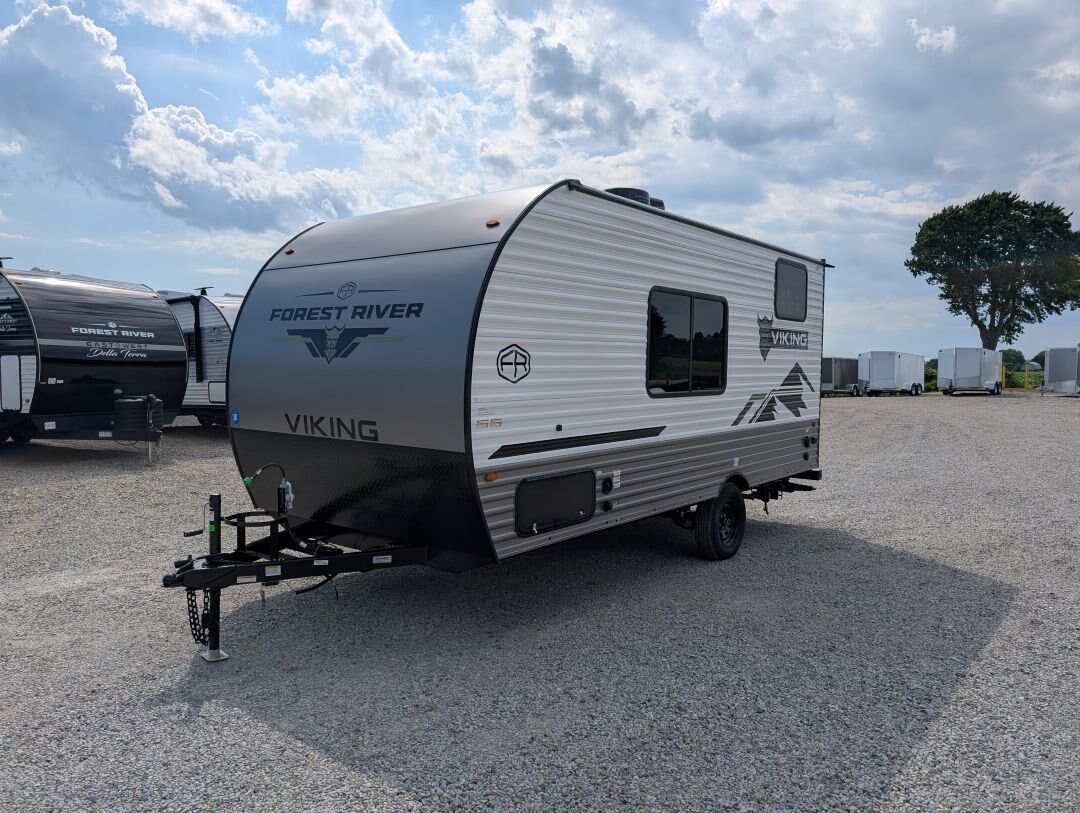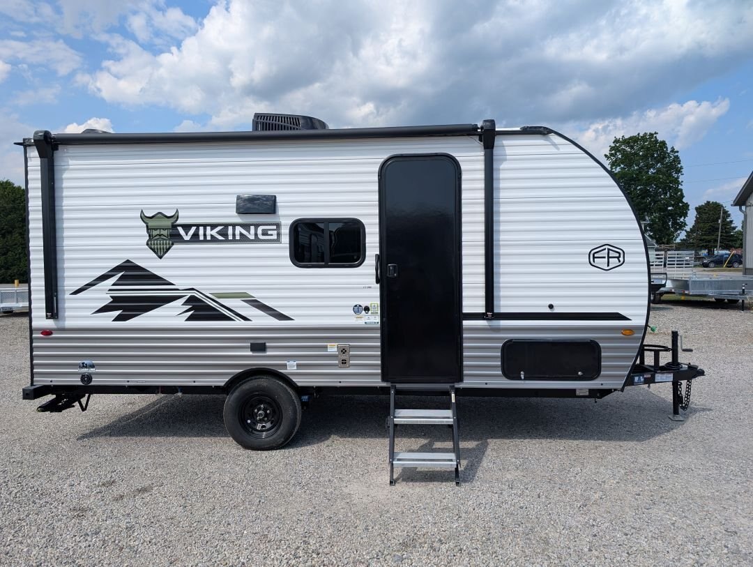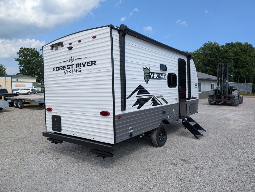 Looking for a compact, lightweight travel trailer packed with features? The 2026 Viking 17SBH has gotten TONS of upgrades this year and is perfect for weekend getaways or extended trips. This Viking travel trailer combines function, quality, and value in one towable package. A top choice for couples or small families ready to explore the great outdoors. Designed for easy towing and maximum comfort, this bunkhouse model offers premium features at an unbeatable value. NEW IN 2026: All appliances upgraded to General Electric. 10 cu. Ft. fridge upgrade, energy-efficient tankless on-demand water heater, thermofoil countertops, AND MORE This unit includes the following options: Camping Made Easy Package: Enjoy hassle-free setup and comfort with solid entry steps, power awning with LED lighting, foot-flush toilet, black tank flush, battery disconnect, smooth metal front, solar prep, magnetic baggage door latches, USB charging ports, backup camera prep, friction-hinge entry door, omni-directional TV antenna, 12V bathroom vent fan, LCI ladder prep, and more. Quality & Appliance Package: Includes a large 10 cu. ft. GE 12V refrigerator, stainless steel GE 2-burner cooktop, microwave, 13.5K BTU roof-mounted AC, 20K BTU propane furnace, and an energy-efficient tankless on-demand water heater. Durable Construction: Built on a BAL NXG frame with powder coating and Huck bolt assembly, 5/8” tongue and groove plywood flooring, seamless one-piece TPO roof membrane, thermofoil countertops, and drop-edge finishes for long-lasting durability. Tow-Ready Essentials: Comes with a spare tire and carrier, electric brakes, easy-lube axles, and Canadian coding for compliance and convenience. Bonus Coverage: Includes RVIA and MVSA seals, plus Travel Easy Roadside Assistance for added peace of mind on the road.