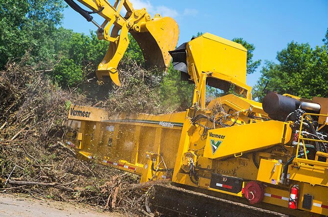 Self-propels into the most remote jobsites on 20-in (50.8-cm) or 24-in (61-cm) double grouser track pads. High ground clearance and sealed rollers help keep material from building up in the track system. State-of-the-art wireless remote lets you operate the machine from up to 300 ft (91.4 m) away. An optional discharge blower system distributes processed wood over a large area or can fill a covered trailer from the rear end. |
