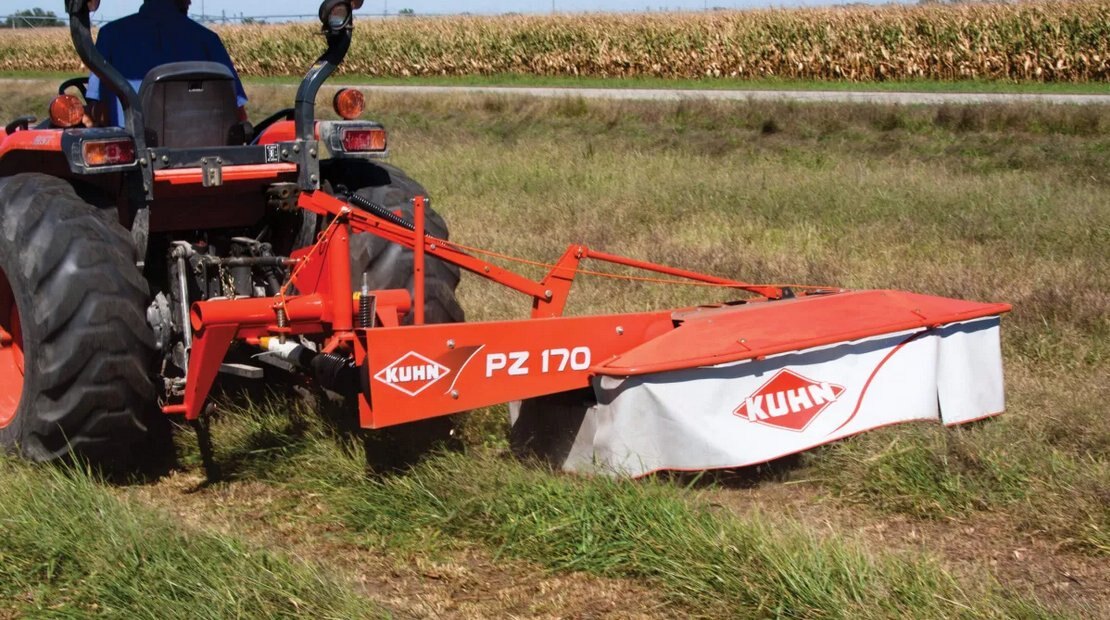 The 5'5" cutting width of the KUHN PZ 170 drum mower provides small-acreage landowners and hay producers with significantly improved capacity and productivity compared to most sicklebar mowers. This drum mower easily cuts through tall, thick and tangled grasses with minimal horsepower requirements. |