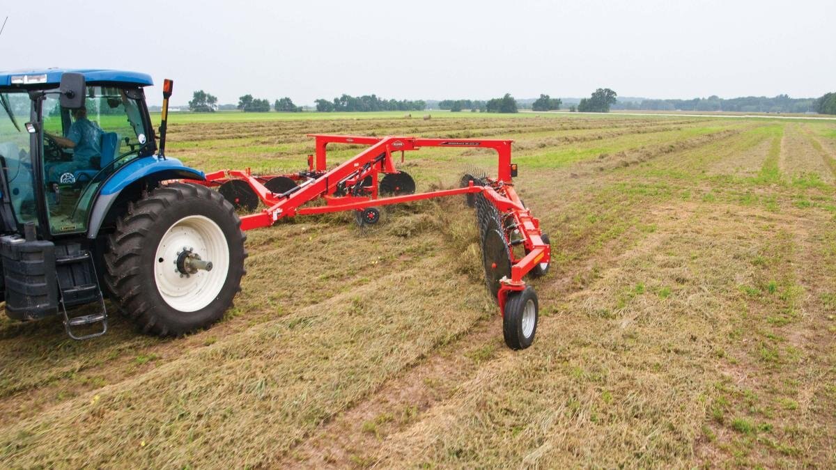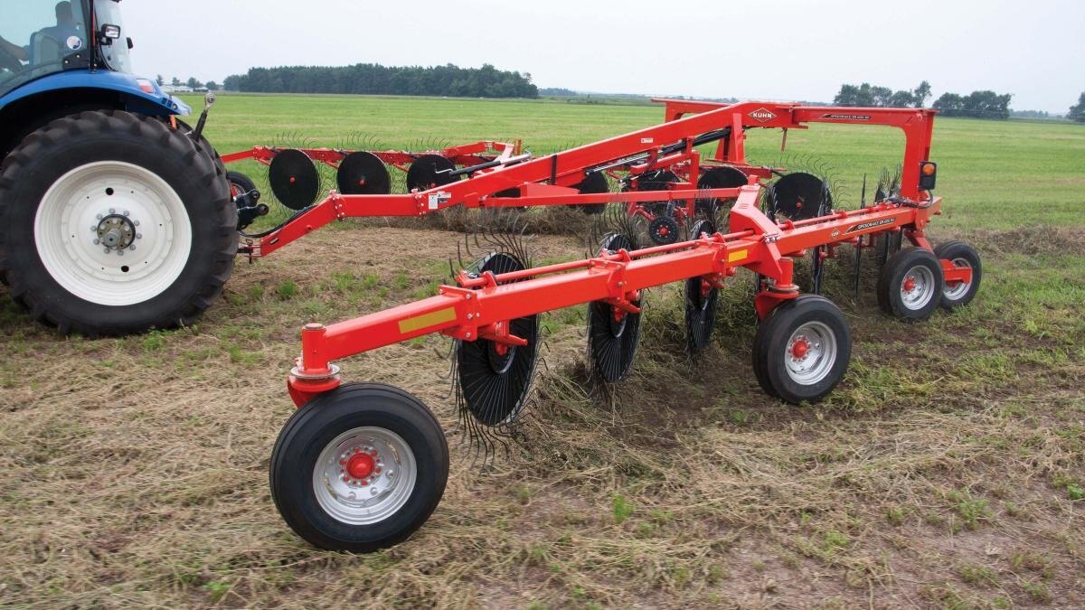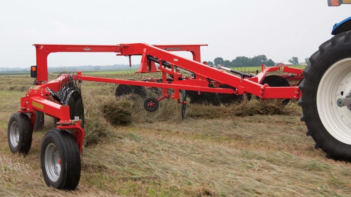KUHN SR 600 GII Series SpeedRake® wheel rakes are high-capacity, bi-fold rakes designed to meet the needs of today’s progressive hay producers. The innovative design provides unparalleled maneuverability on the road and in the field. These rakes can turn on a dime! The SR 600 GII Series rakes provide clean raking while preserving crop stubble, as well as optimized windrow formation, for a total package that offers the ultimate combination of productivity and quality performance.