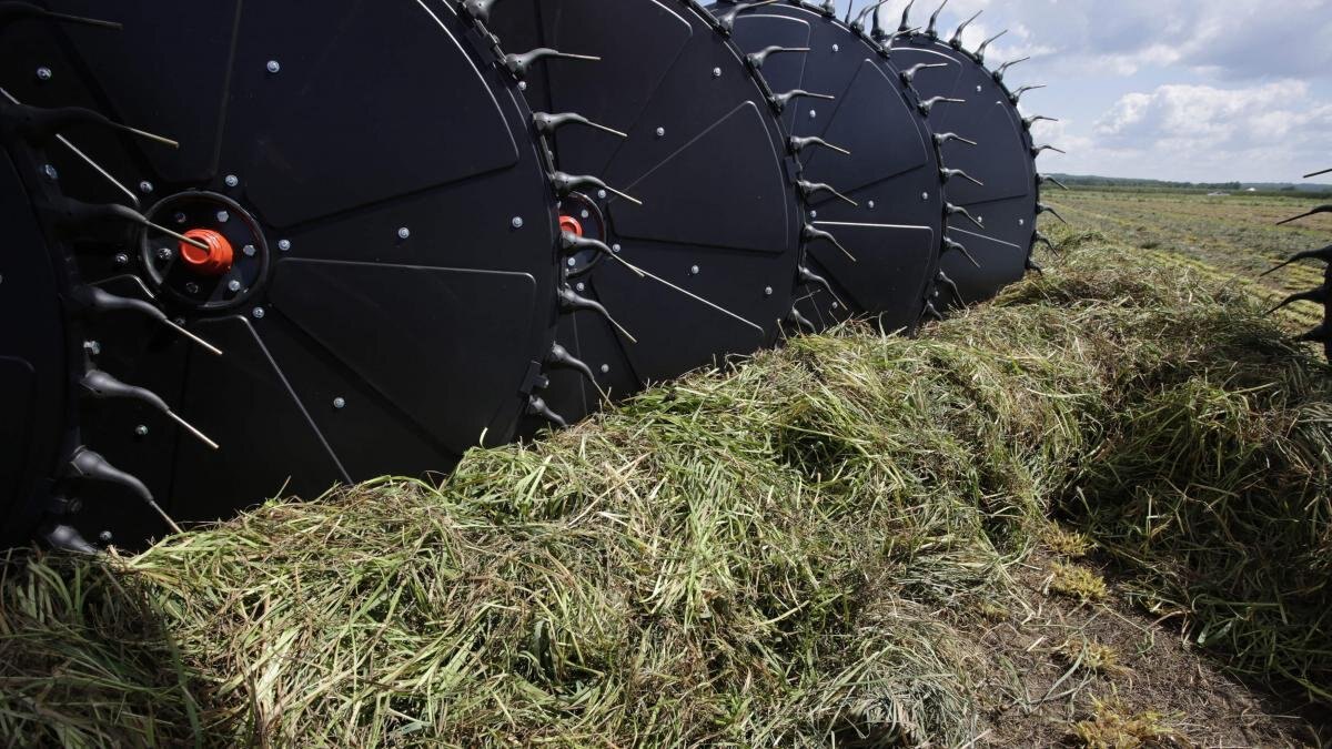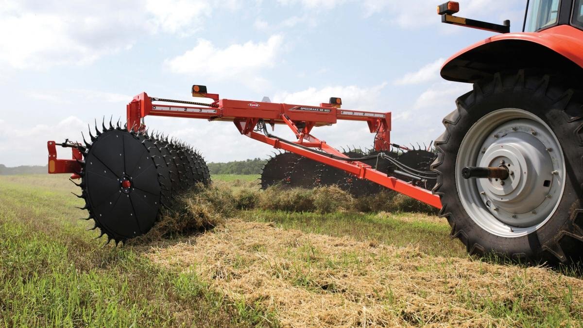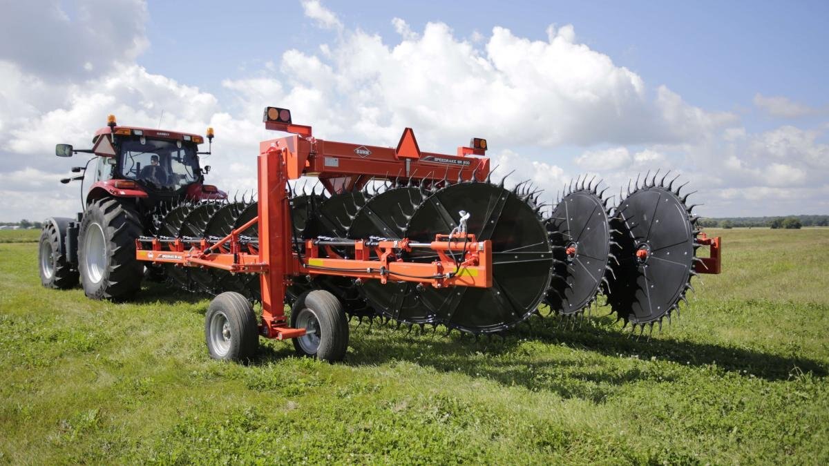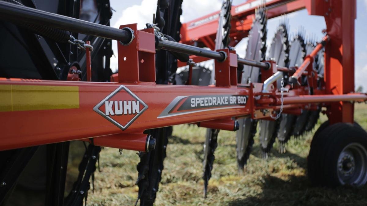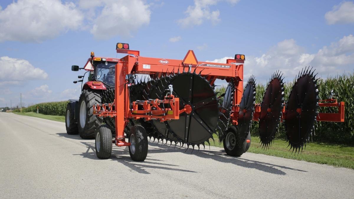 KUHN SR 800 Series SpeedRake® wheel rakes are the latest to join KUHN's highly trusted rake lineup. All of the wheels on the SR 800 are angled vertically at 8.7°, allowing the crop to be lifted off the ground and transitioned easily from wheel to wheel for a well-formed, uniform and fluffy windrow. With the easily expandable design, the rake beam can increase from 17 to 19 rake wheels, thus increasing working widths from 27' to 29' 6". The simple folding design of the SR 800 allows the operator to extend the frame and angle the rake beam to match up with a variety of mower widths and windrow styles to fit any type of operation. The ground pressure on the rake wheels can be easily adjusted on each beam to get the best crop pickup for a clean looking field. |
