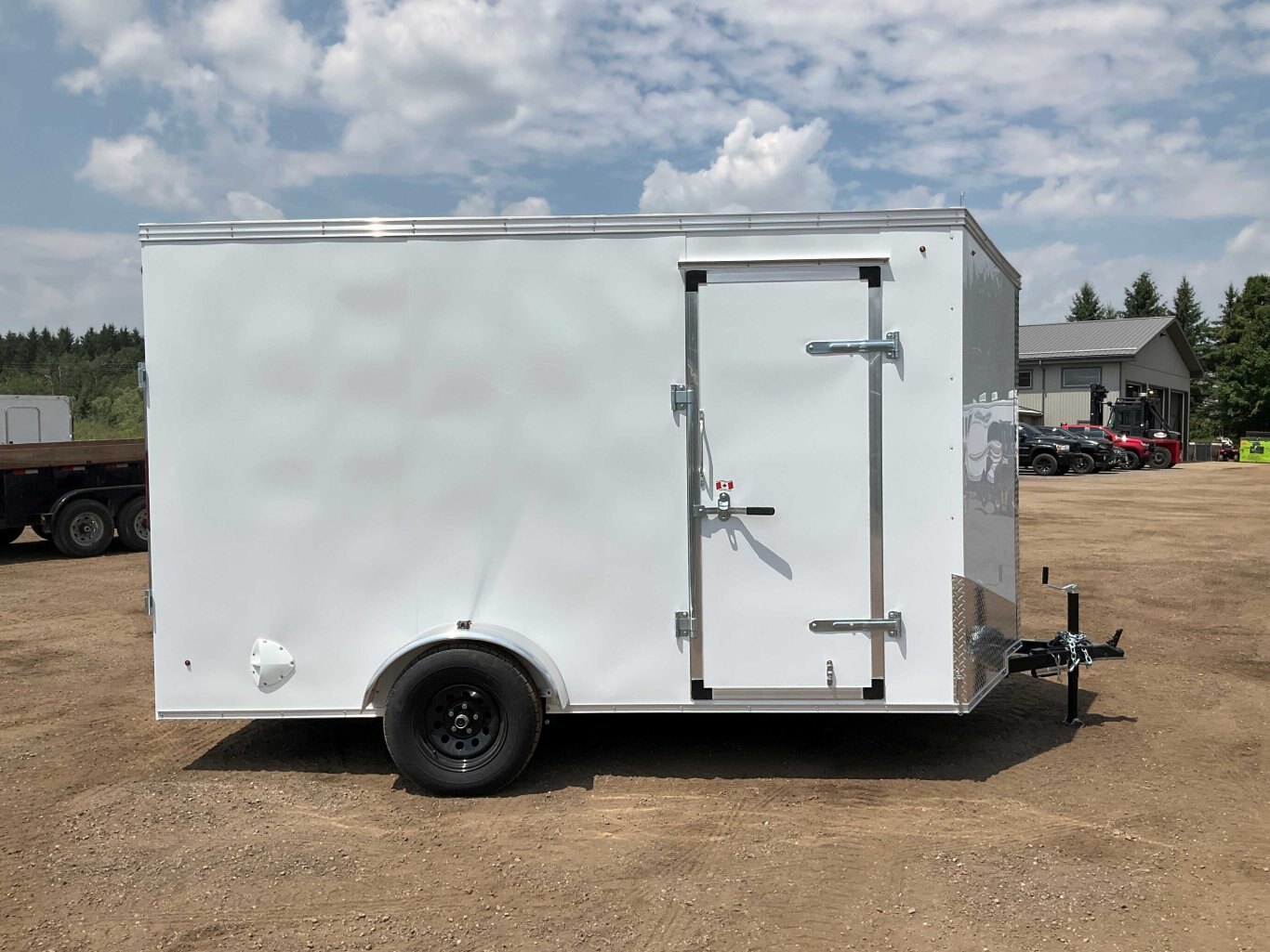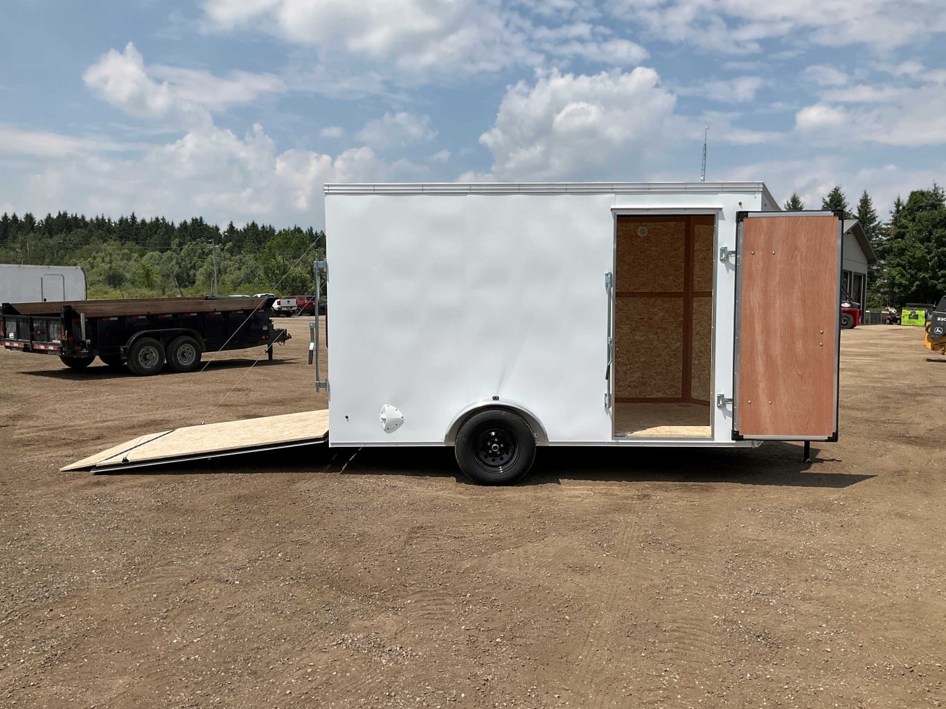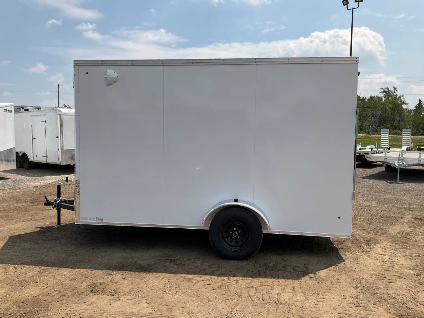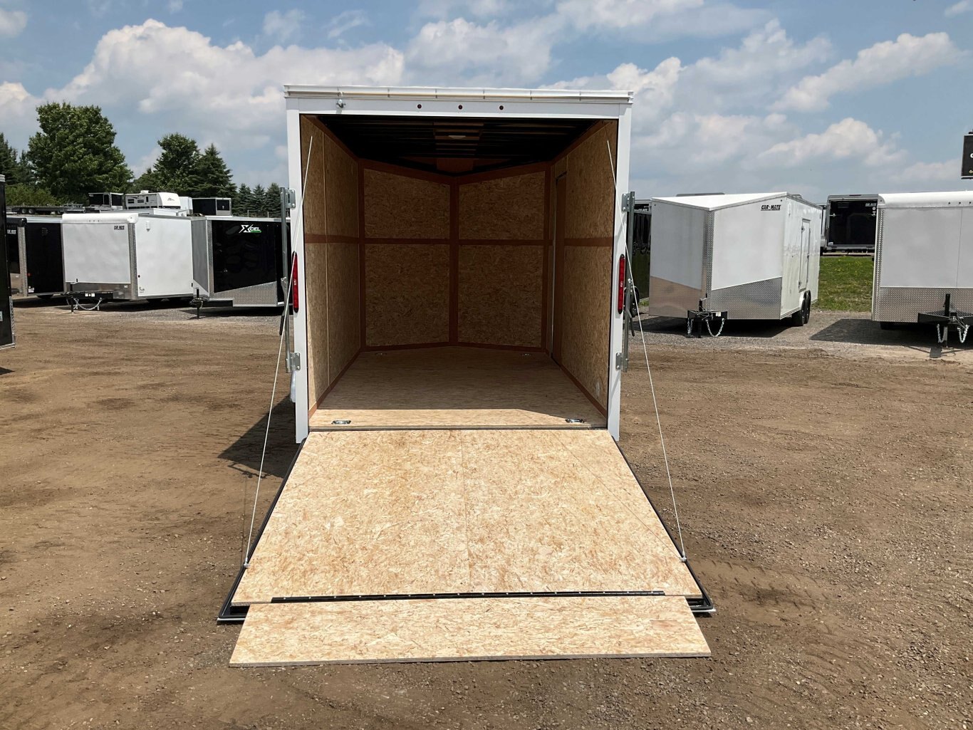 3500LB GVWR, 3500LB Spring Drop Axle with EZ Lube Hubs, Electric Brakes, 15 Inch Radial Tires, Electric Brakes, 2' Sloped V-Nose, 7' Tall, .030 White Screwless Exterior, 32" Side Man Door, Rear Ramp Door with Cable Assist, 3/8" Wood Lined Walls, 3/4" Marine Grade Floor, Seamless Aluminum Roof, 16" On Centre Walls/Floor/Roof, 2 Wall Vents, 12V Dome Light and Switch, 4 D-Ring Tie Downs, ATP Stone Guard, 2" Ball Coupler, A-Frame Tongue Jack with Sand Pad, Sealed LED Lighting