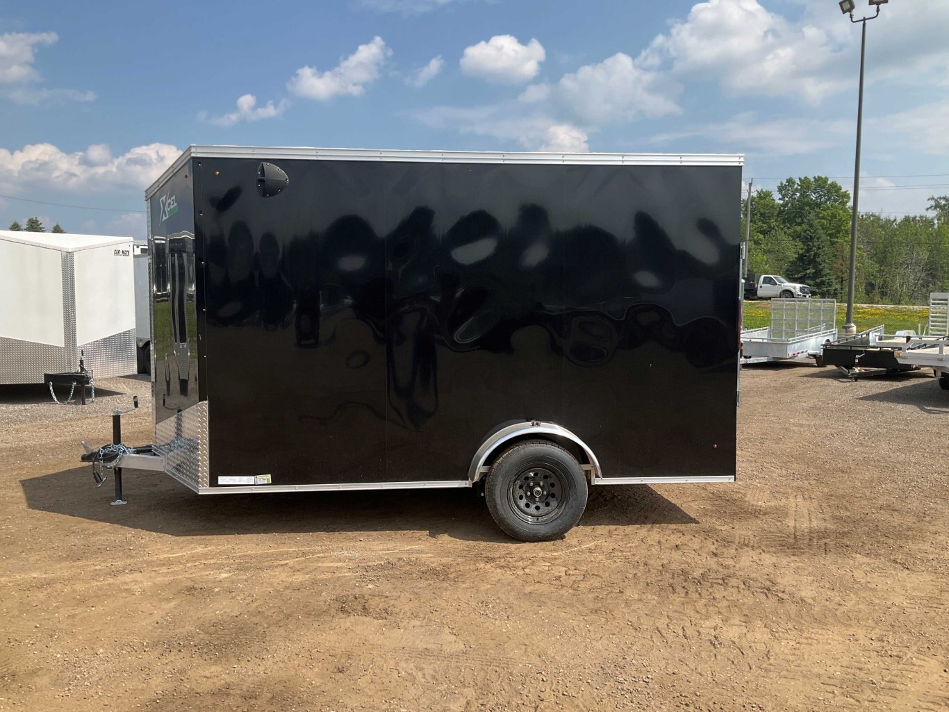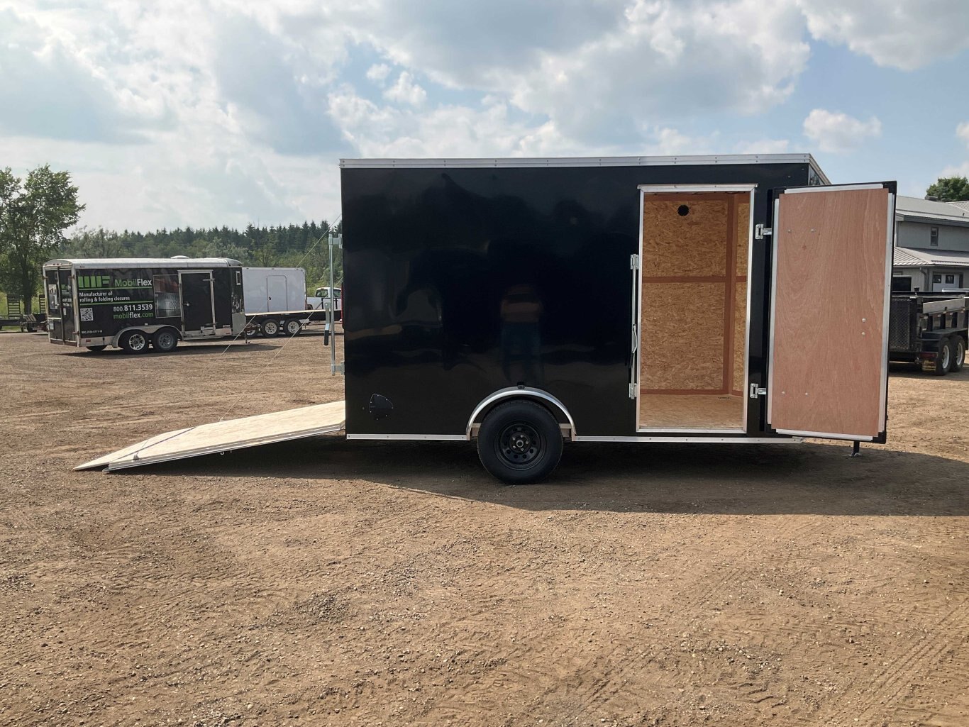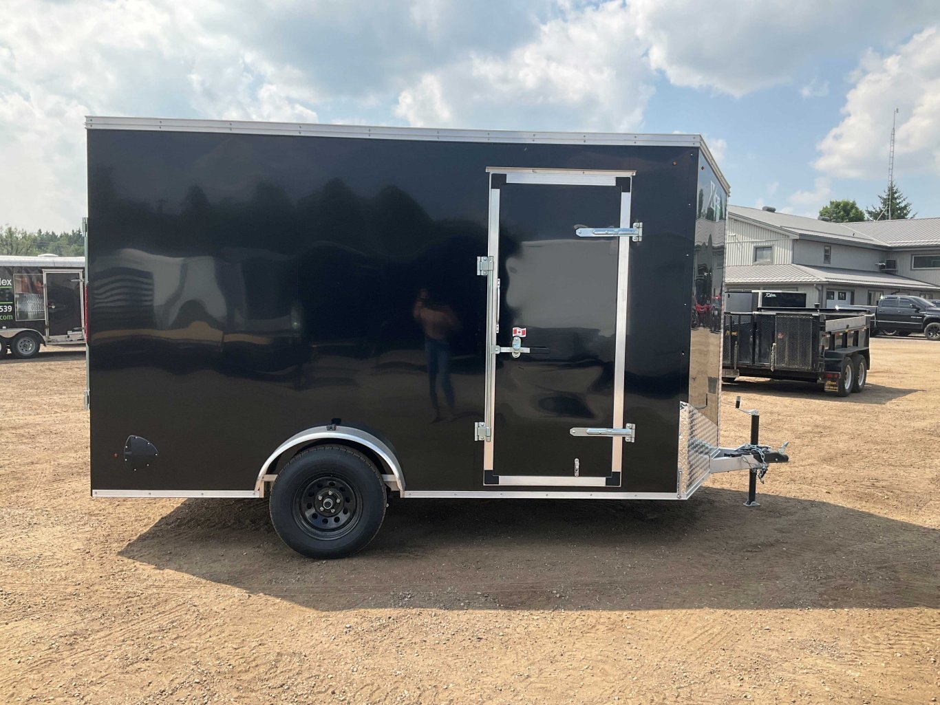 3500LB GVWR, 3500LB Spring Drop Axle with EZ Lube Hubs, Electric Brakes, 15 Inch Radial Tires, Electric Brakes, 2' Sloped V-Nose, 7' Tall, .030 Black Screwless Exterior, 32" Side Man Door, Rear Ramp Door with Cable Assist, 3/8" Wood Lined Walls, 3/4" Marine Grade Floor, Seamless Aluminum Roof, 16" On Centre Walls/Floor/Roof, 2 Wall Vents, 12V Dome Light and Switch, 4 D-Ring Tie Downs, ATP Stone Guard, 2" Ball Coupler, A-Frame Tongue Jack with Sand Pad, Sealed LED Lighting