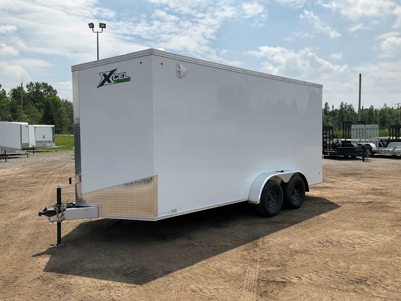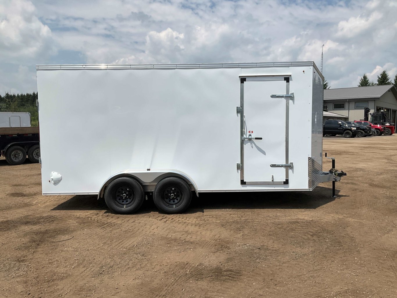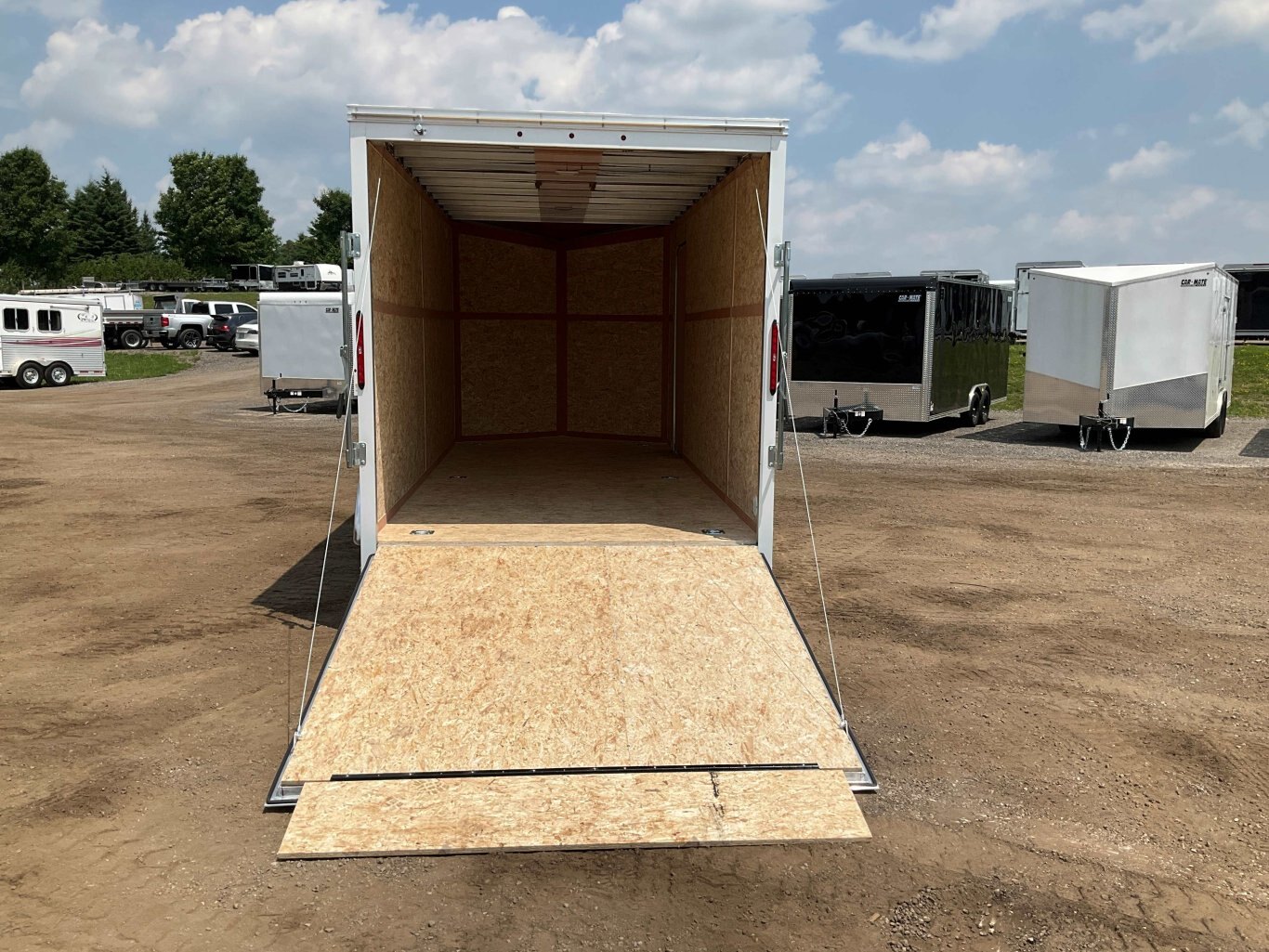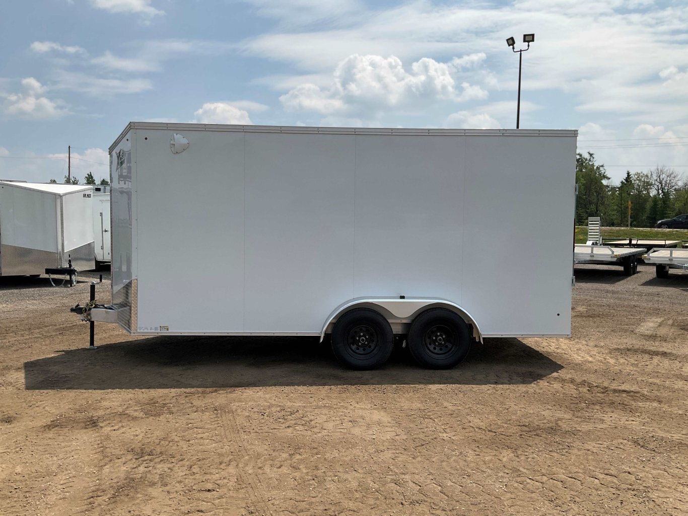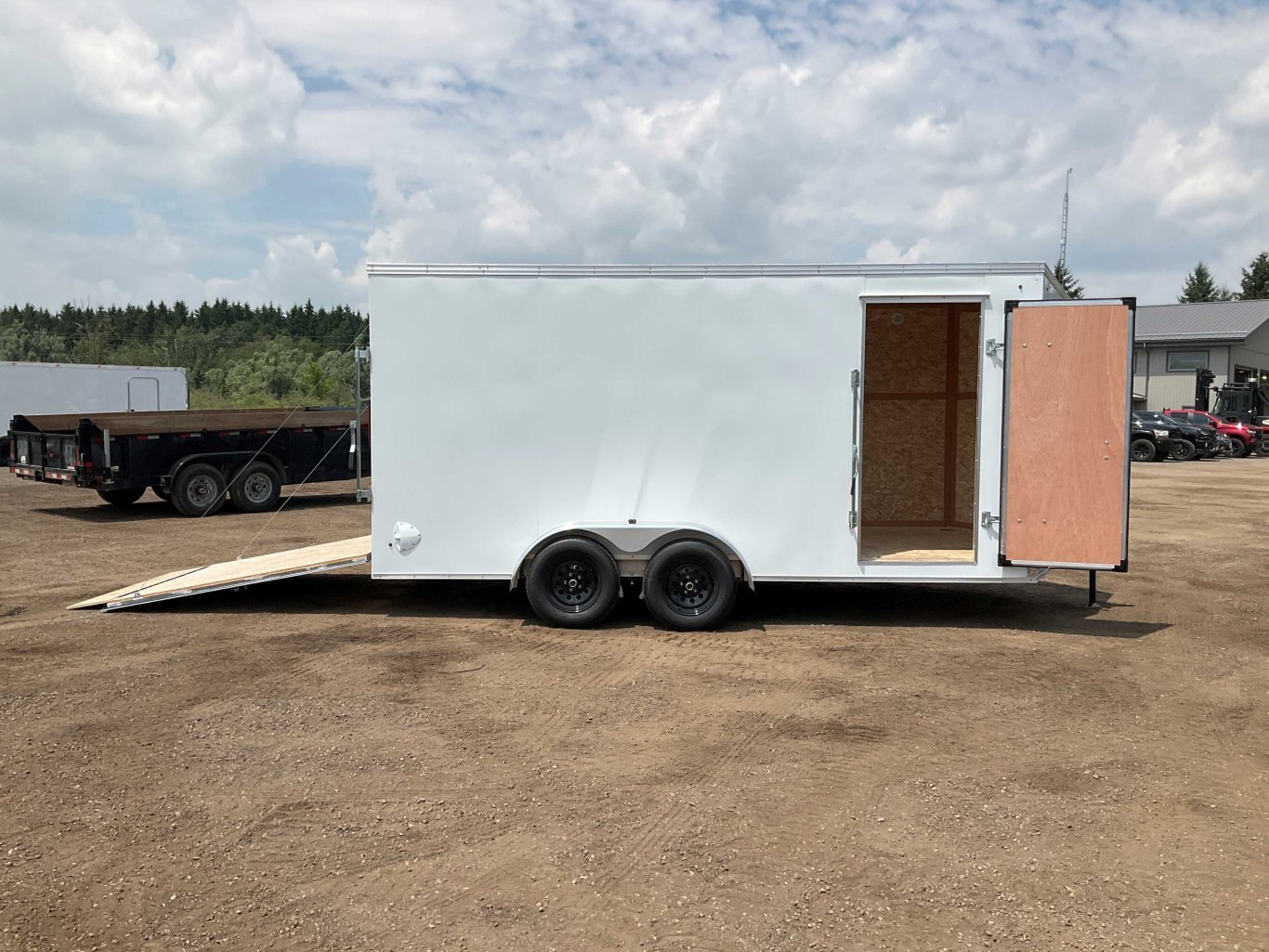7000LB GVWR, 2 3500LB Spring Drop Axle with EZ Lube Hubs, Electric Brakes, 15 Inch Radial Tires, Electric Brakes, 2' Sloped V-Nose, 7' Tall, .030 White Screwless Exterior, 32" Side Man Door, Rear Ramp Door with Cable Assist, 3/8" Wood Lined Walls, 3/4" Marine Grade Floor, Seamless Aluminum Roof, 16" On Centre Walls/Floor/Roof, 2 Wall Vents, 12V Dome Light and Switch, 6 D-Ring Tie Downs, ATP Stone Guard, 2-5/16" Ball Coupler, A-Frame Tongue Jack with Sand Pad, Sealed LED Lighting