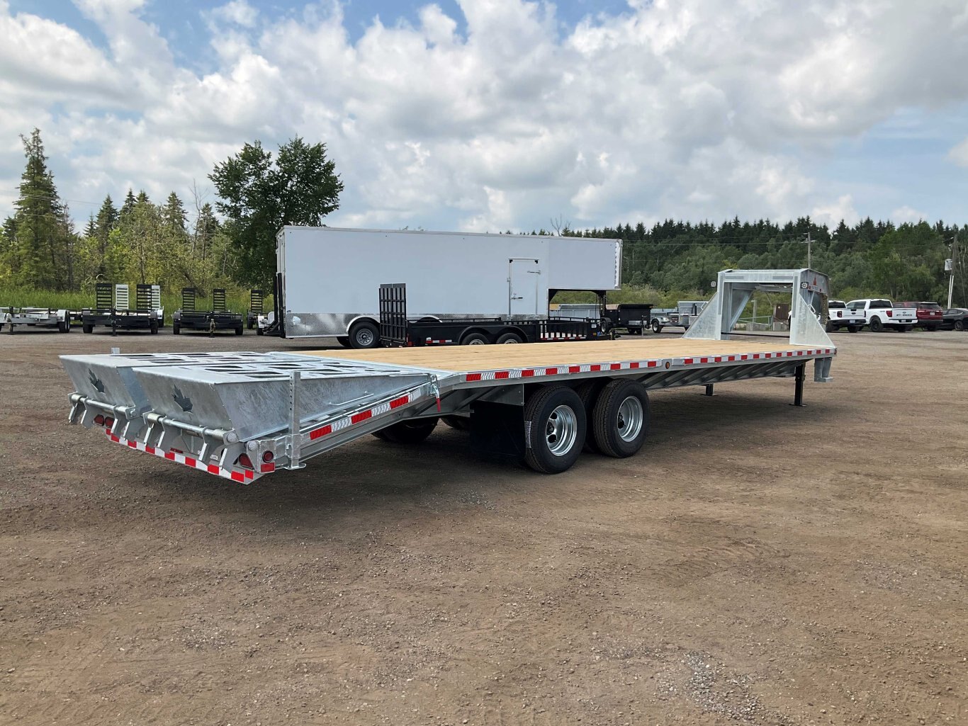 25,920LB GVWR, 2 12,000LB Axles with Oil Bath Hubs, Slipper Spring Suspension, 16 Inch Radial Tires, Electric Brakes on Both Axles, 2 12,000LB Drop Leg Jack, 5' Beaver Tail with Checker Plate Floor, 5' Spring Assisted Mega Wedge Ramps, 16 Inch Cross Members, Flex Resisting Bridge, 36 Inch Deck Height, Pressure Treated Wood Floor, 9' Gooseneck Length, Stake Pockets and Rub Rails, Side Steps on Each Side, Drivers Side Winch Track, Lockable Toolbox, Spare Tire Mount, Spare Tire and Galvanized Rim, LED Lighting, Sealed Harness, Rear Facing LED Load Lights, Galvanized
