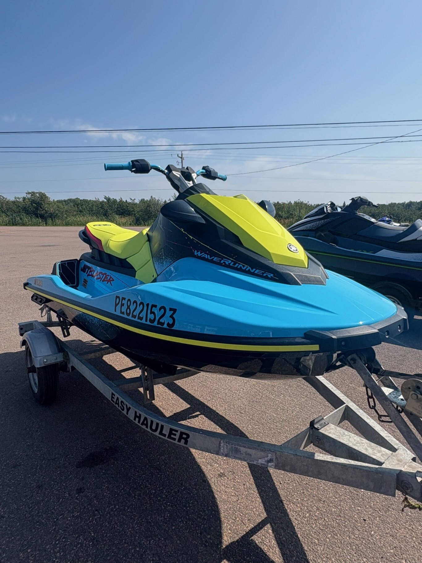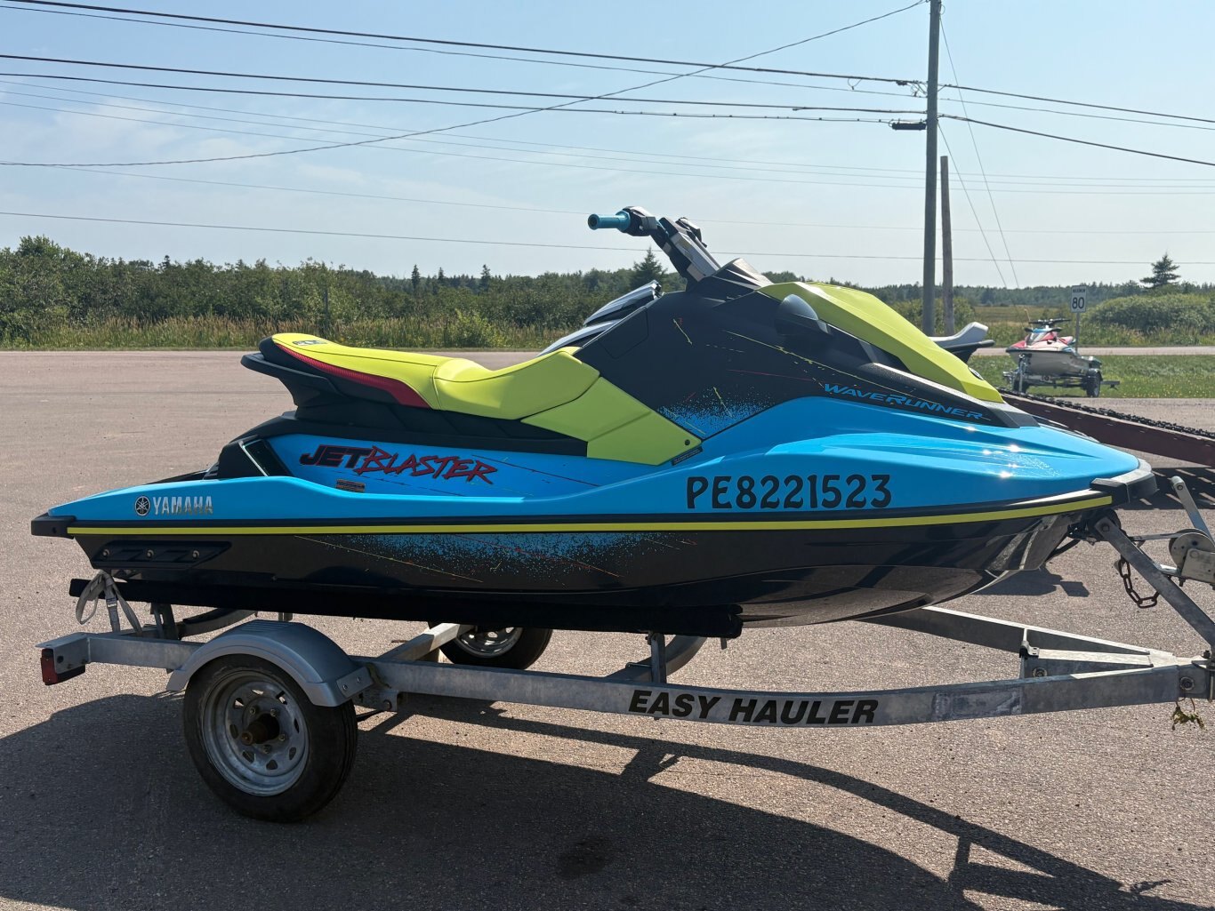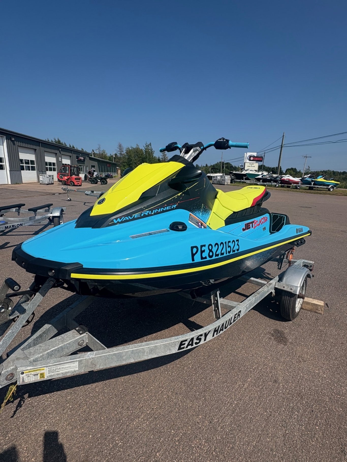 The 2022 Yamaha Jet Blaster has a 1049cc 3-cylinder 4-stroke engine, is 123.6 inches long, 44.5 inches wide, 46.5 inches high, weighs 549 lbs (249 kg), and a fuel capacity of 13.2 US gallons (50L). The JetBlaster also includes Yamaha's RiDE system for intuitive control and a custom-tuned electric trim for enhanced maneuverability.