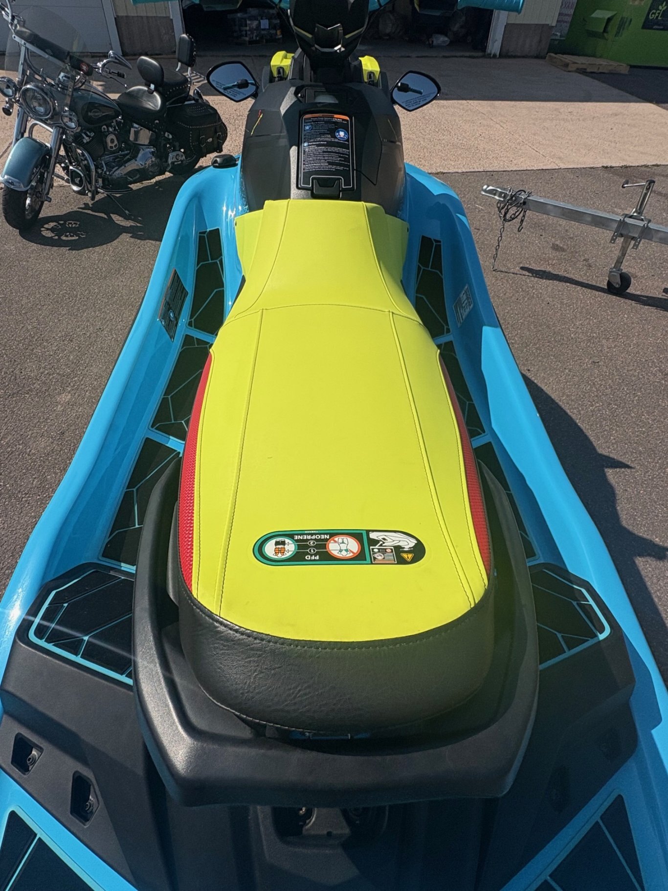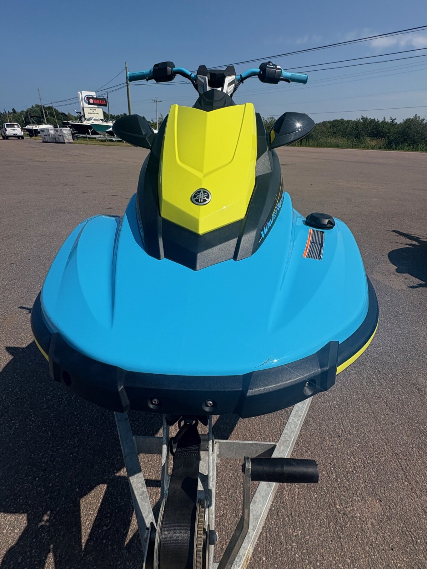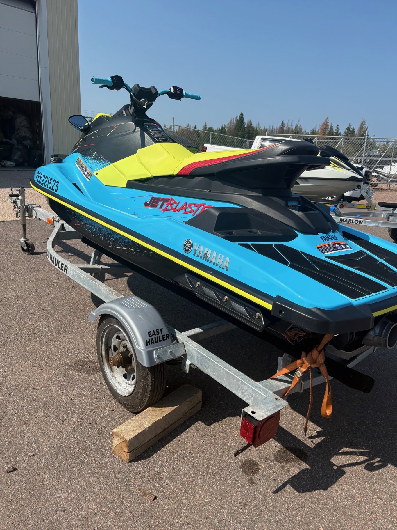 The 2022 Yamaha Jet Blaster has a 1049cc 3-cylinder 4-stroke engine, is 123.6 inches long, 44.5 inches wide, 46.5 inches high, weighs 549 lbs (249 kg), and a fuel capacity of 13.2 US gallons (50L). The JetBlaster also includes Yamaha's RiDE system for intuitive control and a custom-tuned electric trim for enhanced maneuverability.