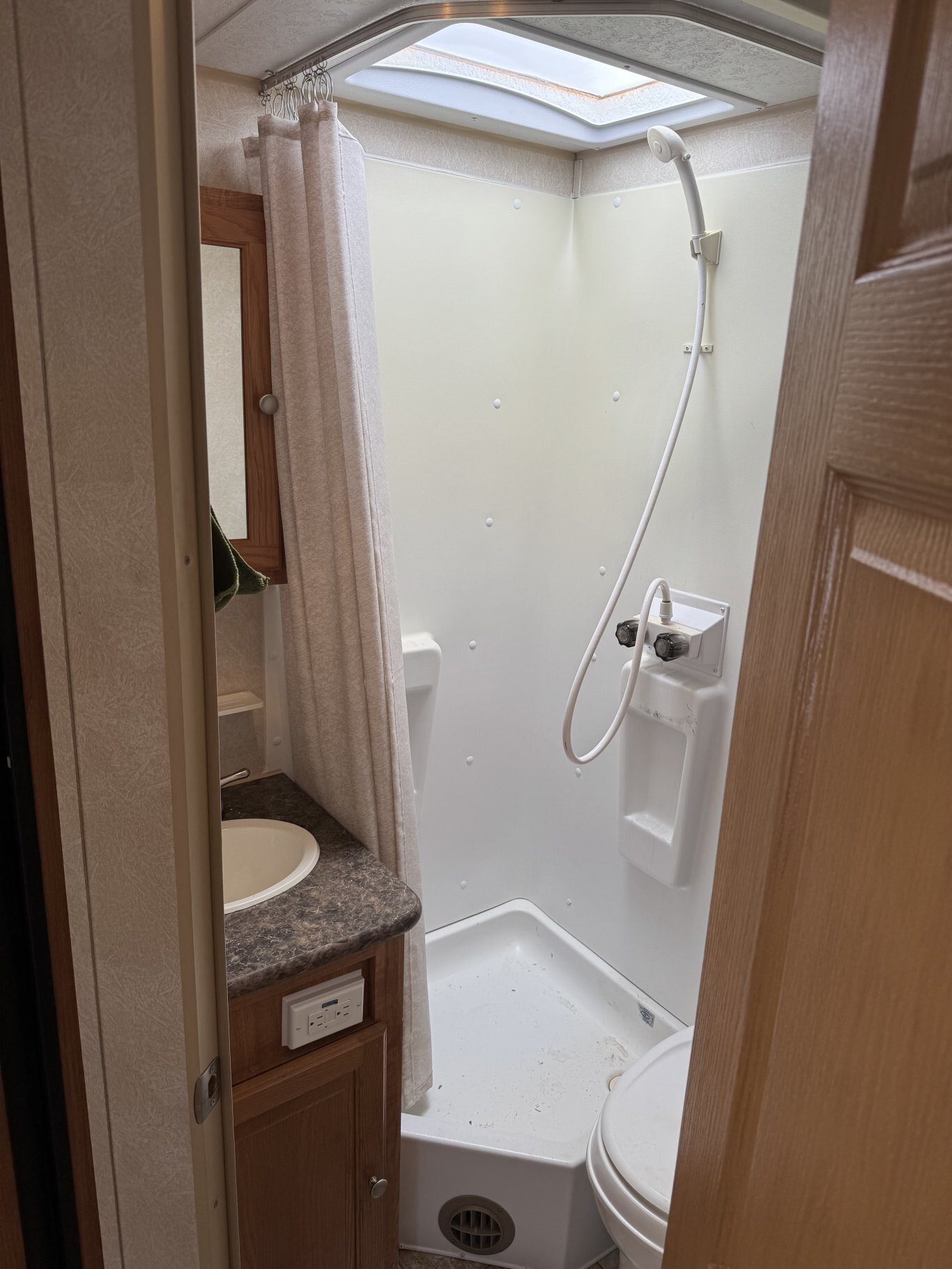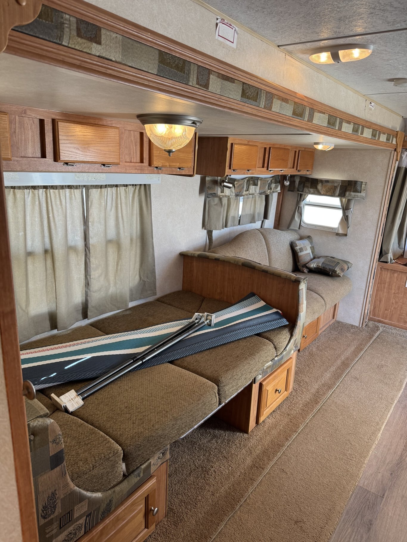 We’re excited for our 2009 Forest River travel trailer! Equipped with 2 queen-sized bed along with a dinette, bathroom, induction stove, fridge, microwave, heater and AC, this rig is lightweight for easy towing while having all the amenities you would need.