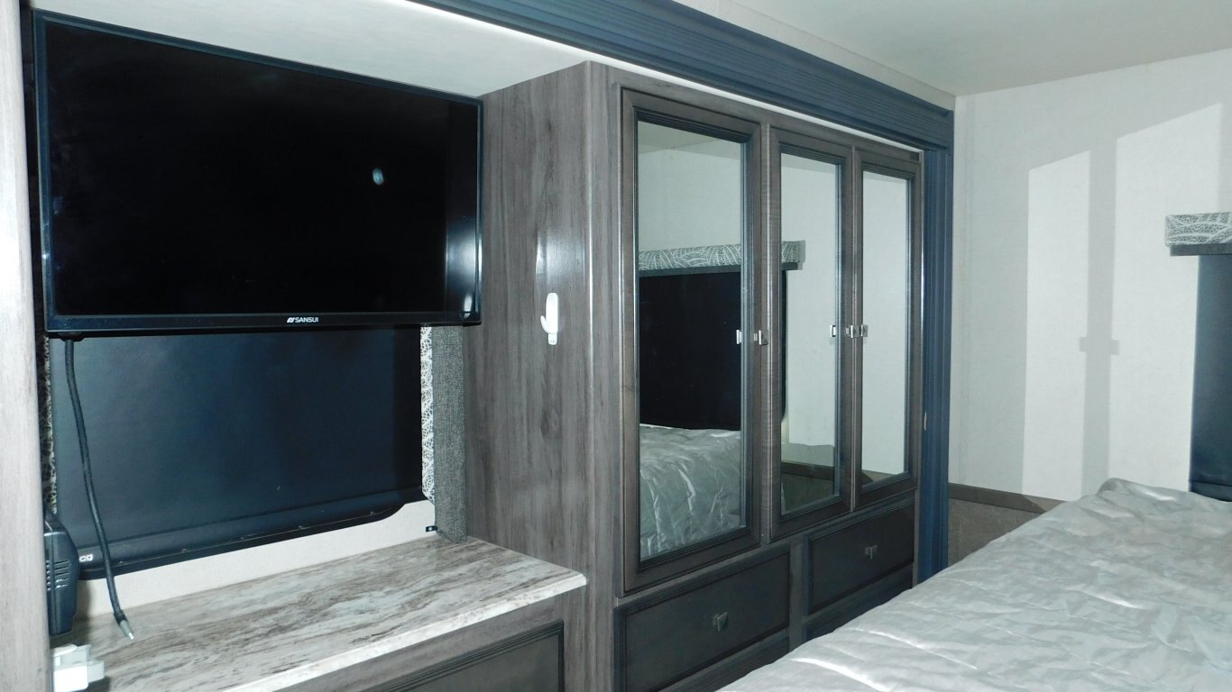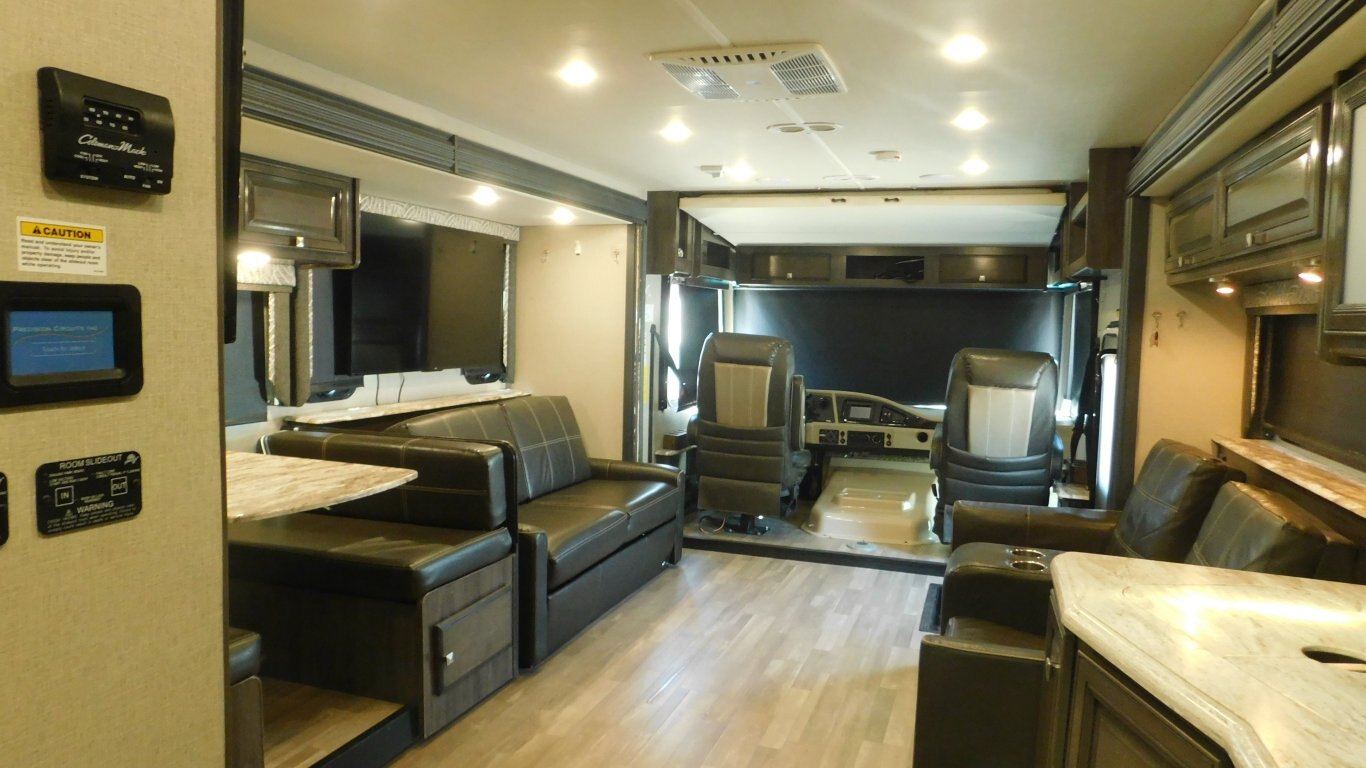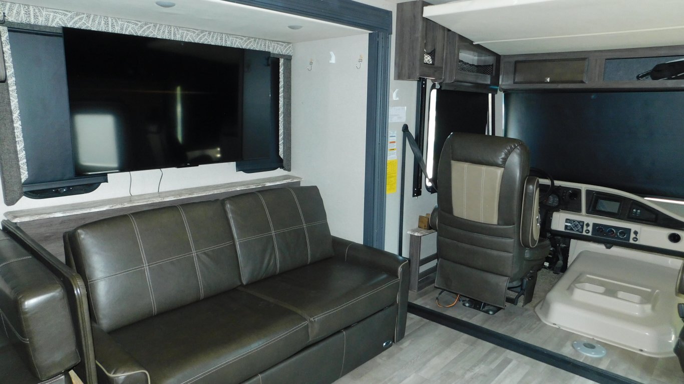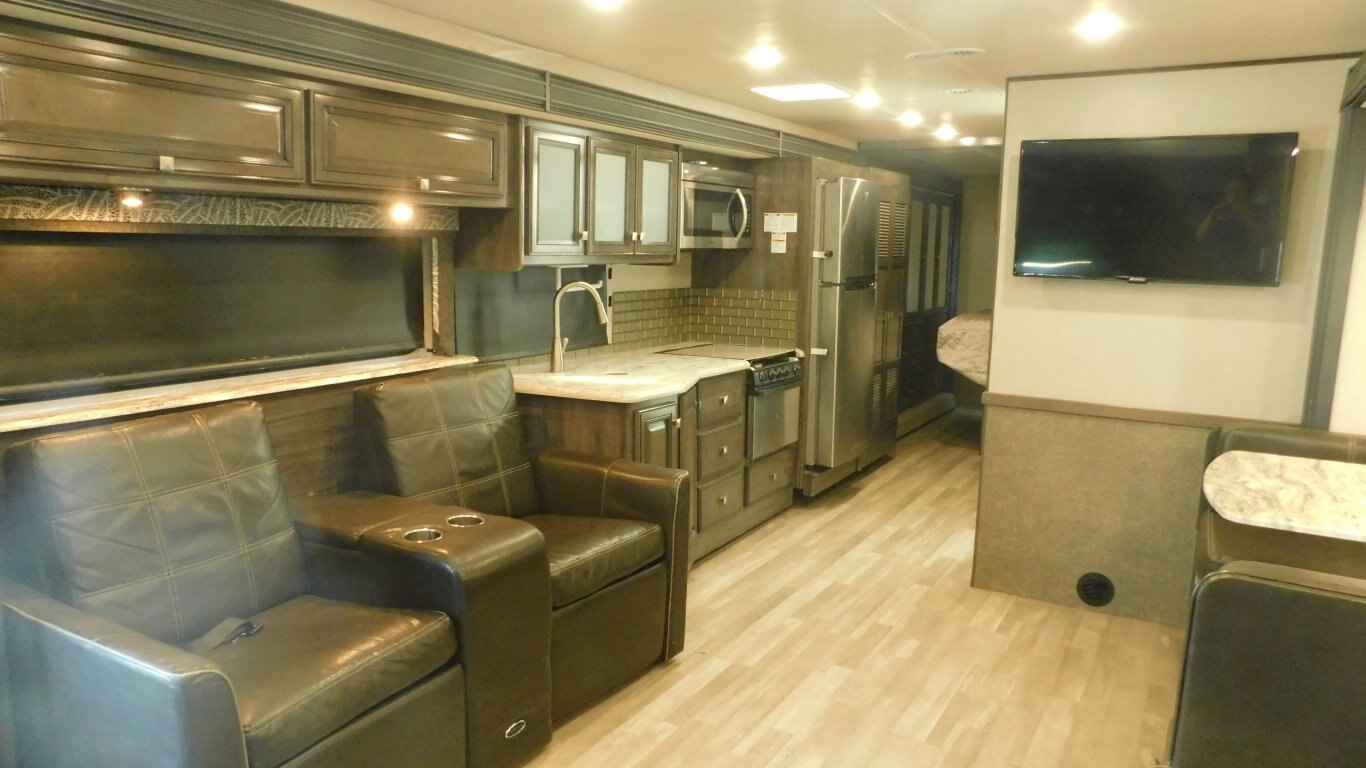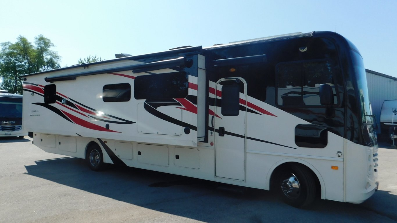 This 2019 Holiday Rambler 35R is very clean with a great layout. It has 2 slides, and is equipped with the following options: -CHASSIS: Ford -ENGINE: Triton V10 -TRANSMISSION: 6 Speed Automatic -FUEL CAPACITY:(gal) 80 -HITCH RATING:(lbs) 8,000 -Tires DOT 26/18 -PROPANE TANK:(gal) 14 -GENERATOR: ONAN Quiet 5.5KW (593.3 hrs) - Length - 36 ft. - Width - 8.5 ft. - Height - 12.5 ft. - 2 Power Slideouts - Front & Rear Power Levelling Jacks - 18 ft. Power Awning - 13,500 BTU Air Conditioner - 34,000 BTU Furnace - Water Heater - Plenty of Basement Storage -Overhead power bunk -Back up/Side view cameras -Outside 50\'\' TV -Outside shower - Convertible Dinette -Convertible sofa - 3 Burner Stove - 2 Door Refrigerator/Freezer - Microwave Oven - 32\'\' LCD TV in Master -50\'\' LCD TV and 39\'\' LCD TV in Living room - Bright Shower w/ Skylight - King Bed with storage underneath in Master - Large Wardrobe in Master - Plenty of Interior Storage -Washer/Dryer Combo -Roof Ladder - etc. -COME BY AND SEE IT TODAY!